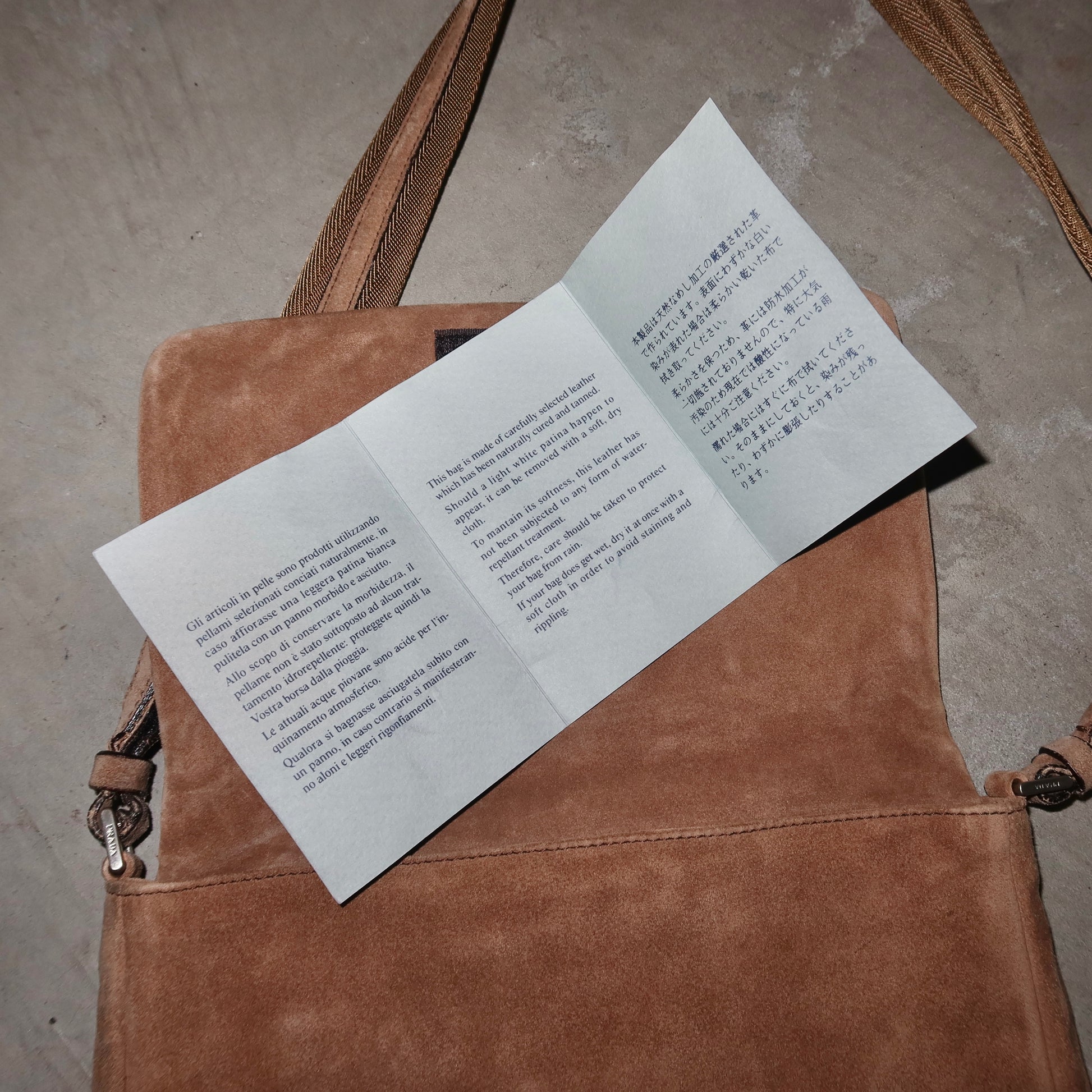 Very good vintage condition. Overall gentle wear to the suede and base of straps, as pictured, and some staining to the strap (6th pic - shows up worse under the flash - took me a while to notice this in person). The strap could be reversed to show the underside if you prefer.