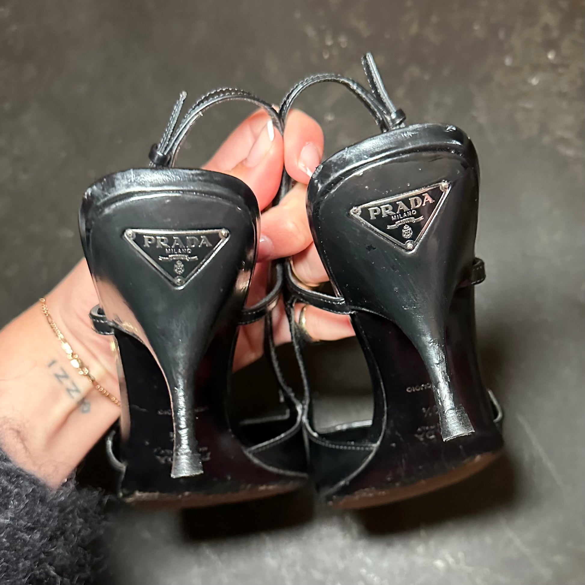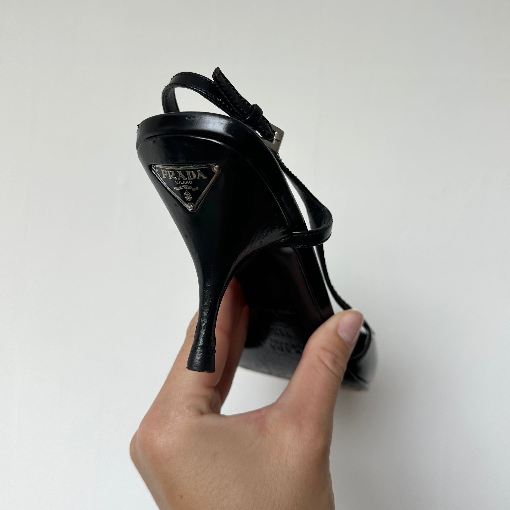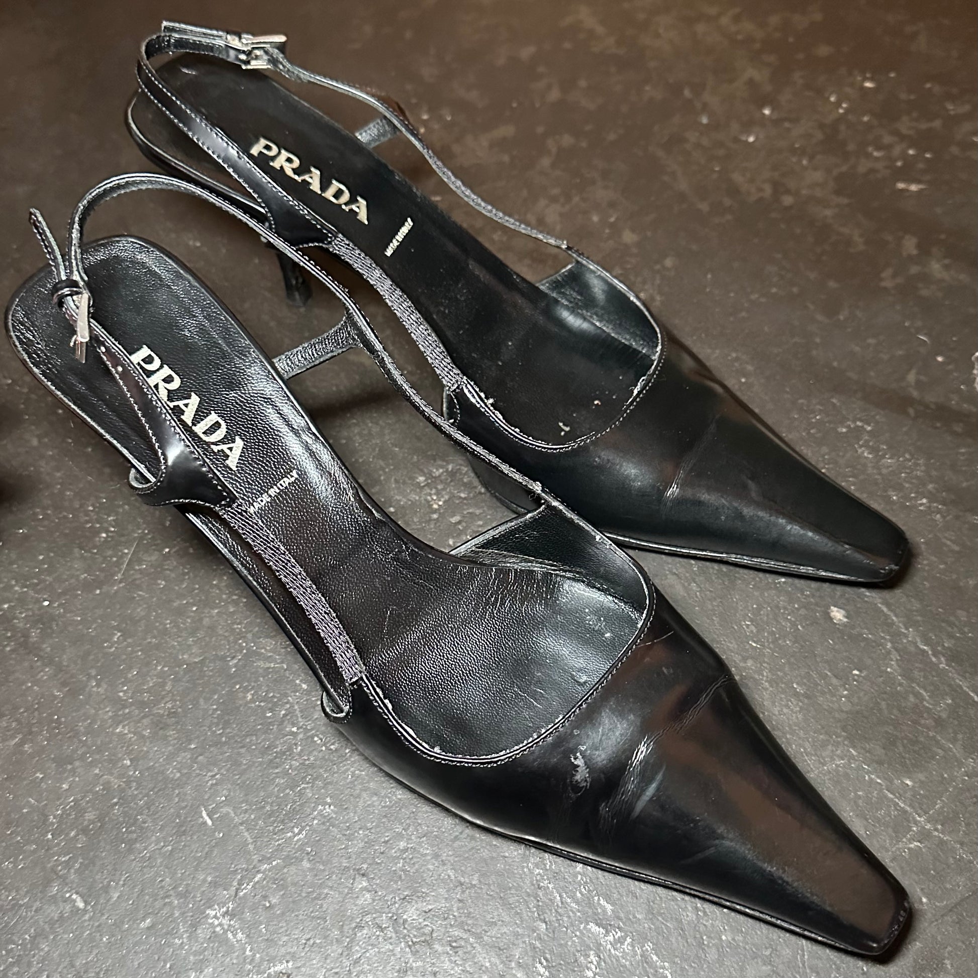 Beautiful rare black leather Prada sling-back mules with Prada plaque detail on the back of the heels.