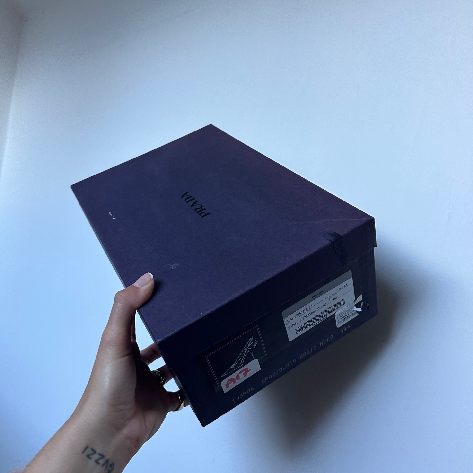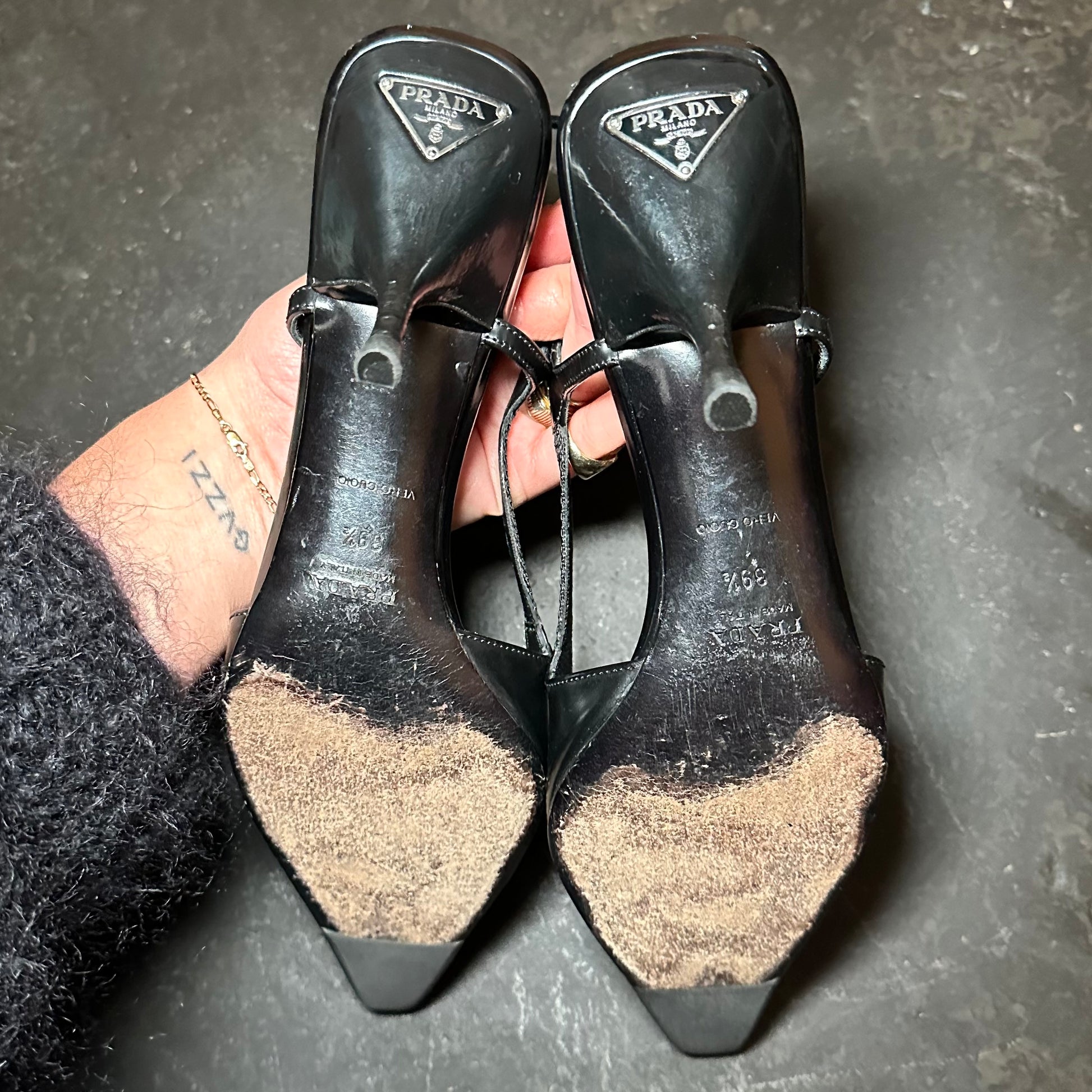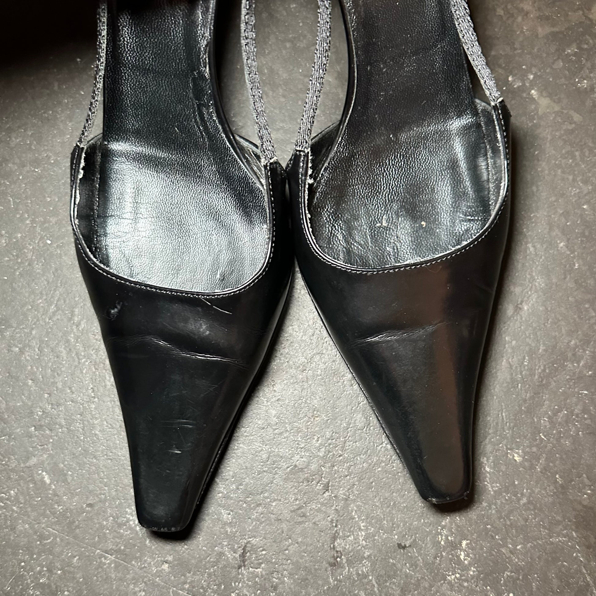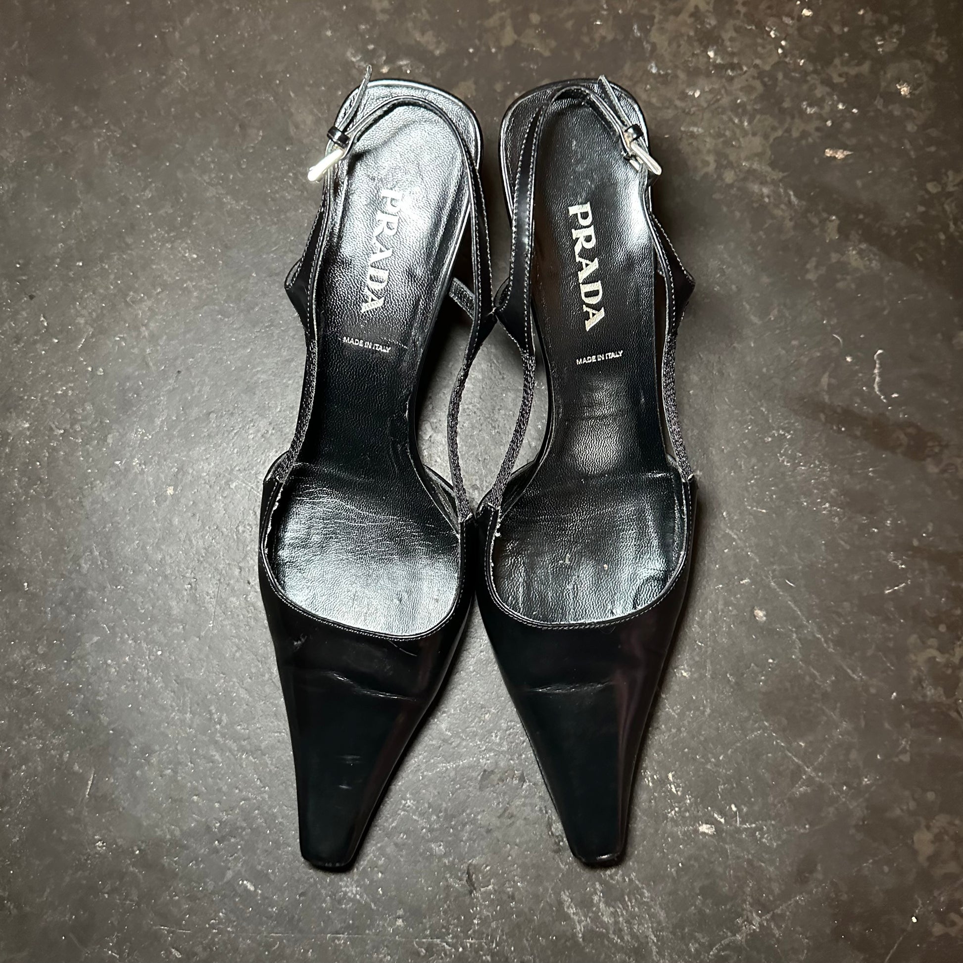 Beautiful rare black leather Prada sling-back mules with Prada plaque detail on the back of the heels.