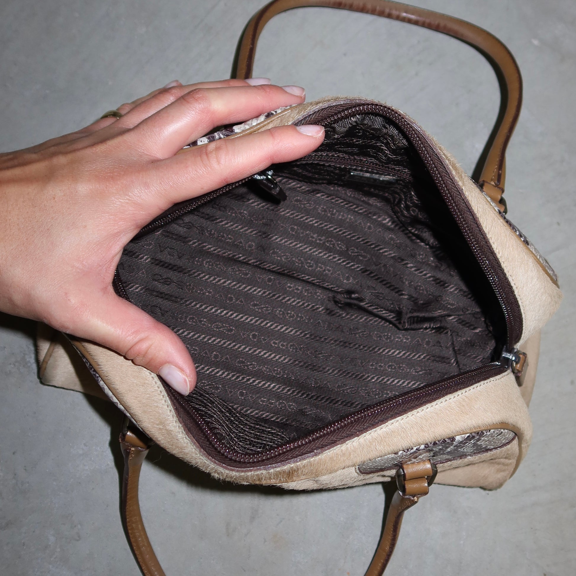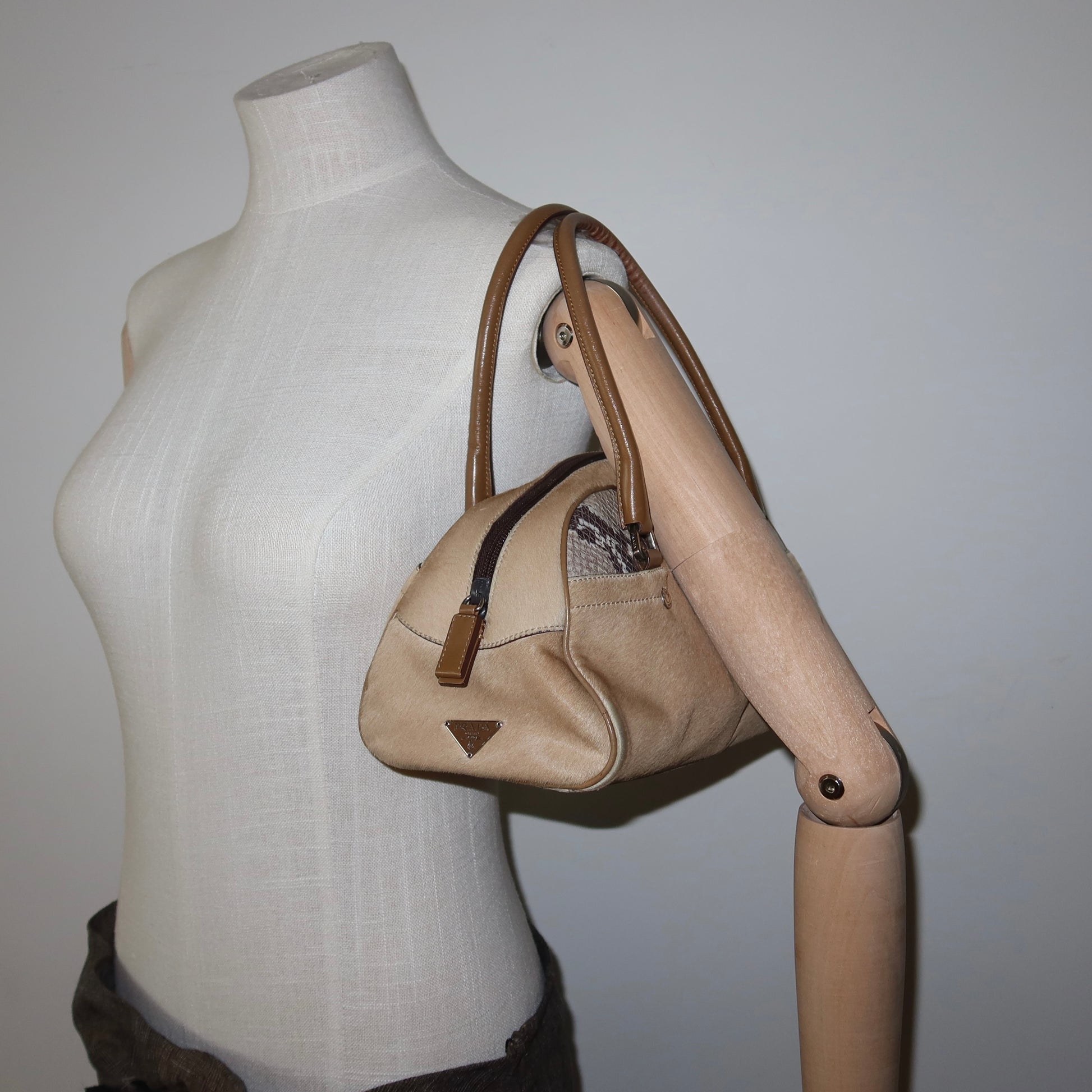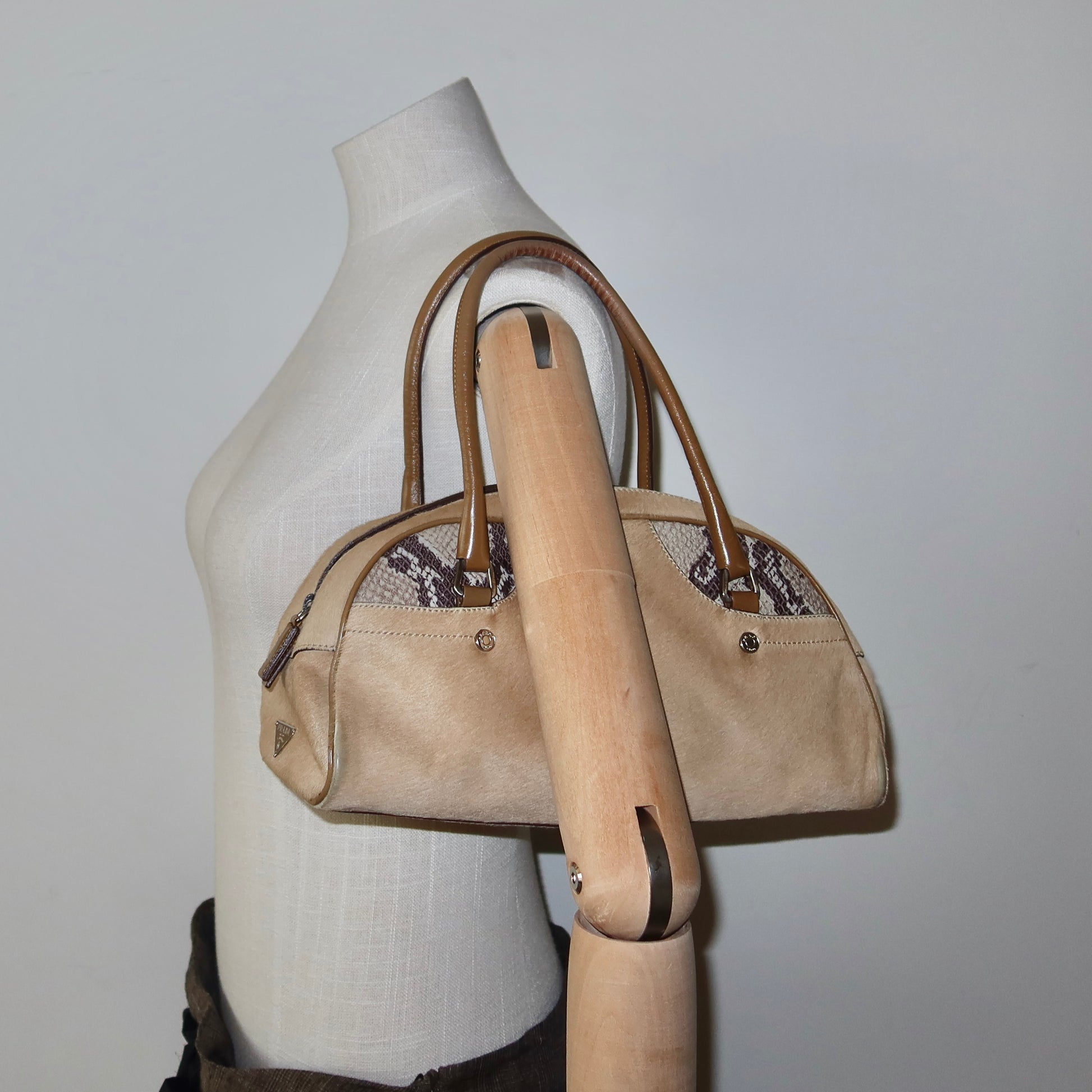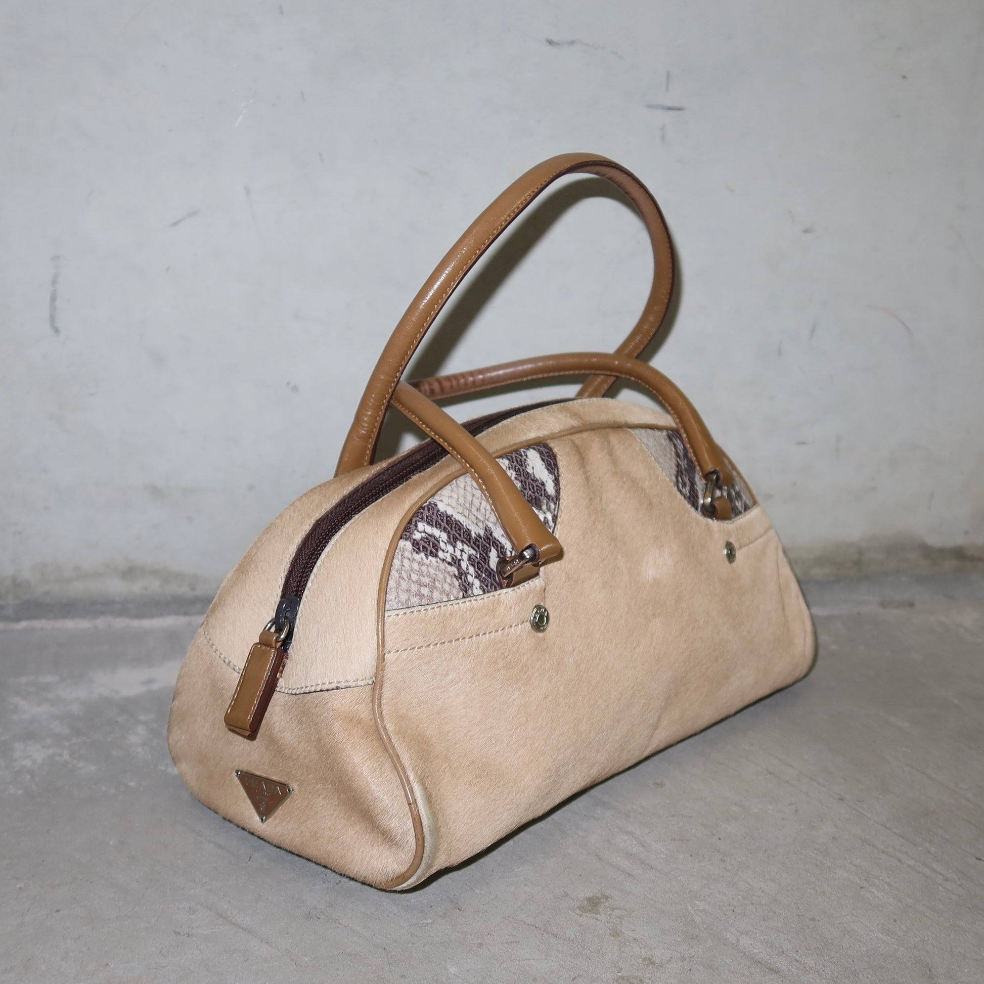 Gorgeous and rare beige cowhide bowling bag by Prada with python leather accents. Fits as a shoulder bag but is quite snug on the shoulder. I would recommend using as a handbag to minimise rubbing to the cowhide.