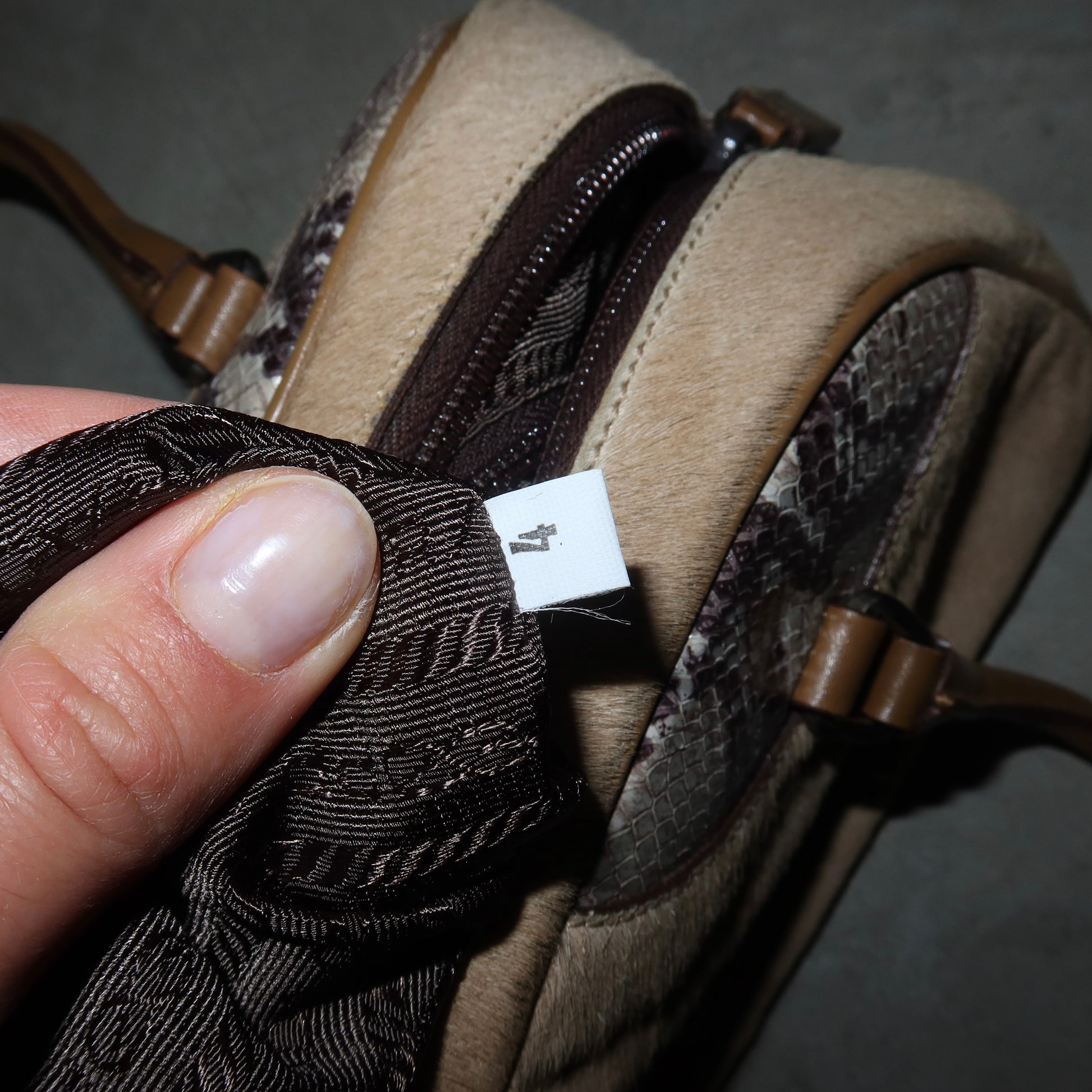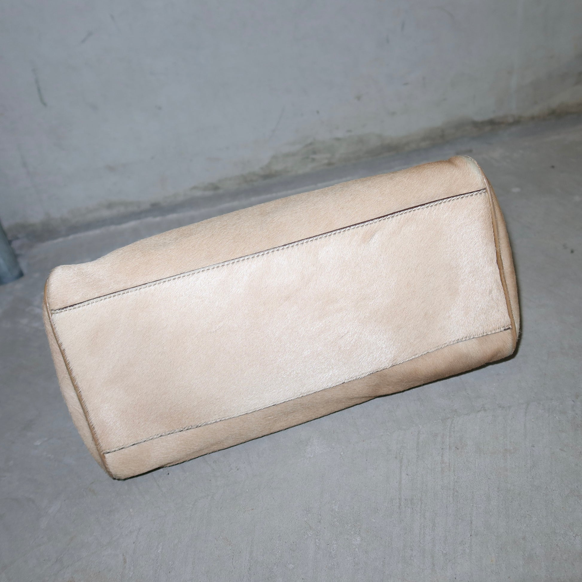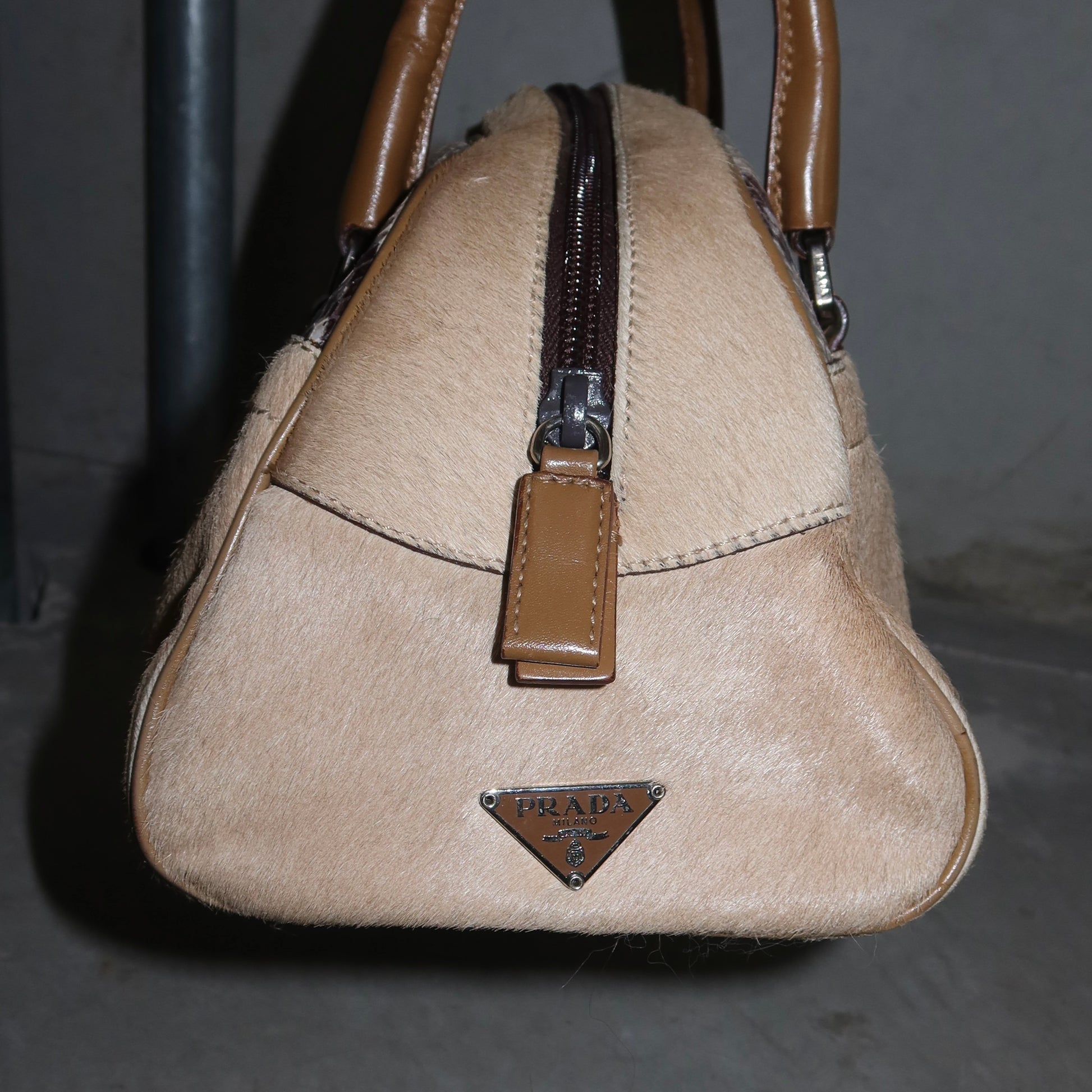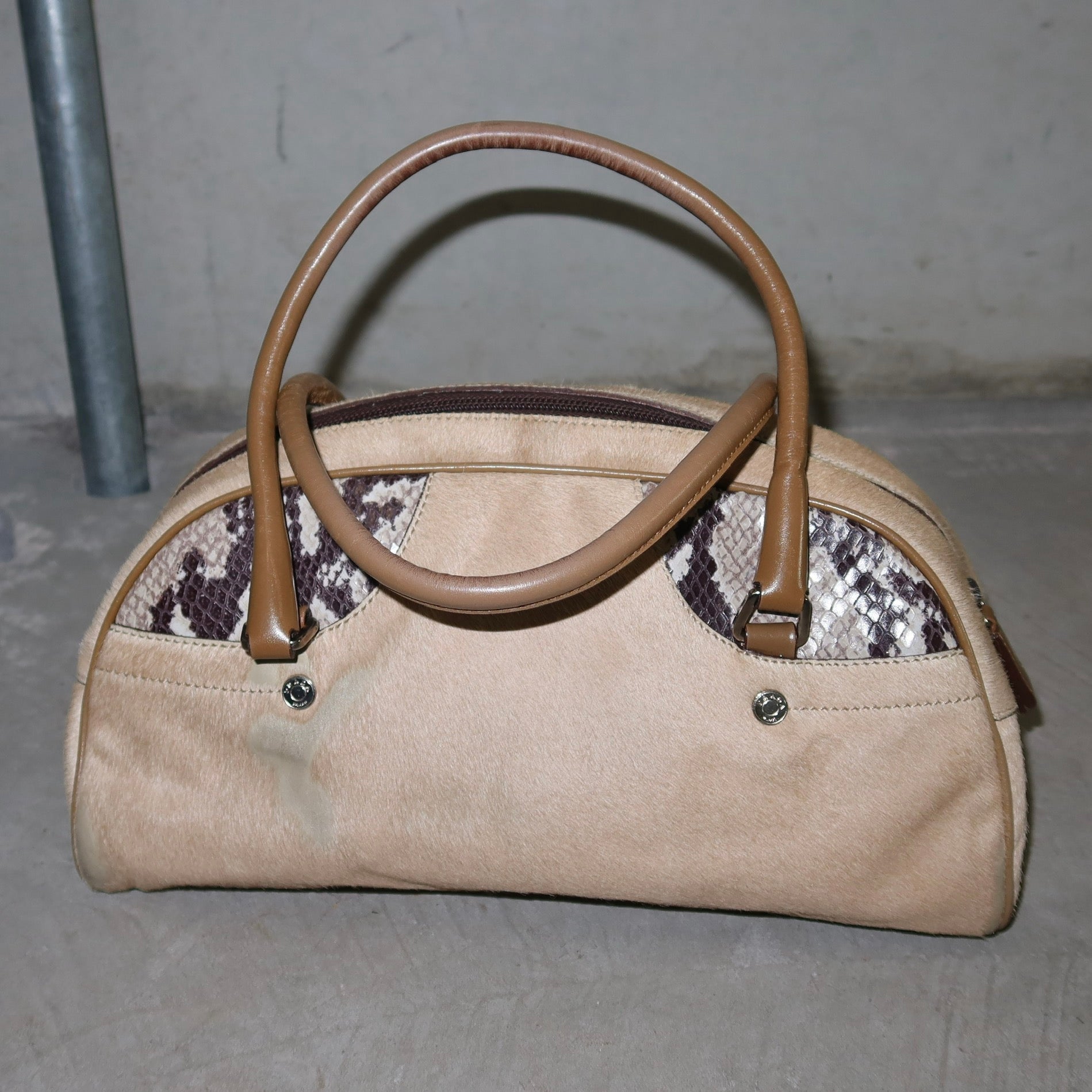 Gorgeous and rare beige cowhide bowling bag by Prada with python leather accents. Fits as a shoulder bag but is quite snug on the shoulder. I would recommend using as a handbag to minimise rubbing to the cowhide.