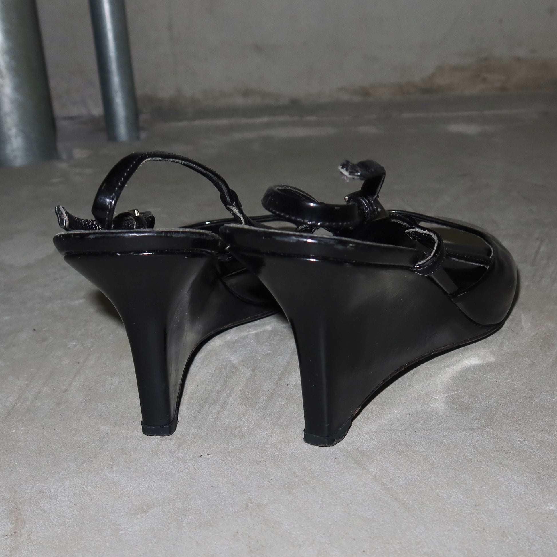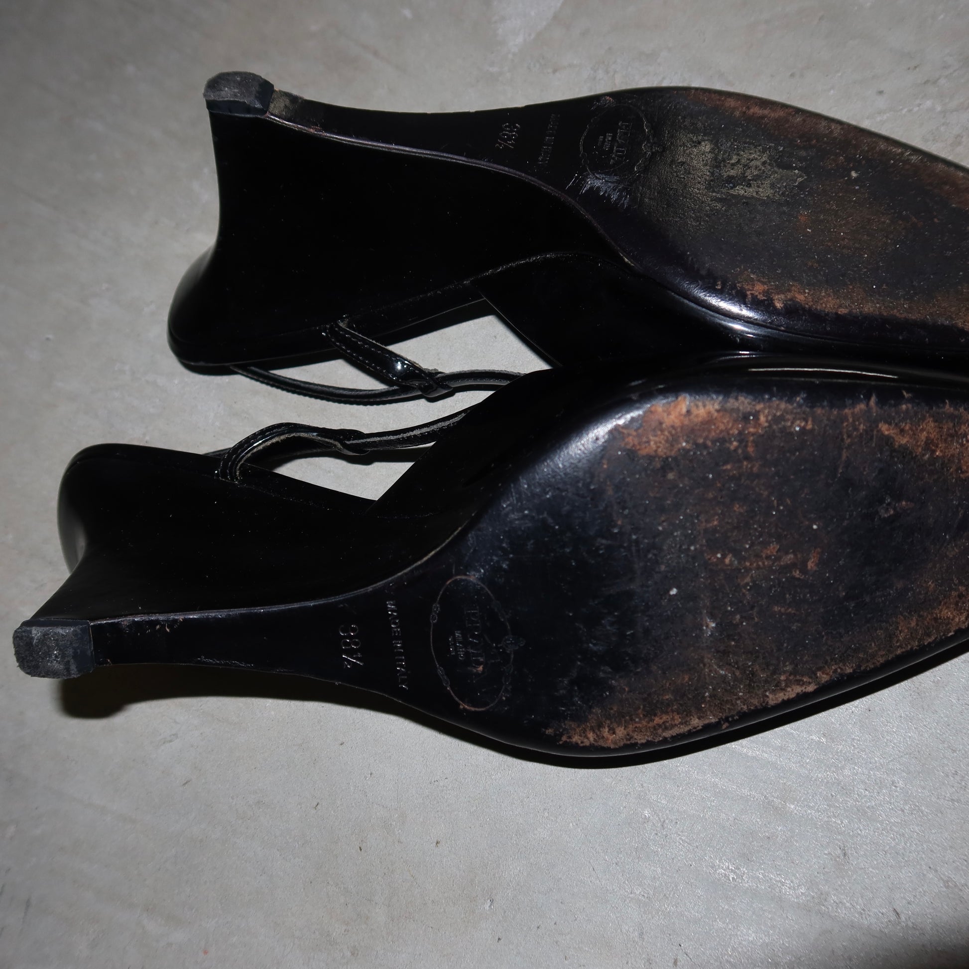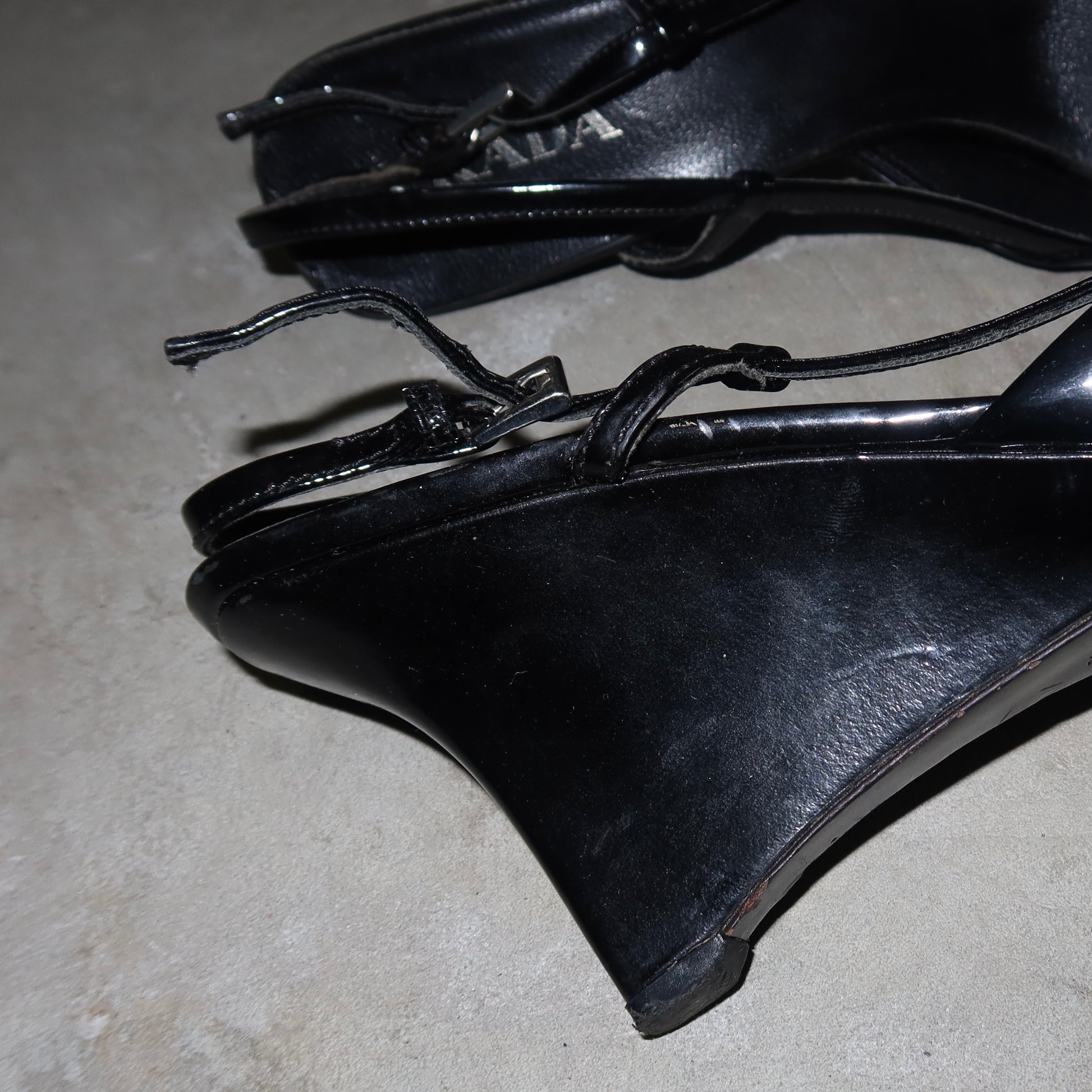 The cutest black patent wedges by Prada with a peep toe and sling back.