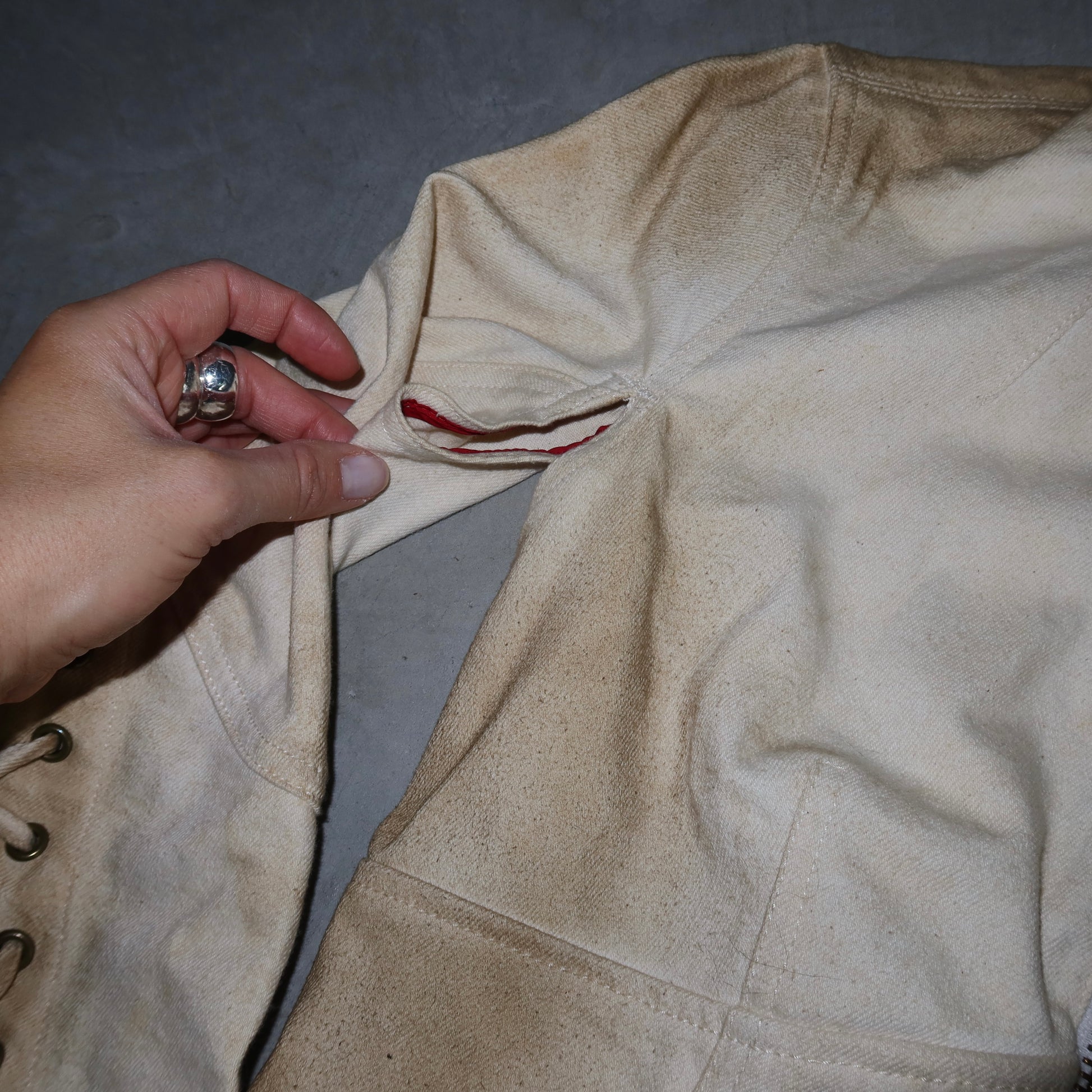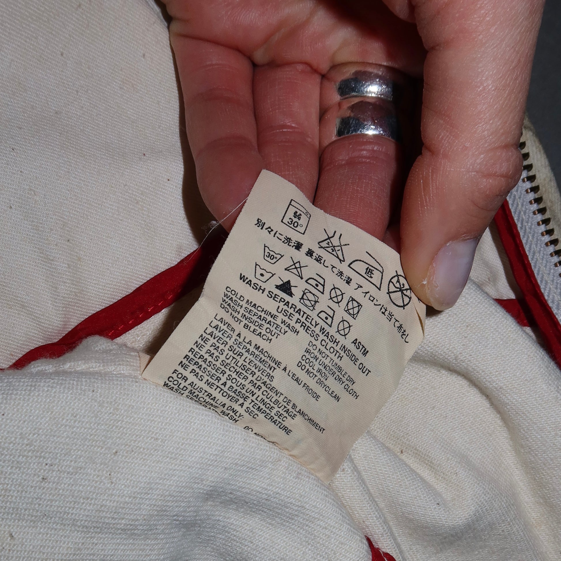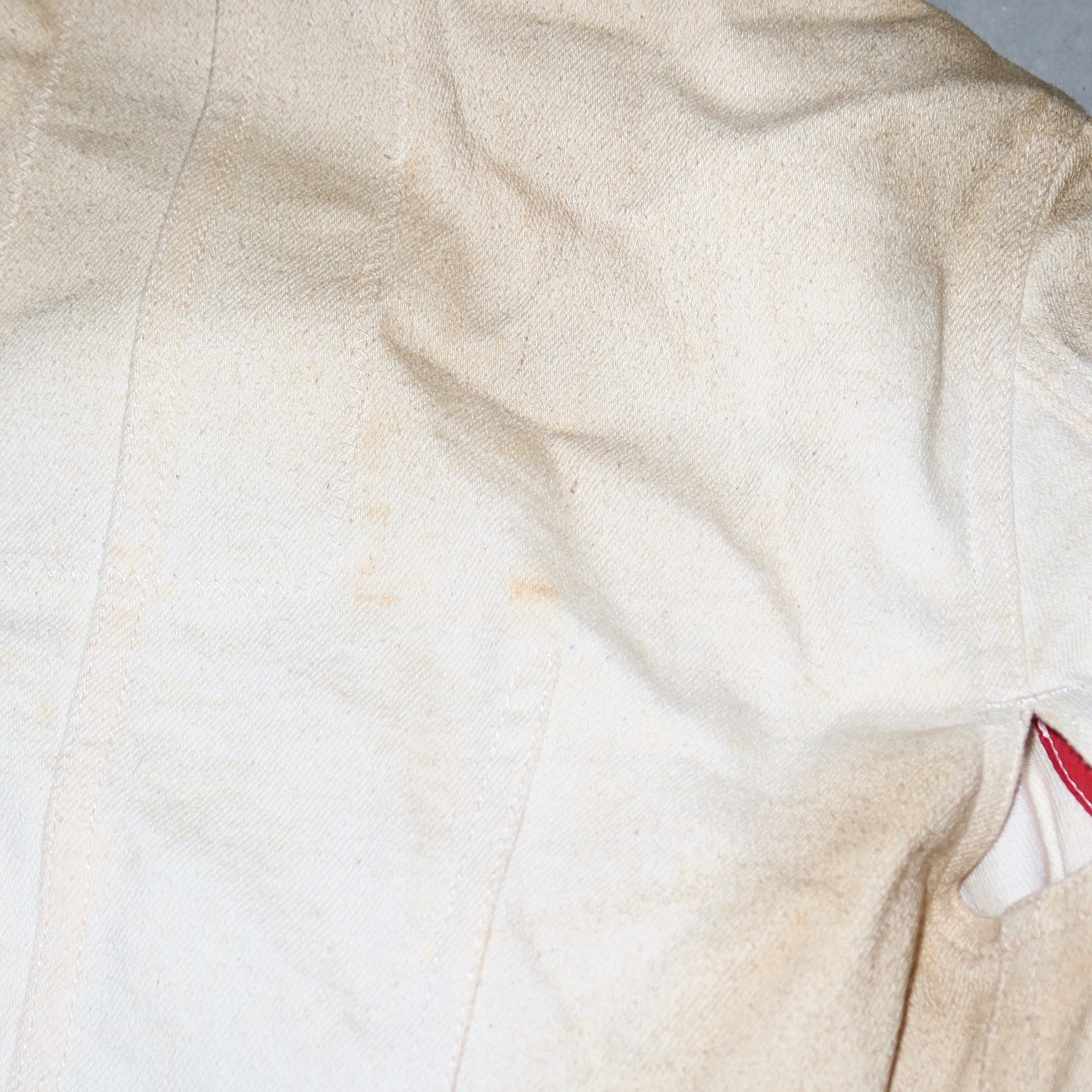 Good vintage condition. Some light pilling and a stain on the back, as pictured. The zipper detail has come off but could possibly be reattached somehow. I will include this in the jacket pocket when shipping.