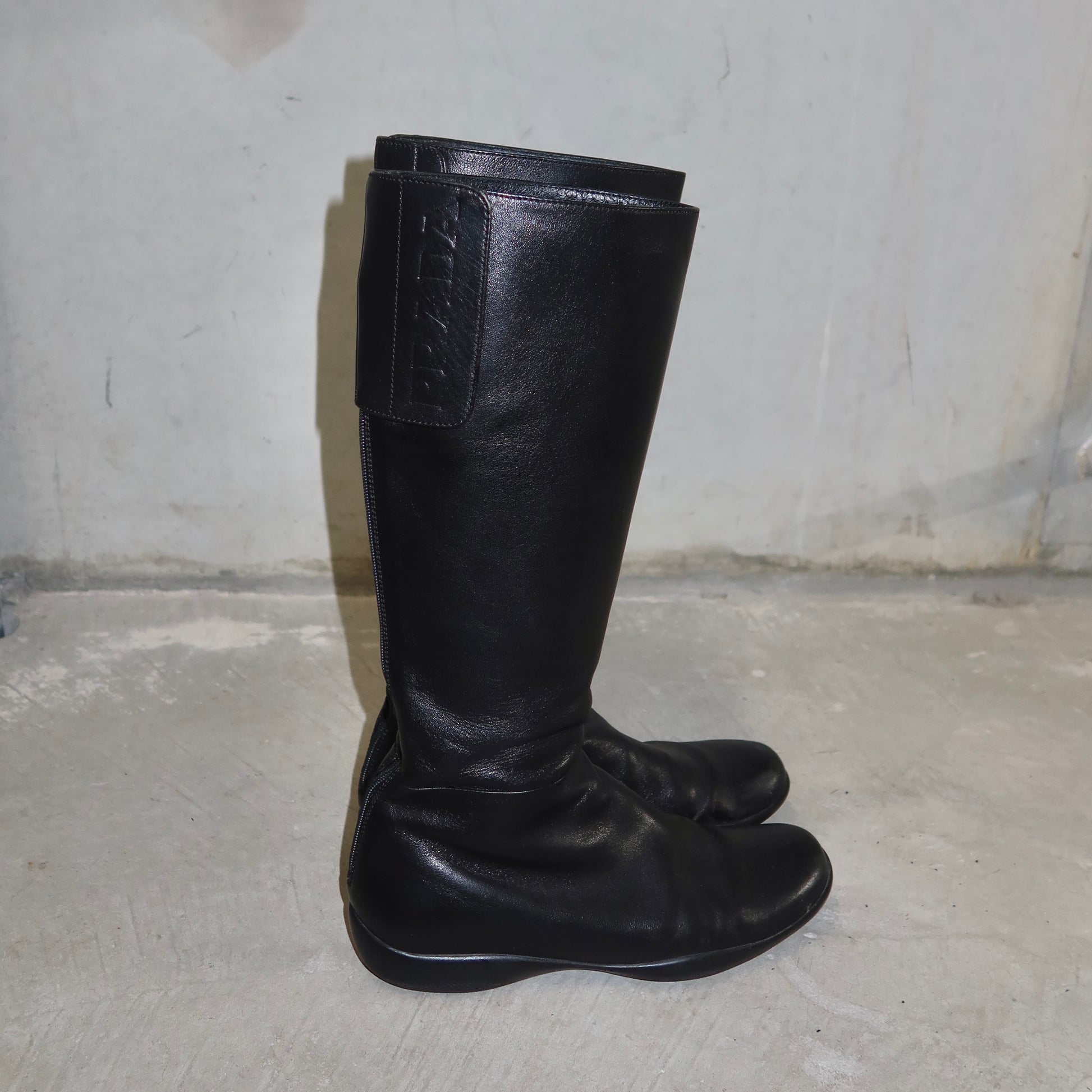 Gorgeous iconic Prada Sport black leather boots with PRADA embossed straps. This pair have a more squared toe.