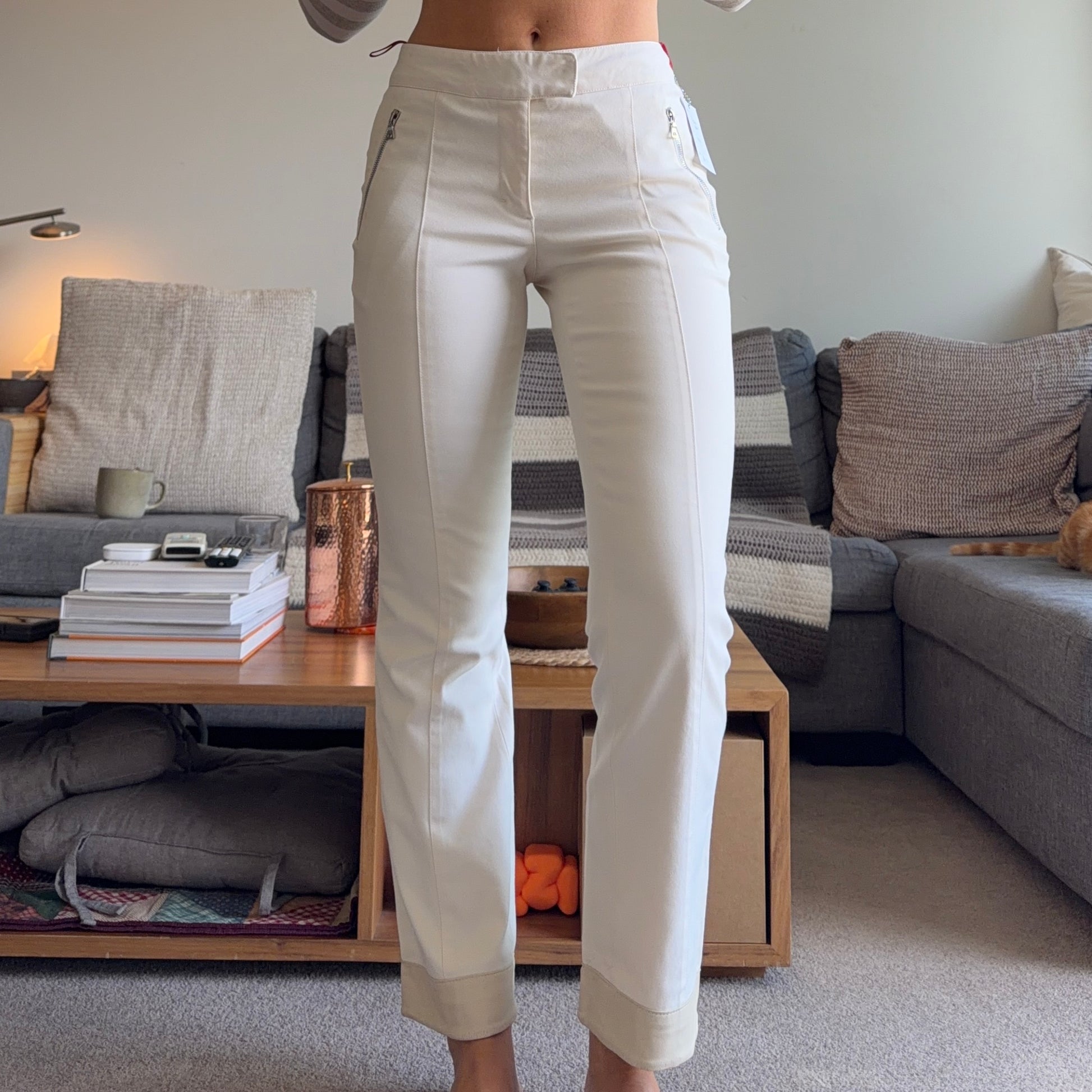 The sleekest white straight leg pants from Prada Sport. High waisted. Super flattering on.