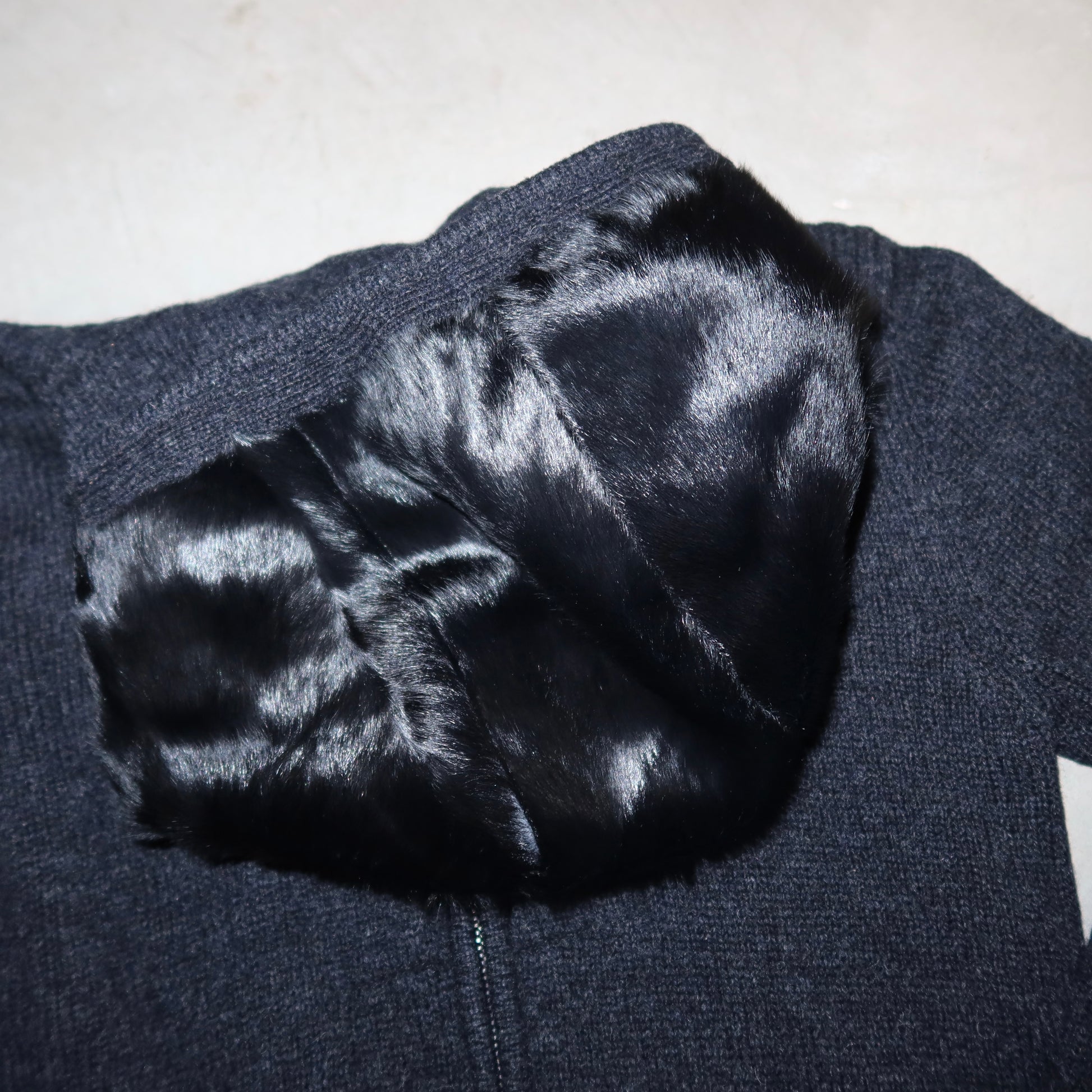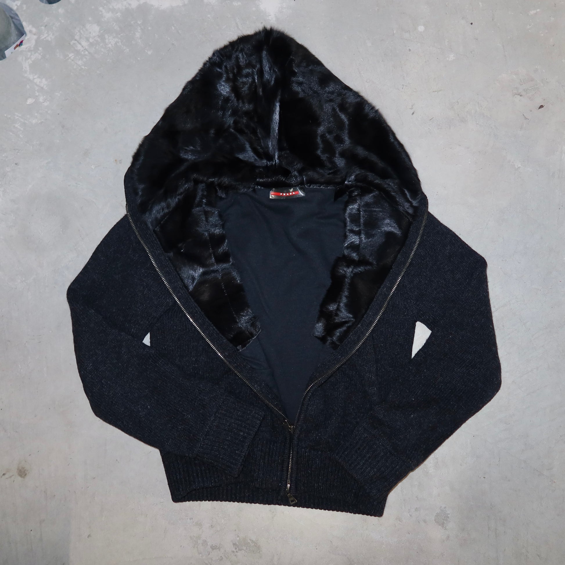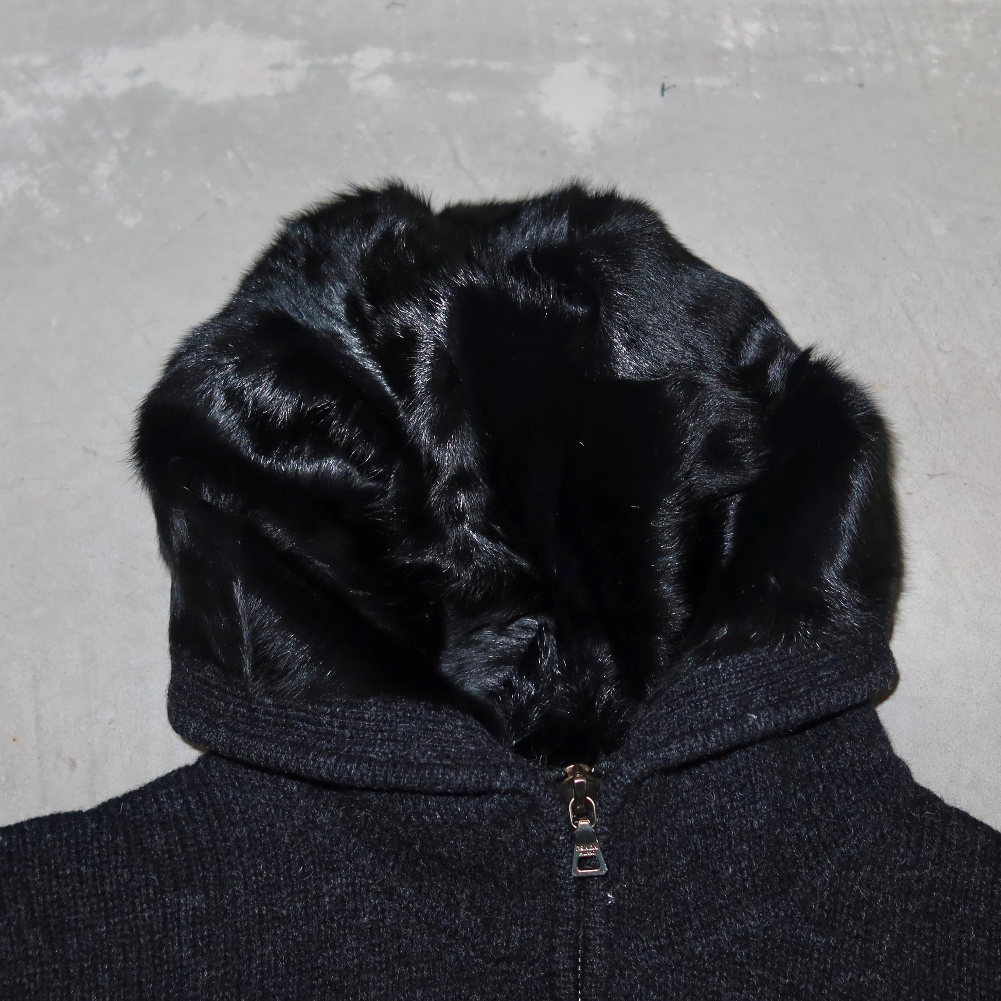 Rare dark grey wool zip up hoodie by Prada Sport with black goat fur lined hood. 3/4 sleeves.