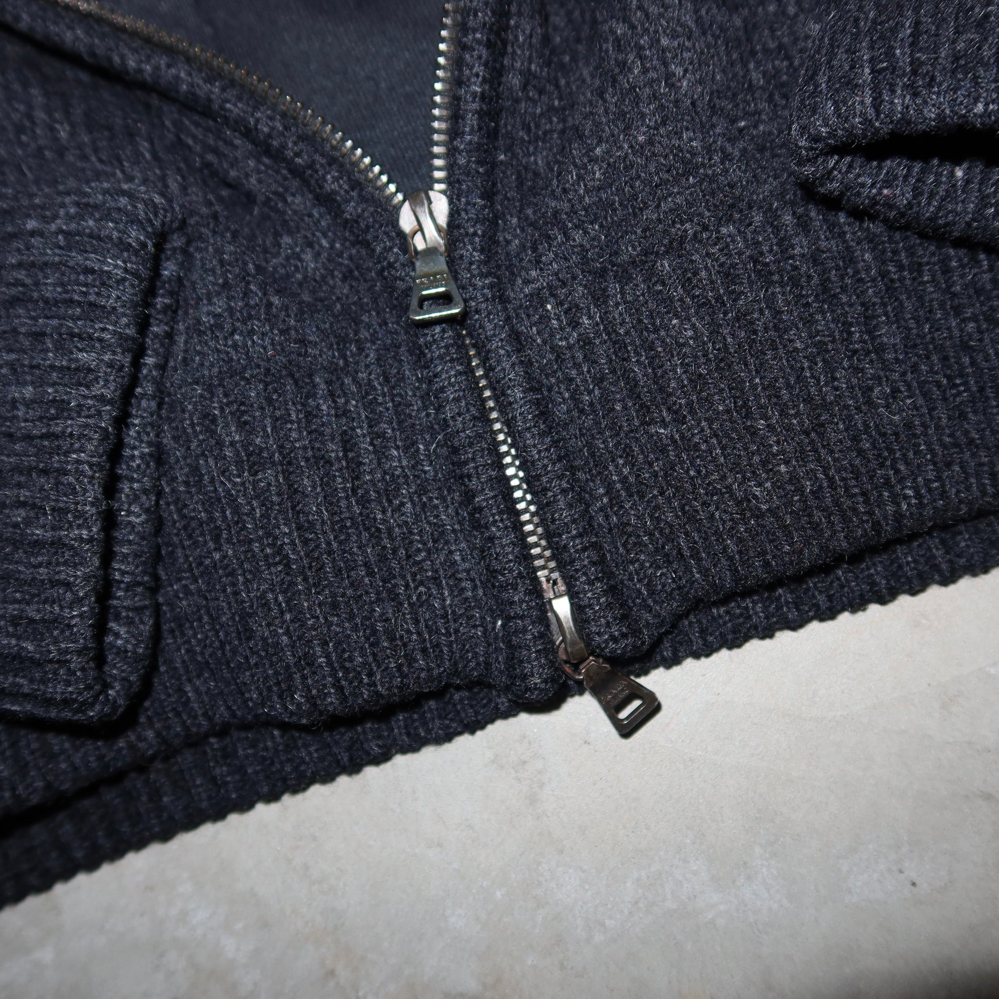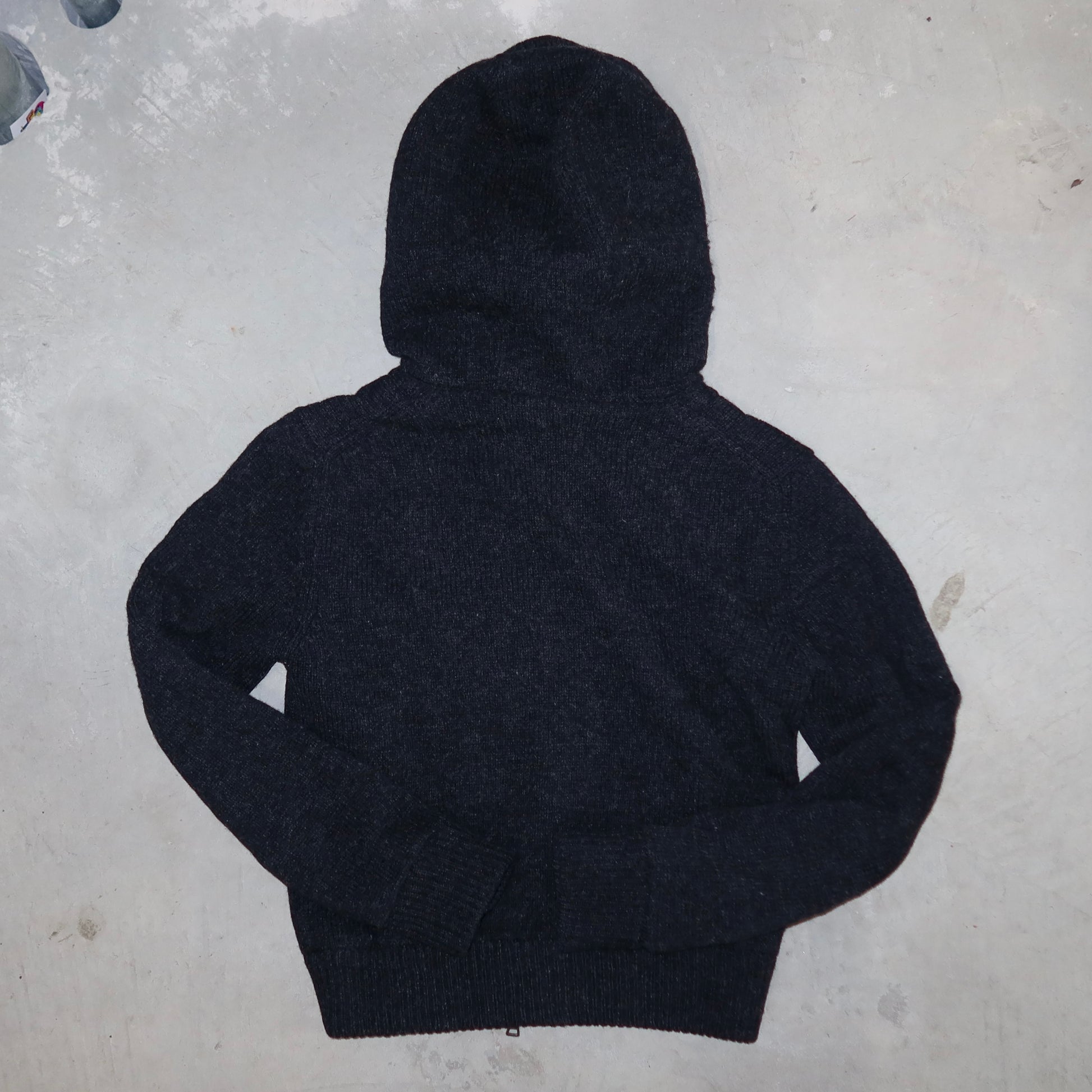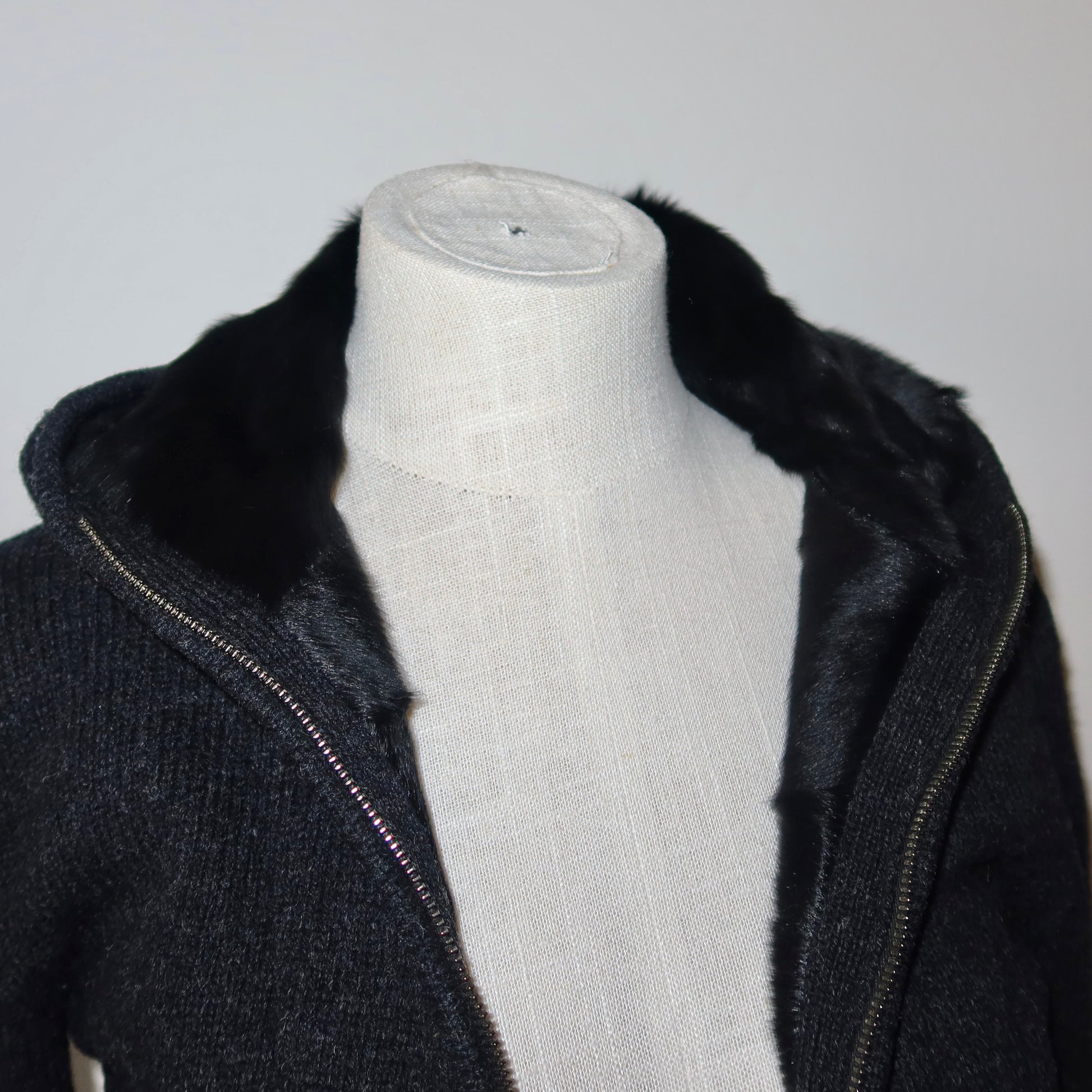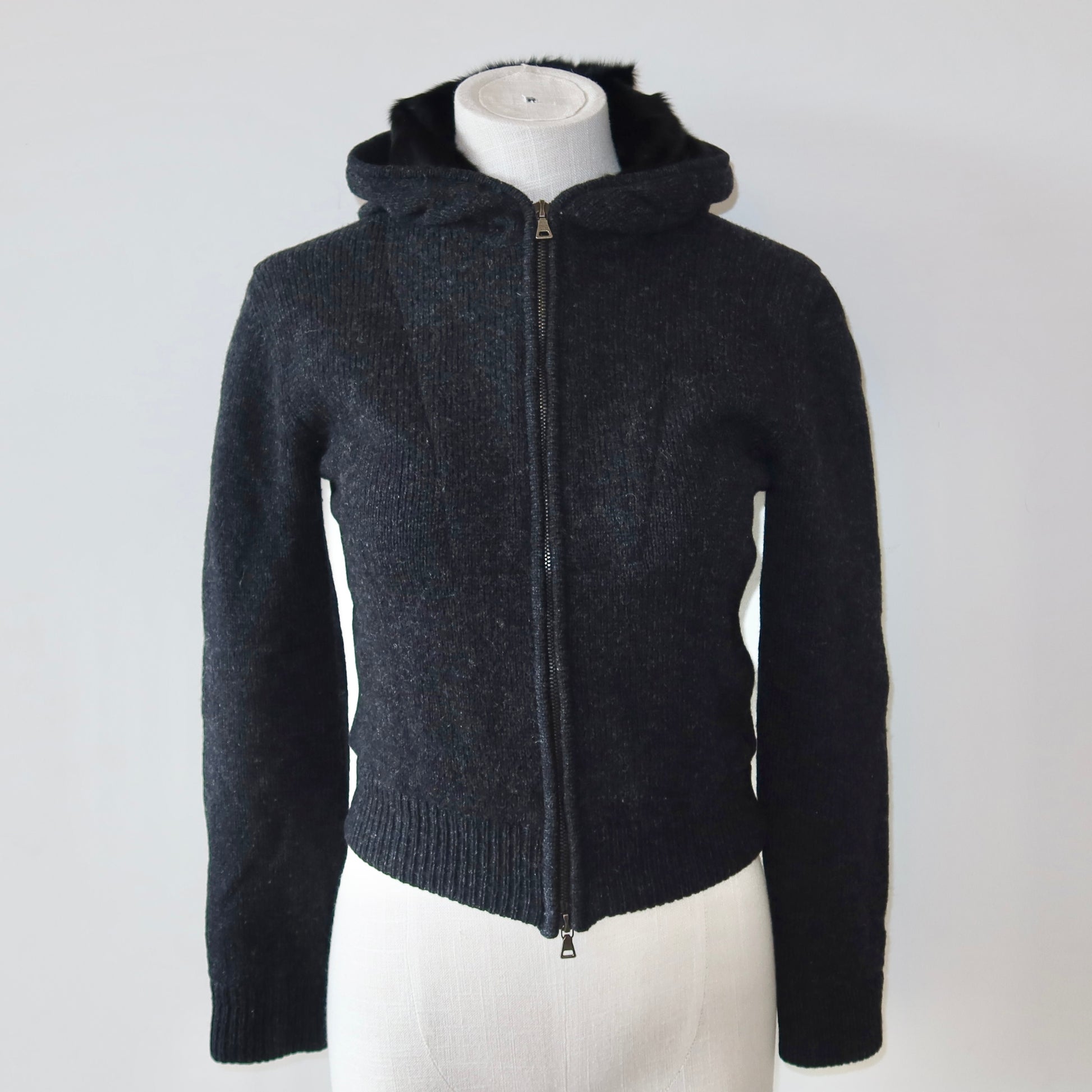 Rare dark grey wool zip up hoodie by Prada Sport with black goat fur lined hood. 3/4 sleeves.