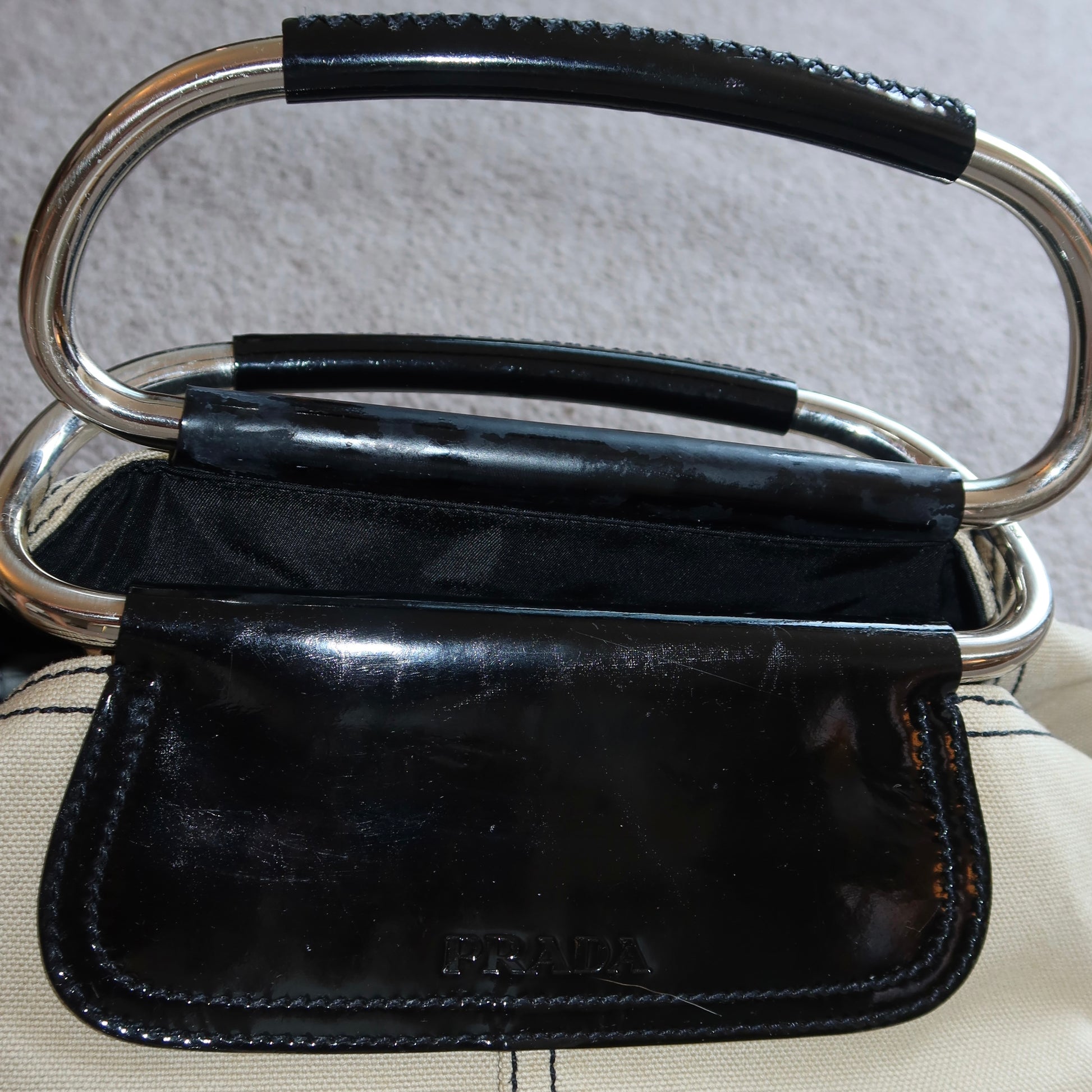 Beautiful and iconic Prada SS2003 canvas top handle bag with black patent leather trims. These metal ring handle bags are a rightfully sought after design from one of Prada's most iconic collections. Comes with original card.