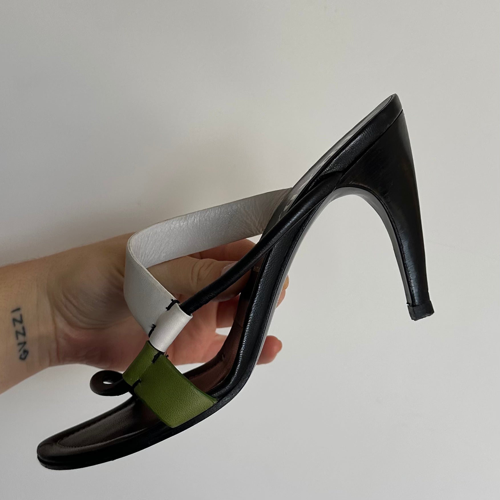 Gorgeous Prada heels with white and green leather details. Iconic outward curved heel.