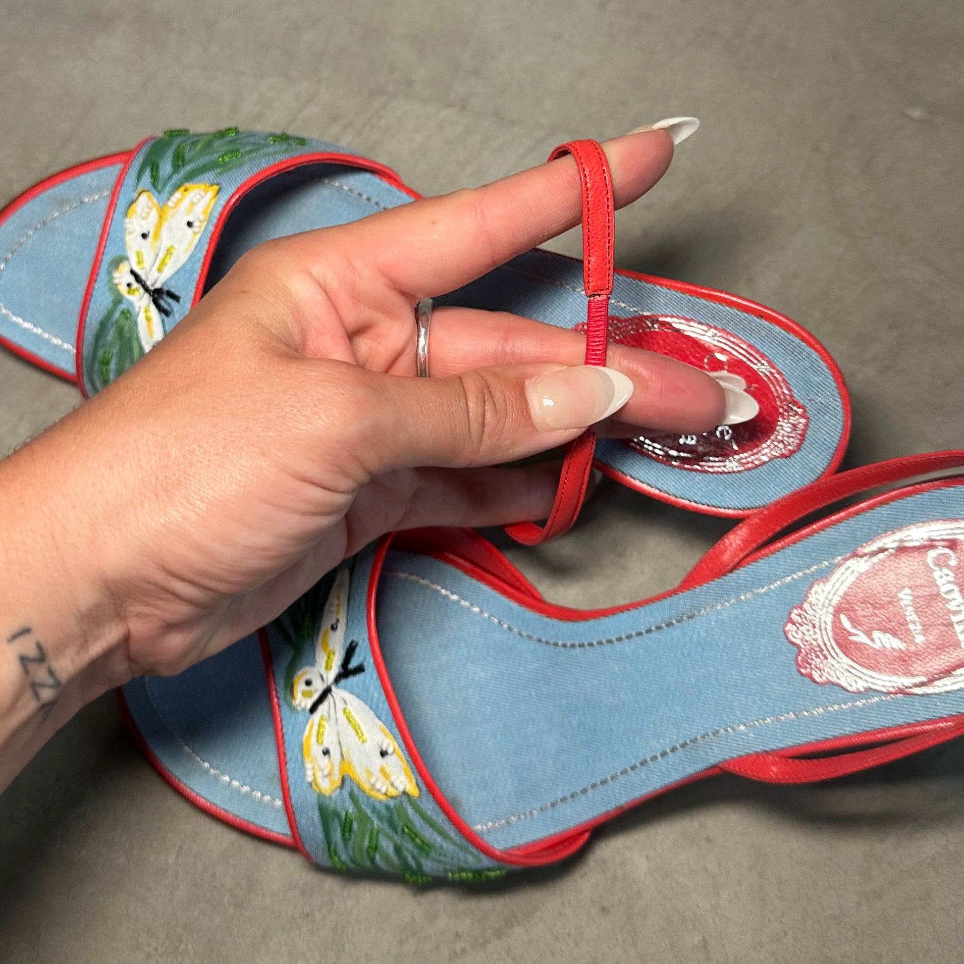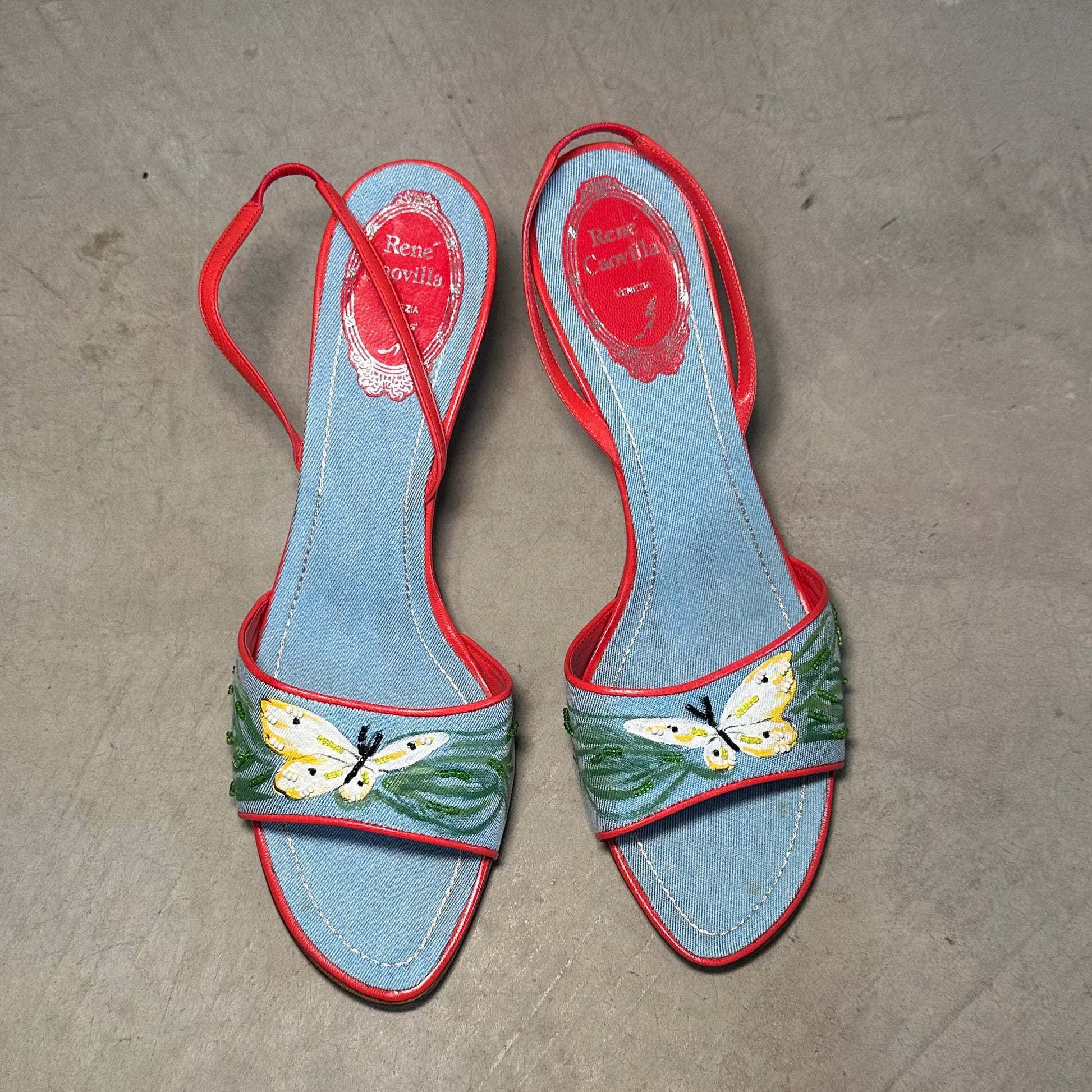 Rene Caovilla Denim Kitten Heels with Butterfly Detail (38.5)