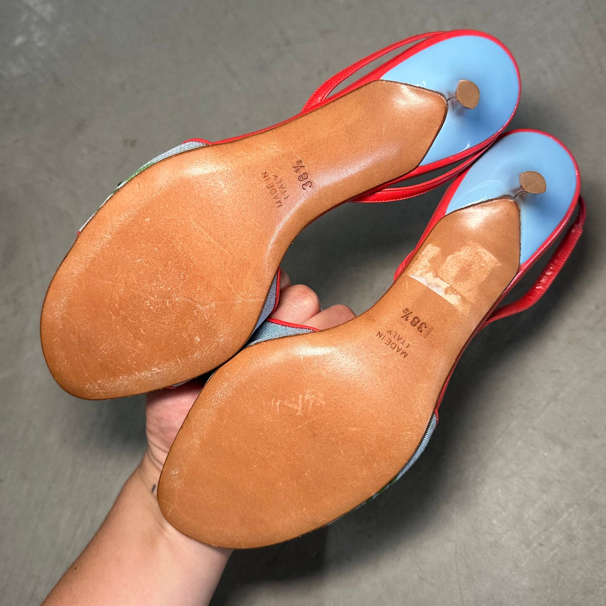 Great, unworn vintage condition. Some separation of the red leather slingback part on one shoe but elastic underneath still in tact.