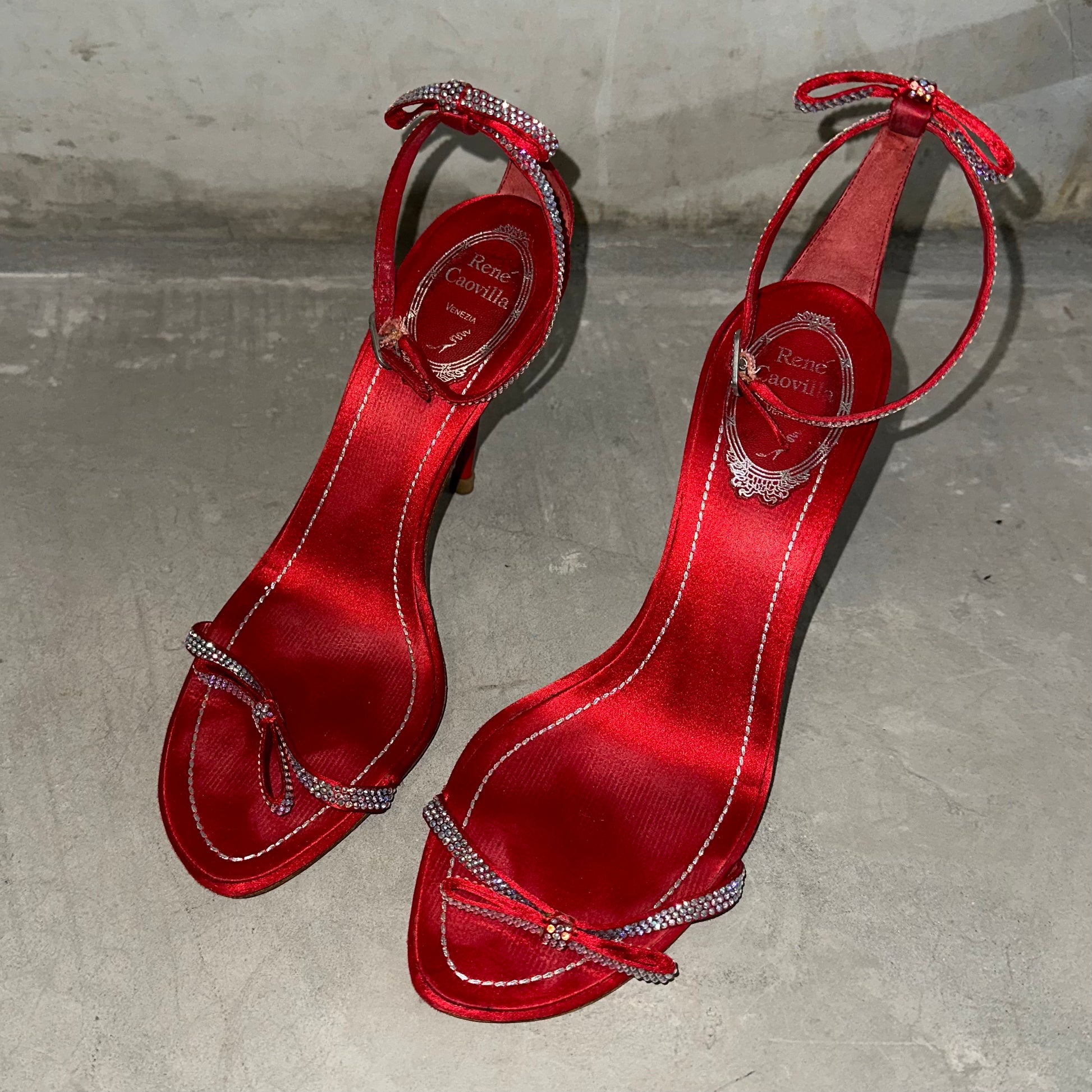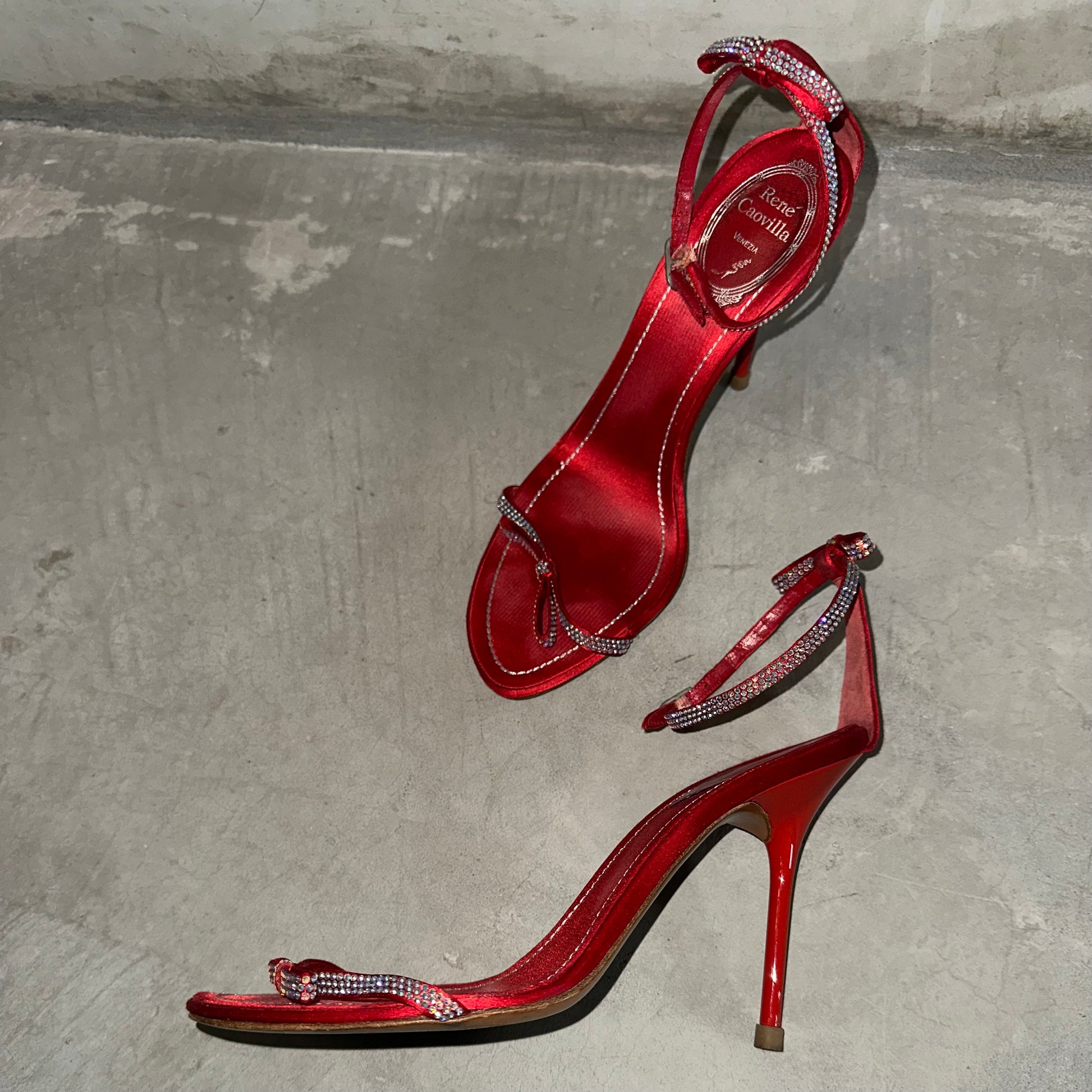 I DIE. Stunning red satin diamanté encrusted bow heels by Rene Caovilla.