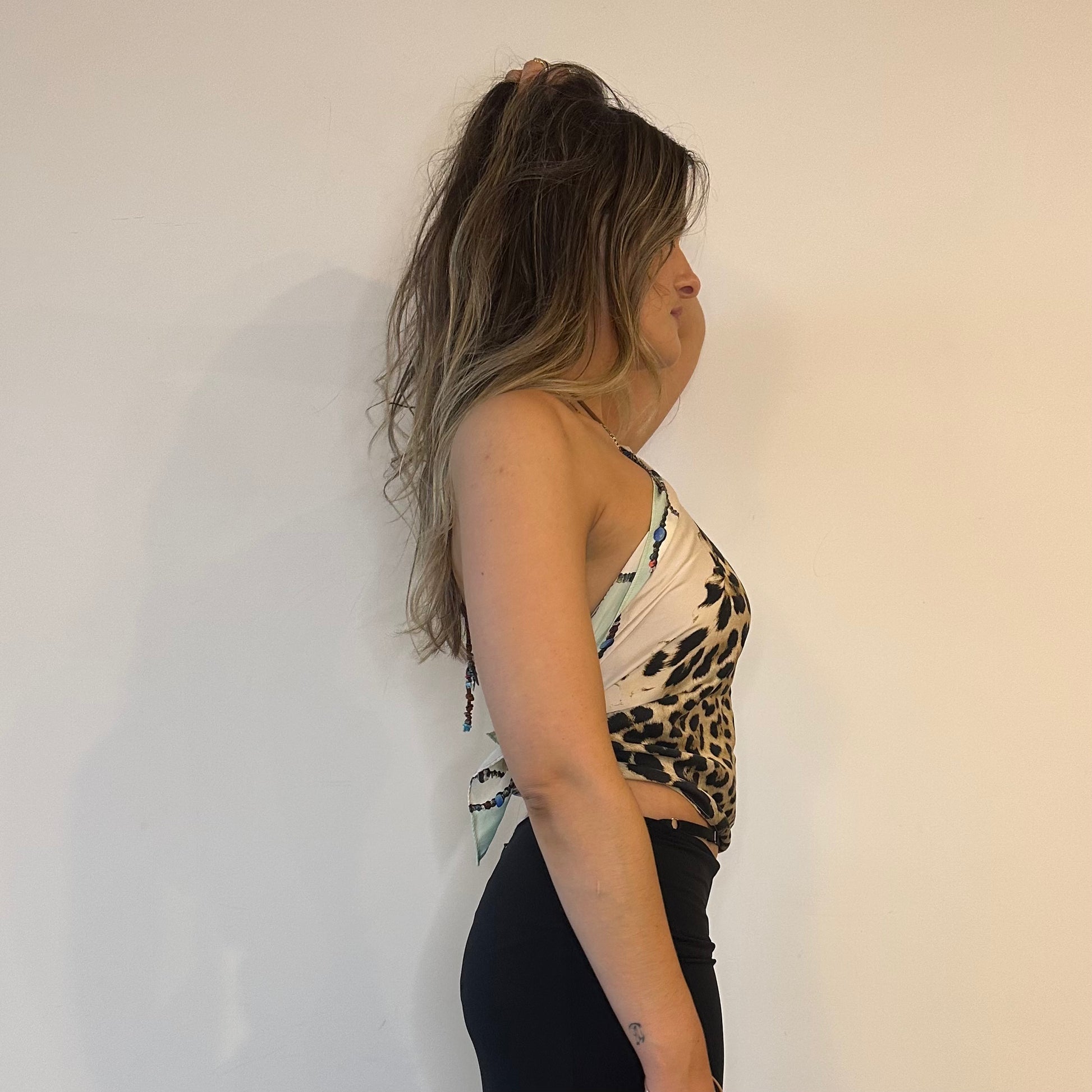Stunning silk scarf top by Roberto Cavalli. Has suede ties with bear details that tie in a halter fashion. Ties at the back and gives a backless effect.