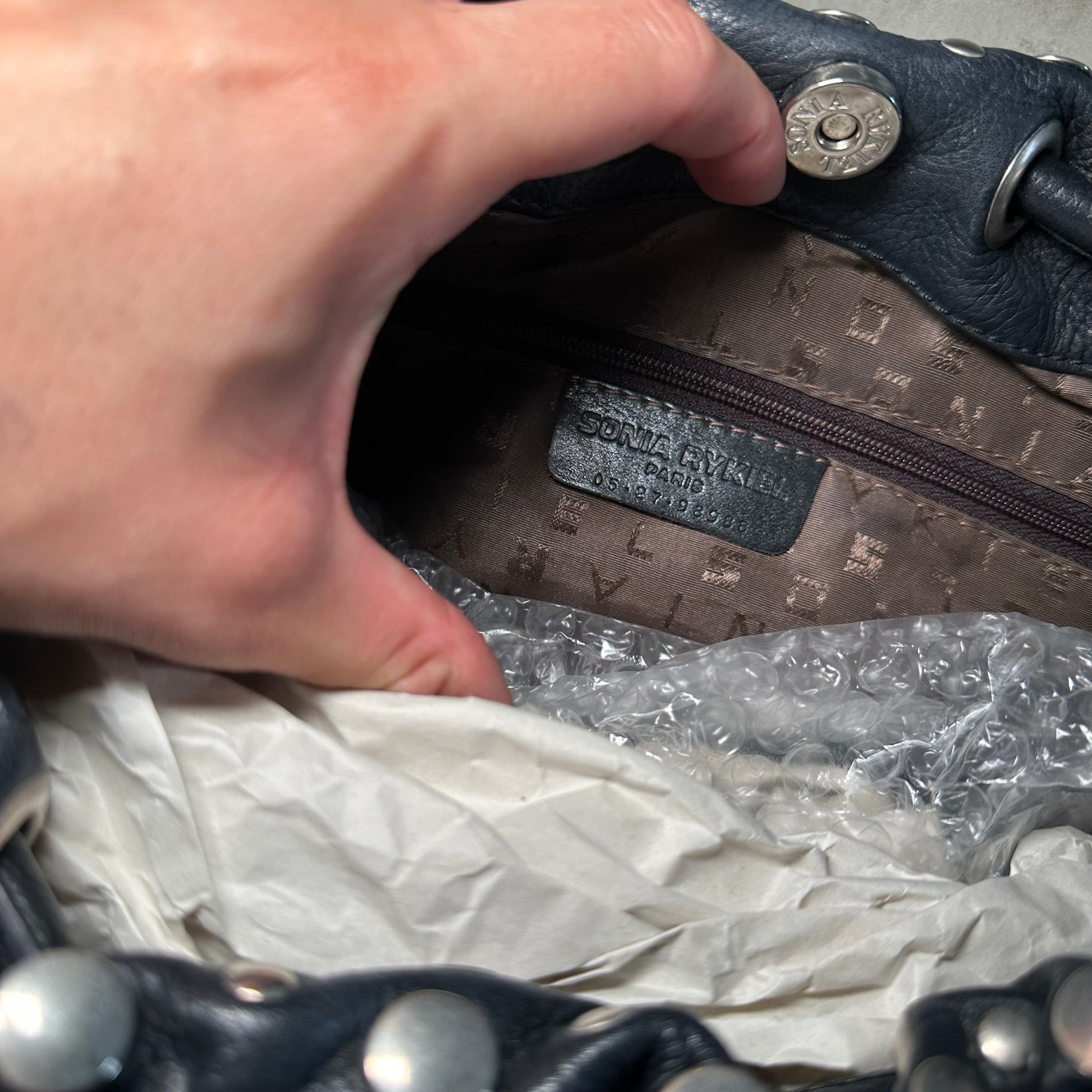 Gorgeous black leather Domino by Sonia Rykiel with silver and gold studs. I'm under the impression the gold studs are just aged silver studs so this is reflected in price.