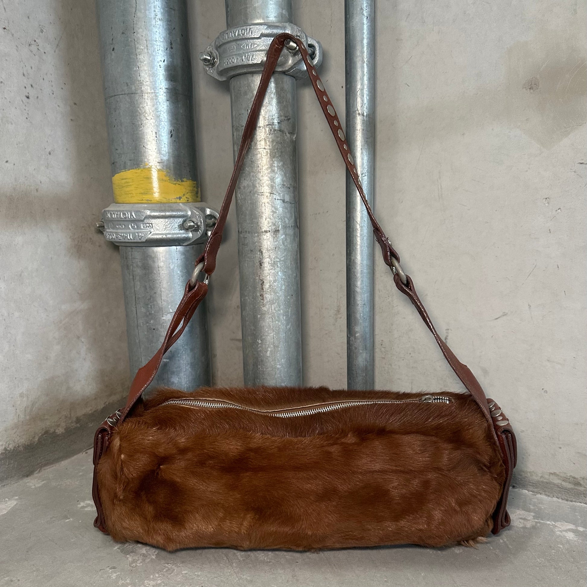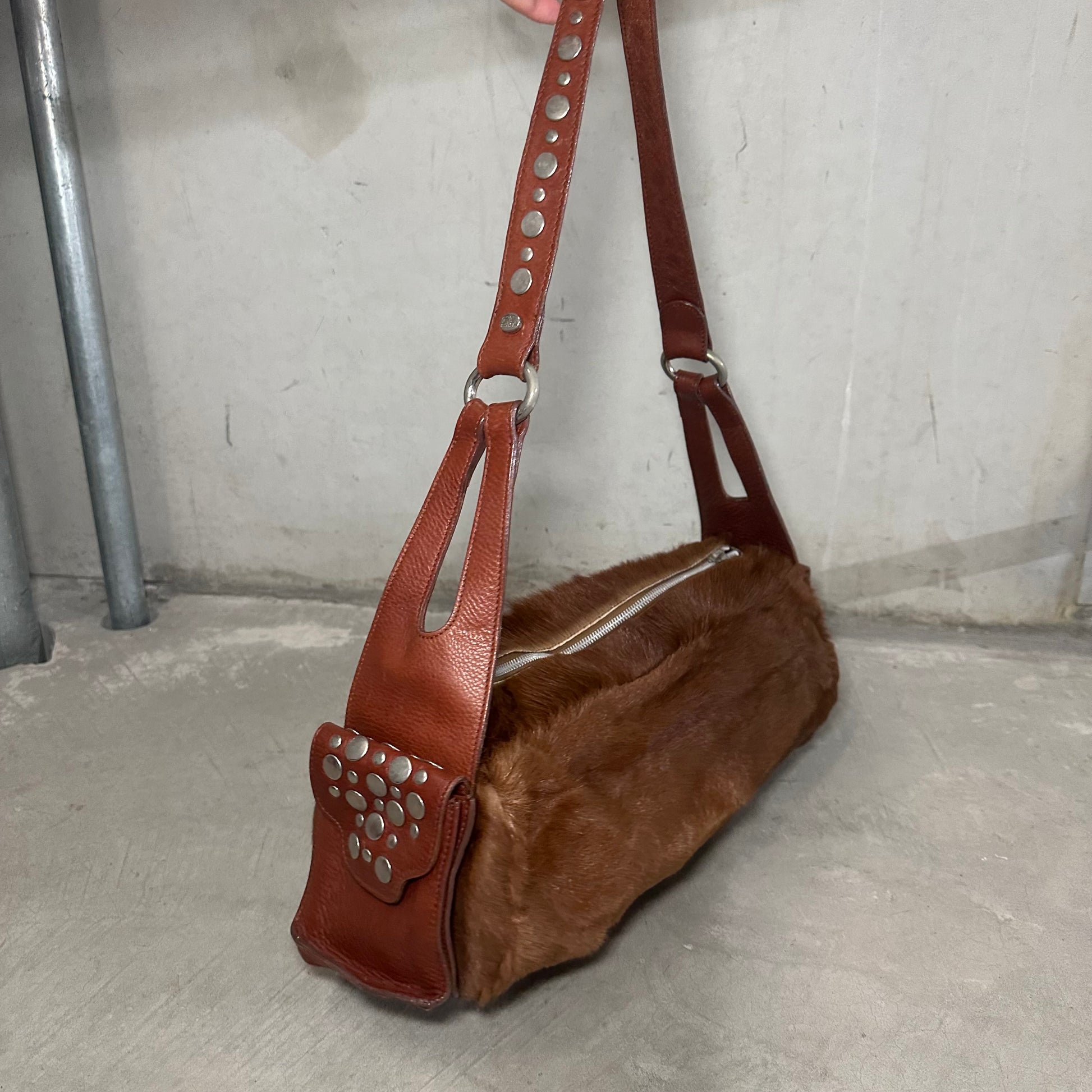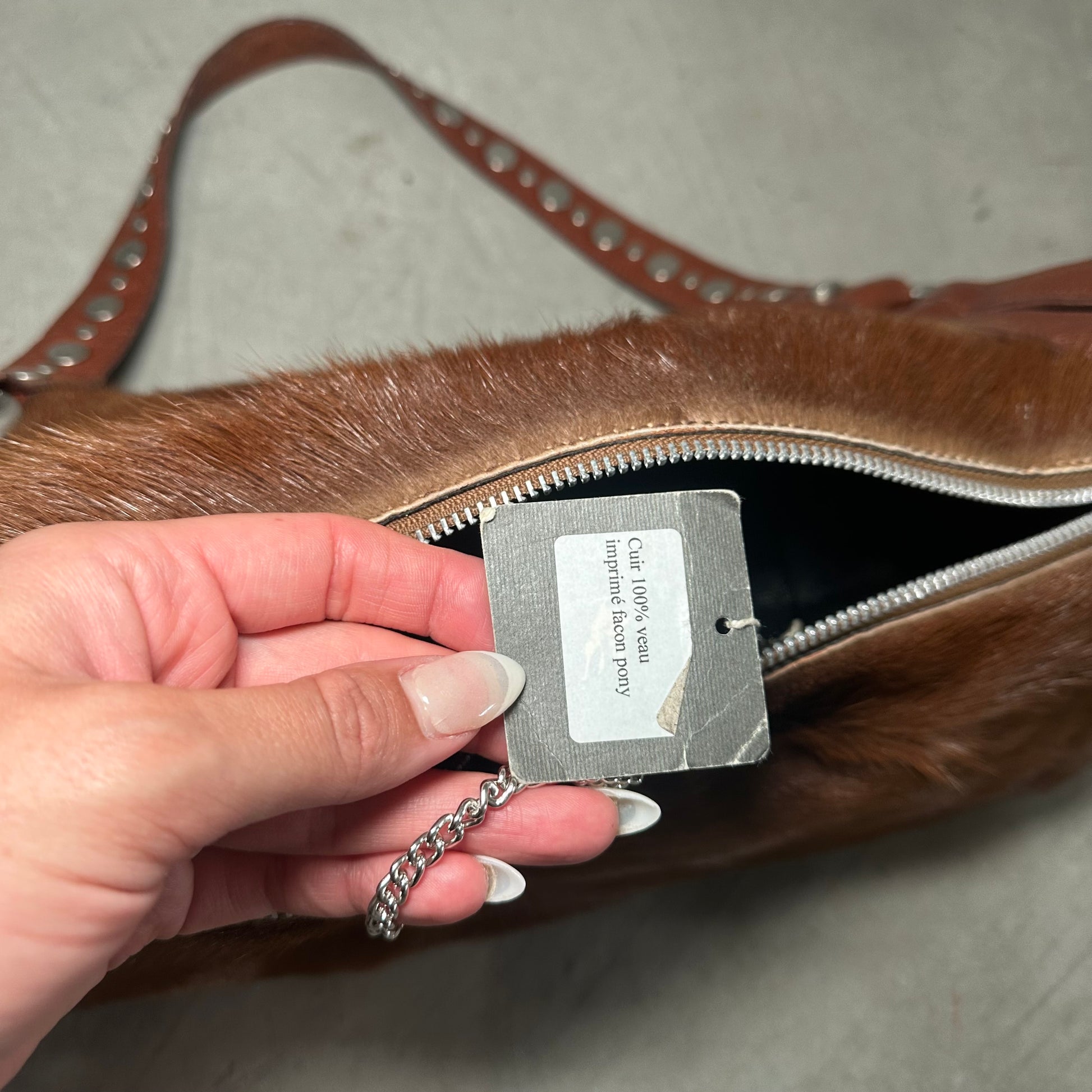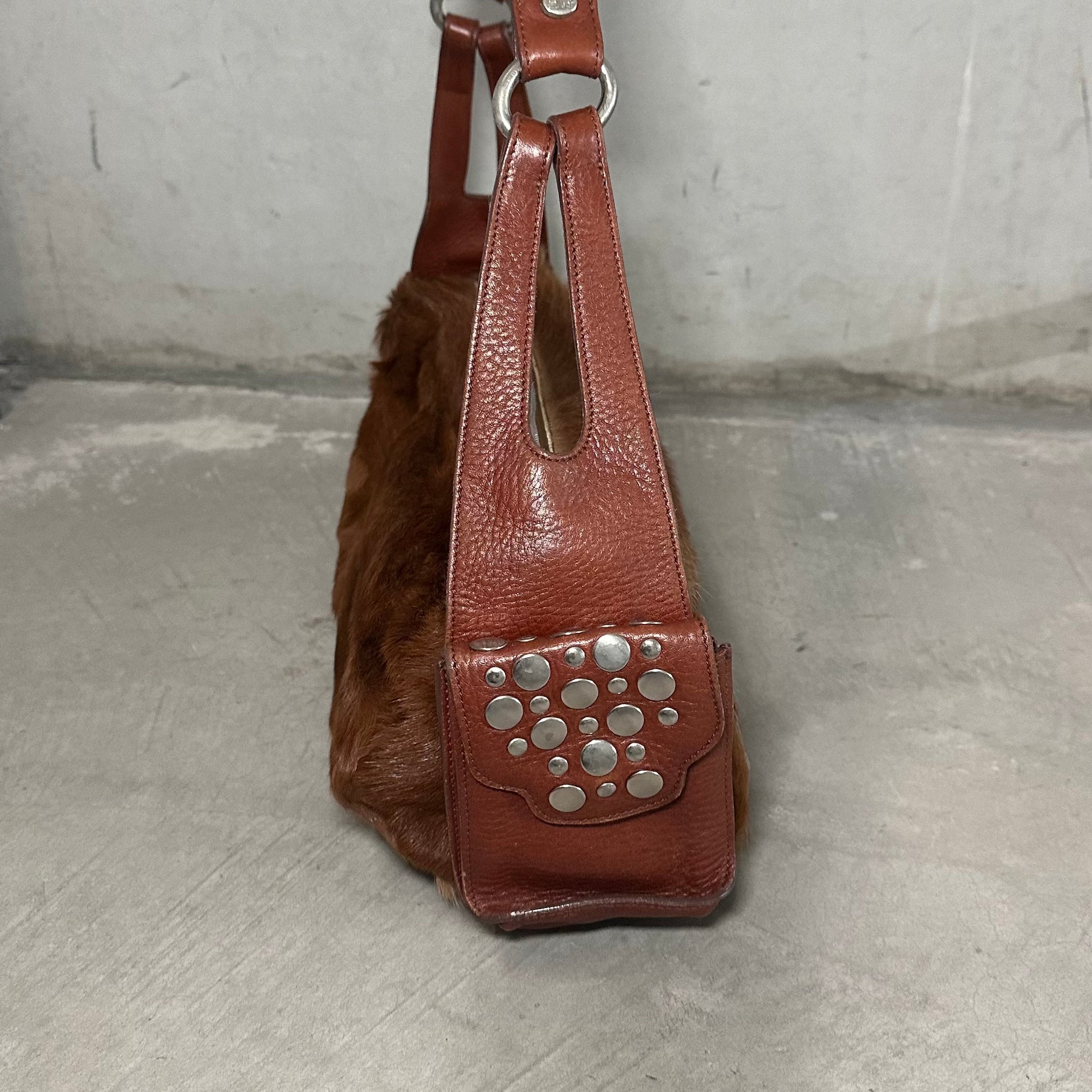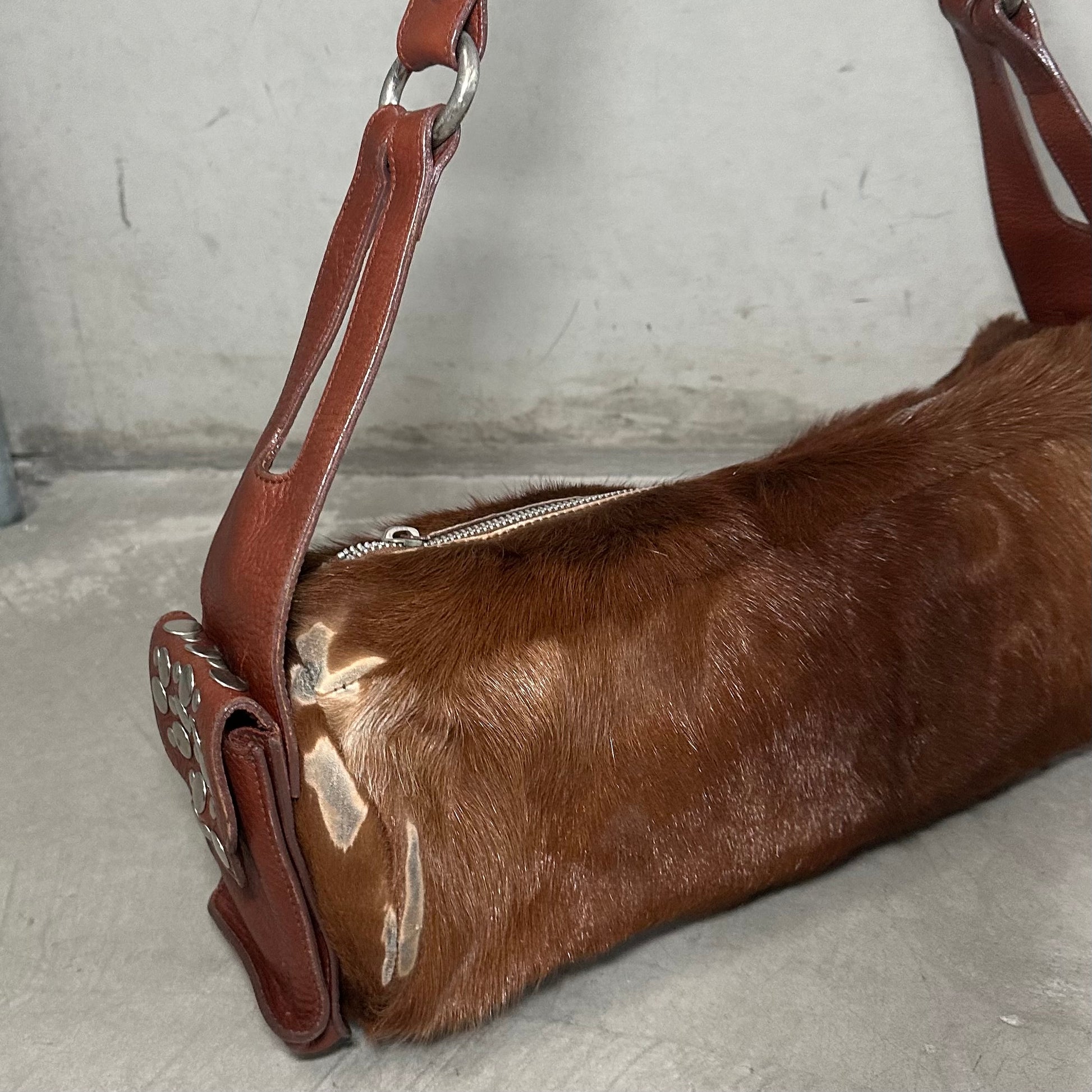 Amazing long cowhide bag by Sonia Rykiel with Domino stud effect on the side pockets and strap.