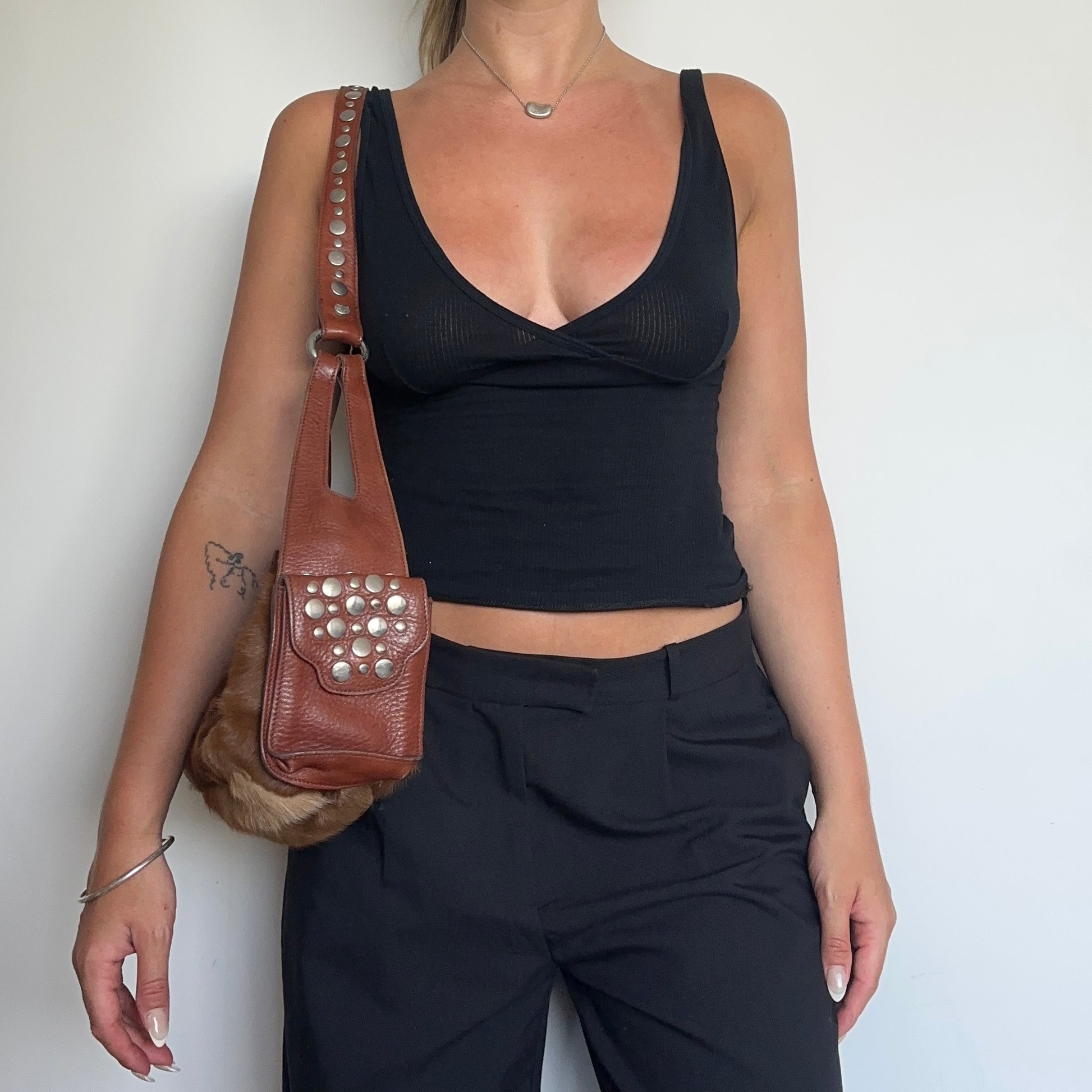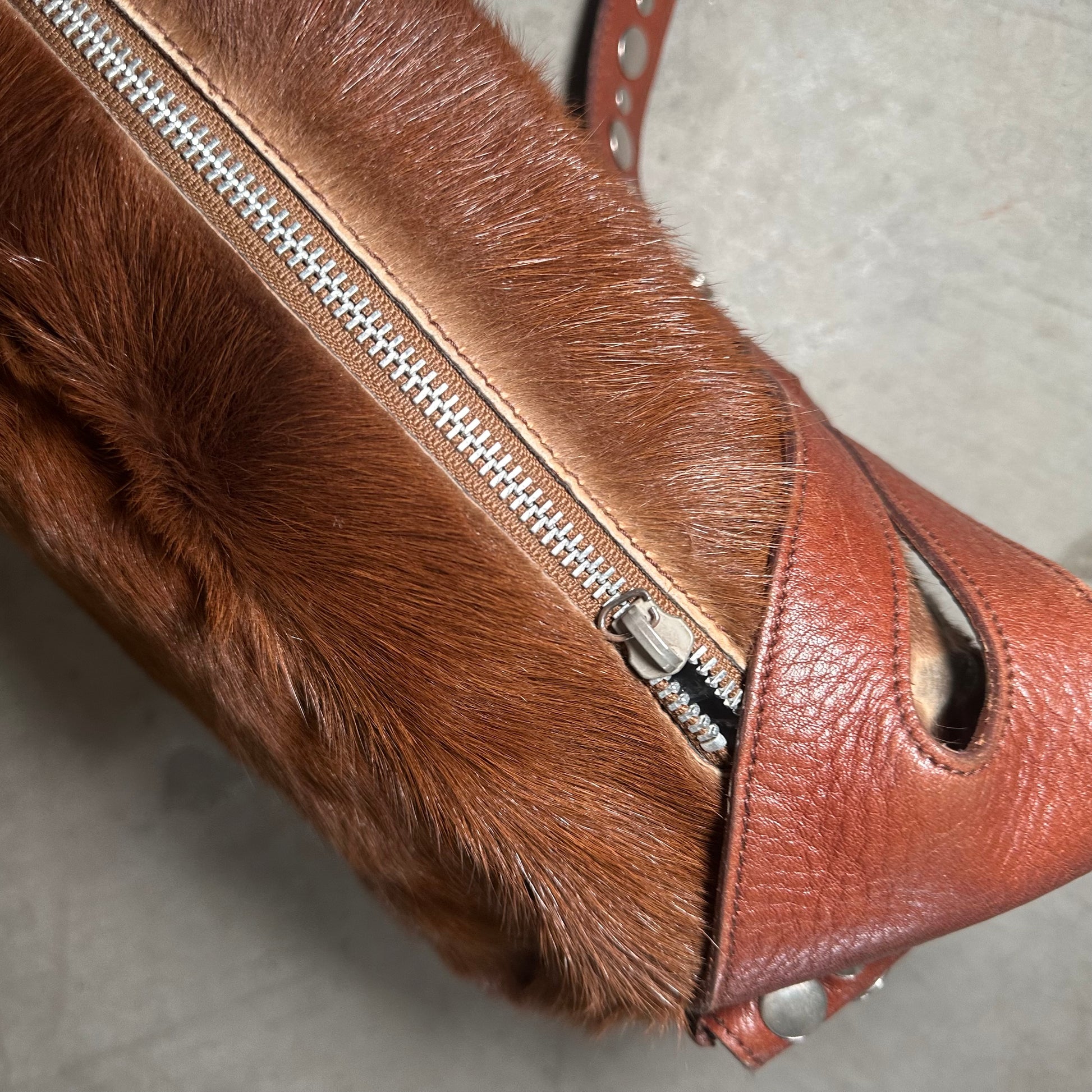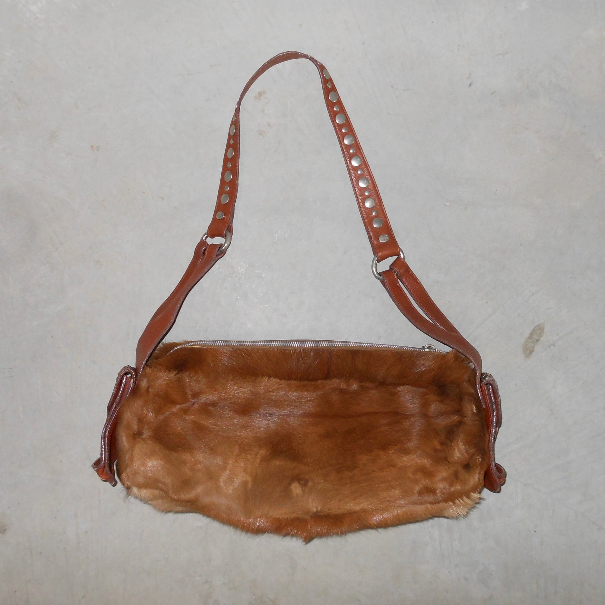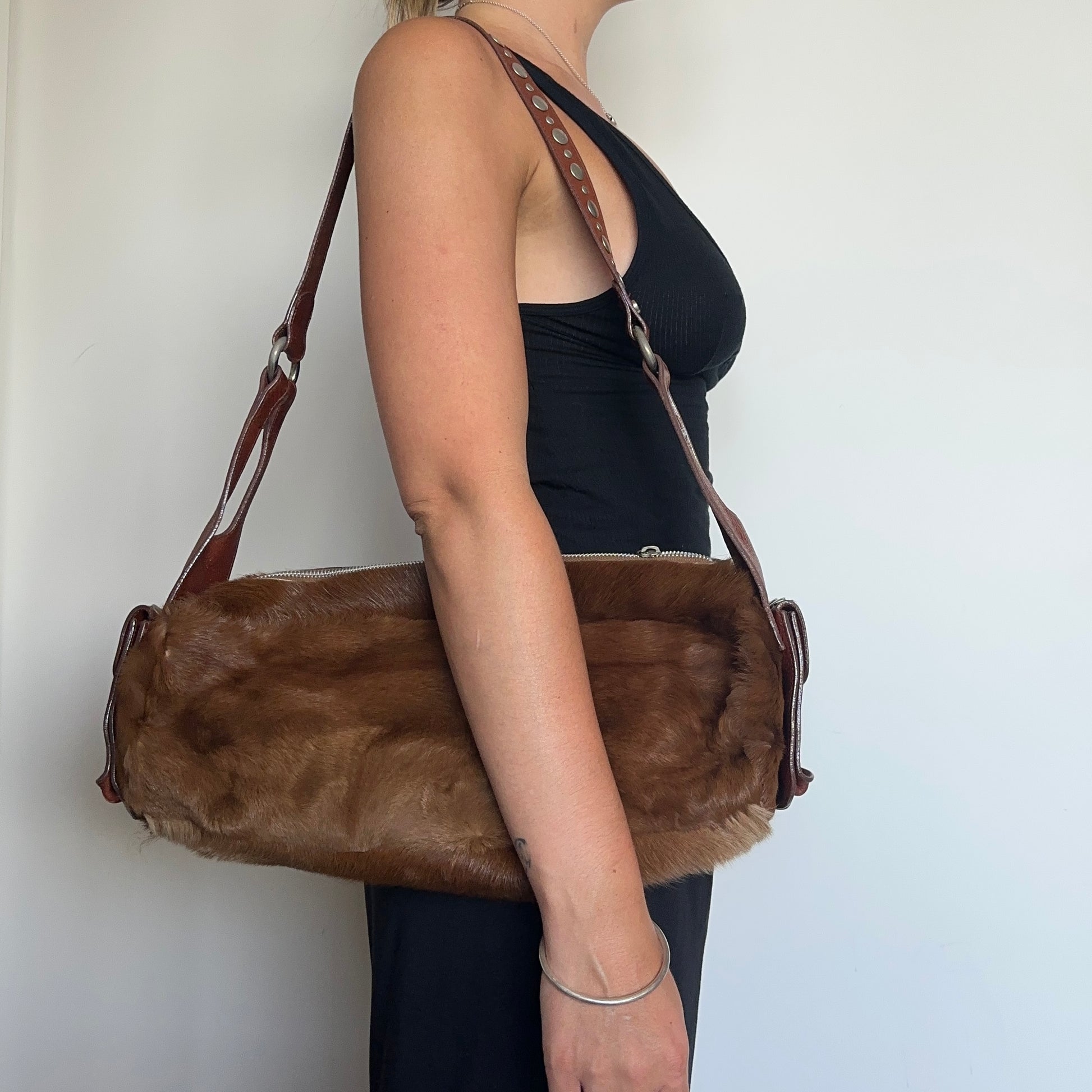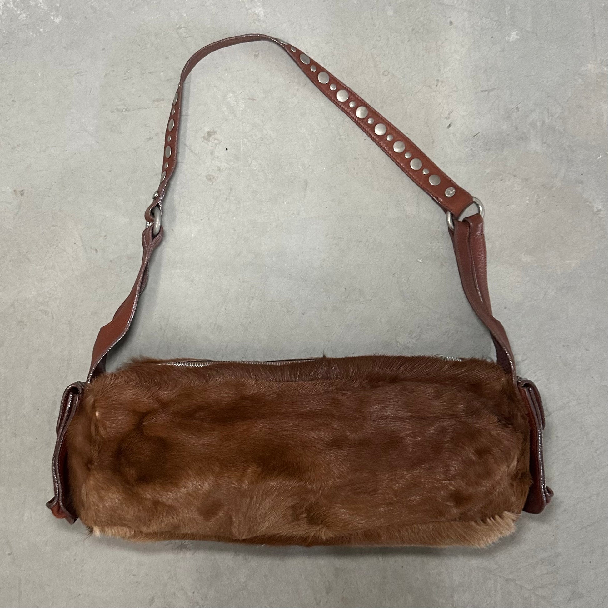 Amazing long cowhide bag by Sonia Rykiel with Domino stud effect on the side pockets and strap.