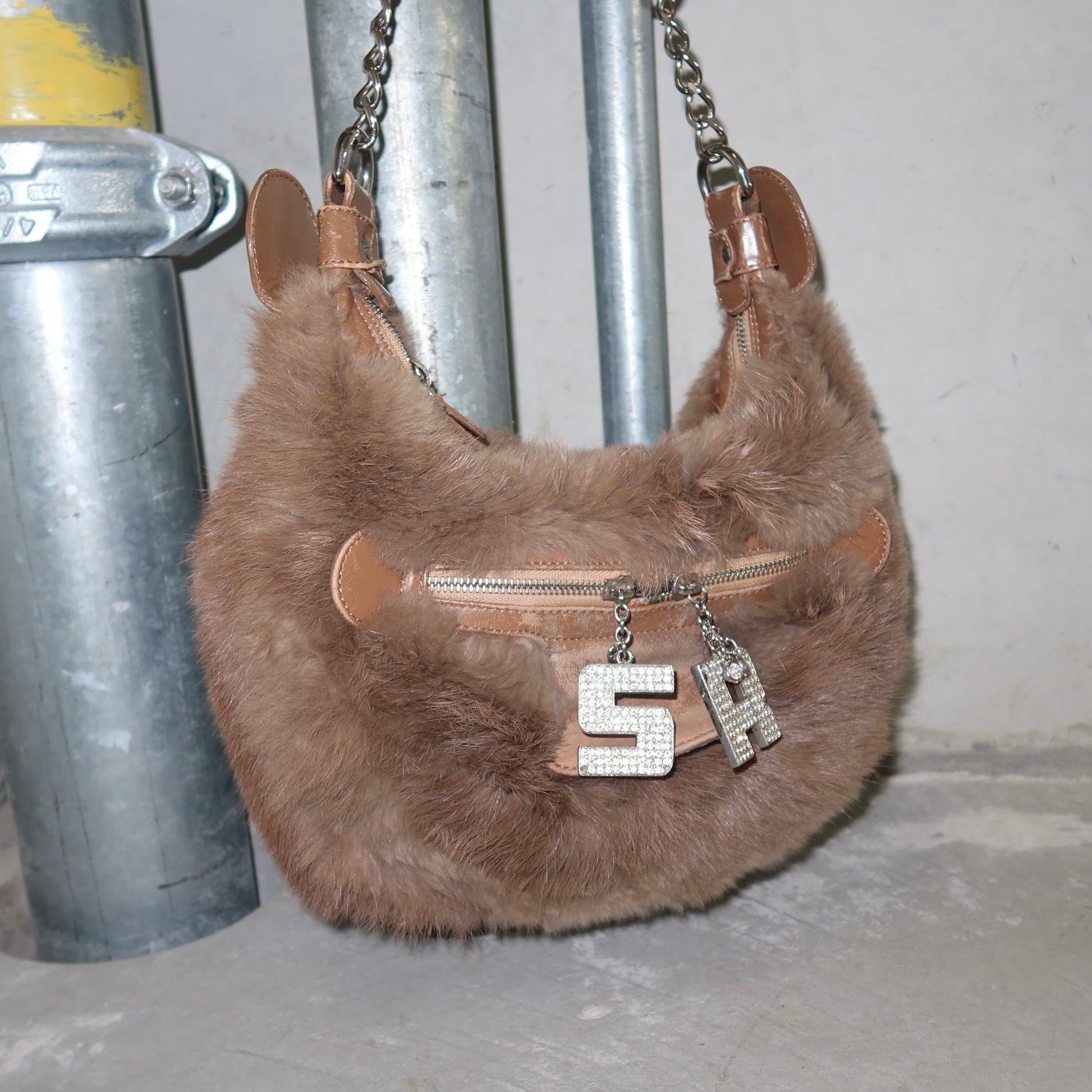 Amazing real fur Sonia Rykiel crescent bag with leather accents. Rhinestone embellished 'S' and 'R' charms on the zips.