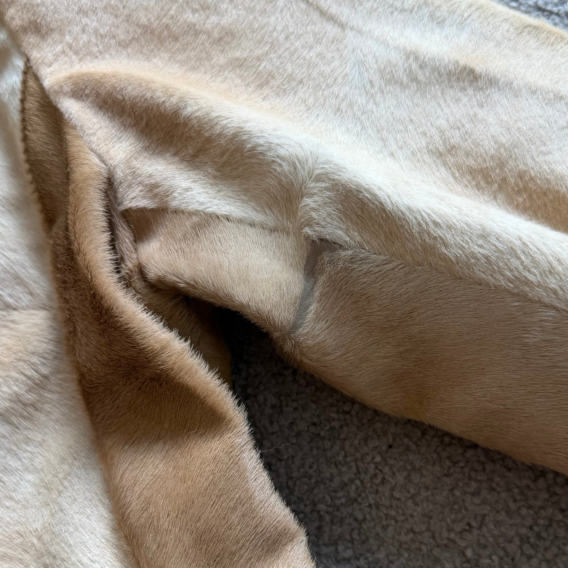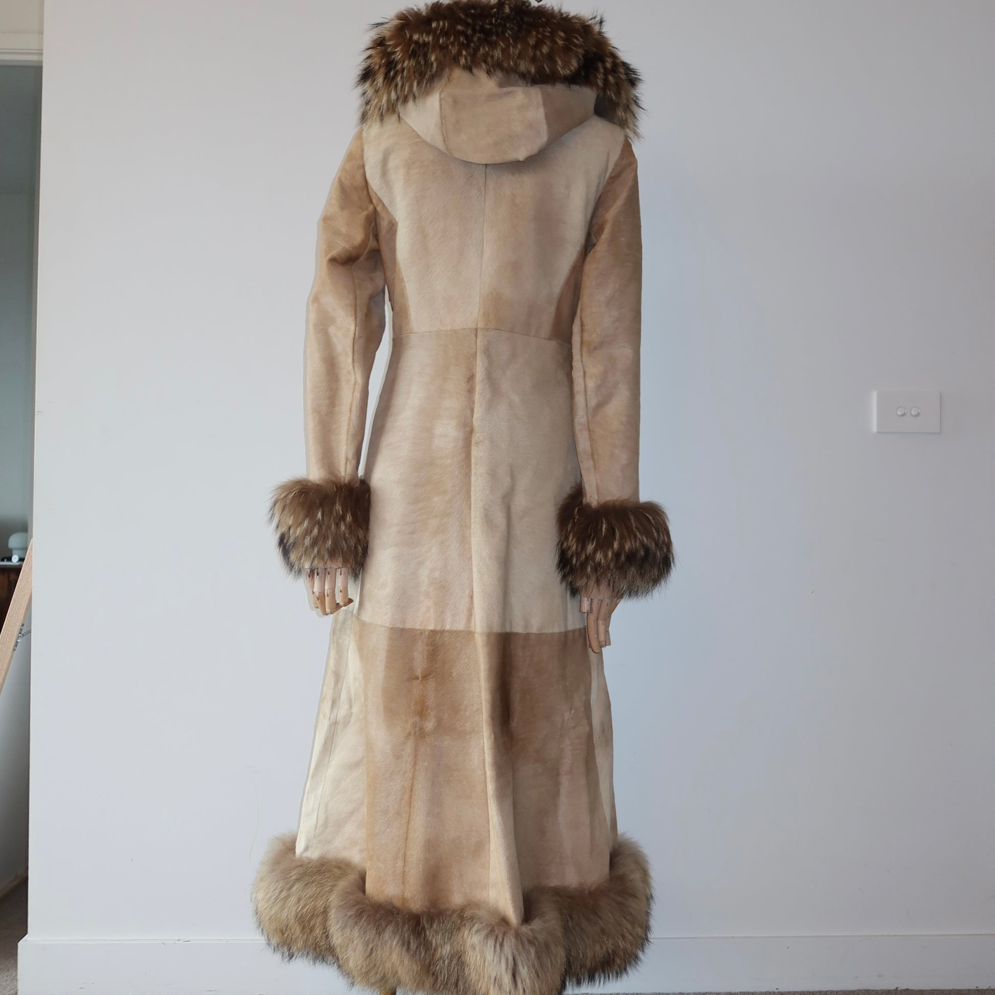 Breathtaking hooded Trussardi full length coat made of a cream cowhide with a fox fur trim.