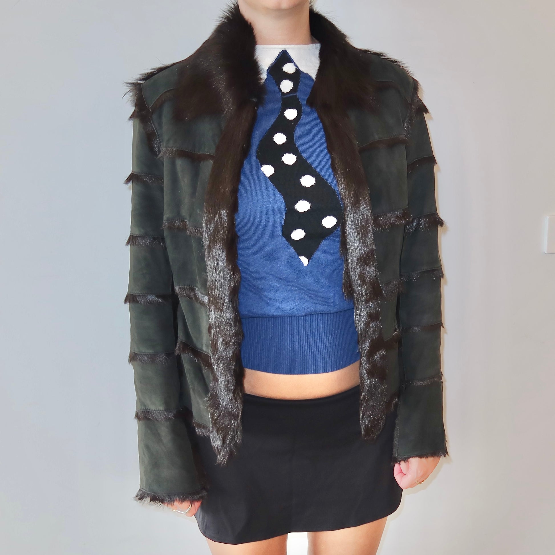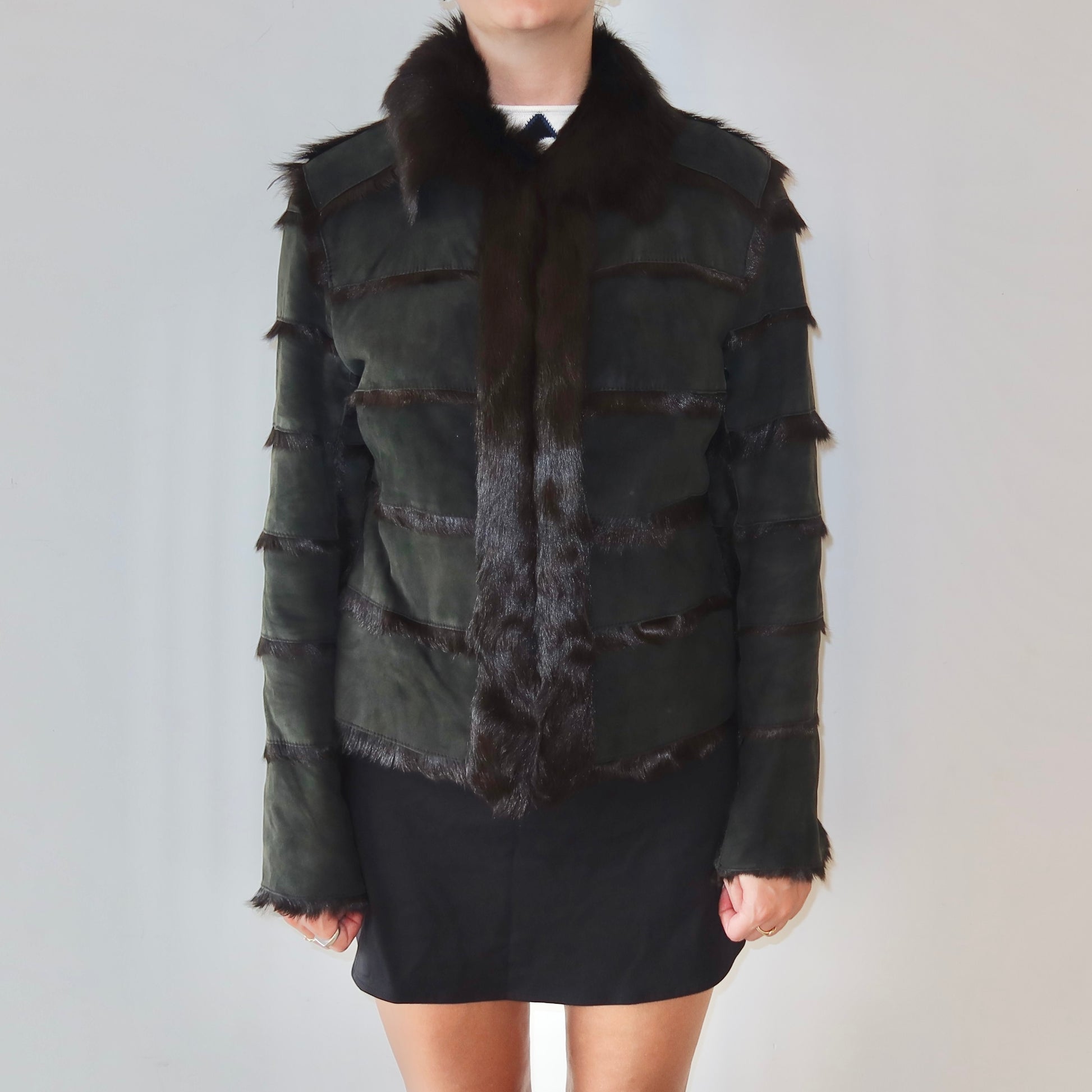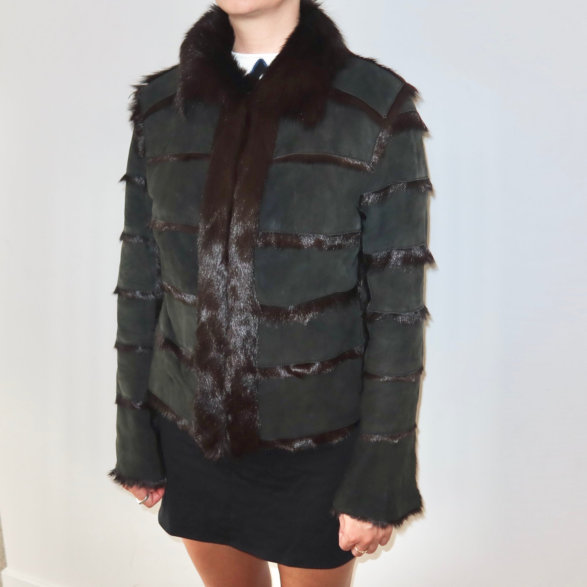 Gorgeous dark green suede jacket with real fur lining. Buttery soft. Silver hook and eye closure.
