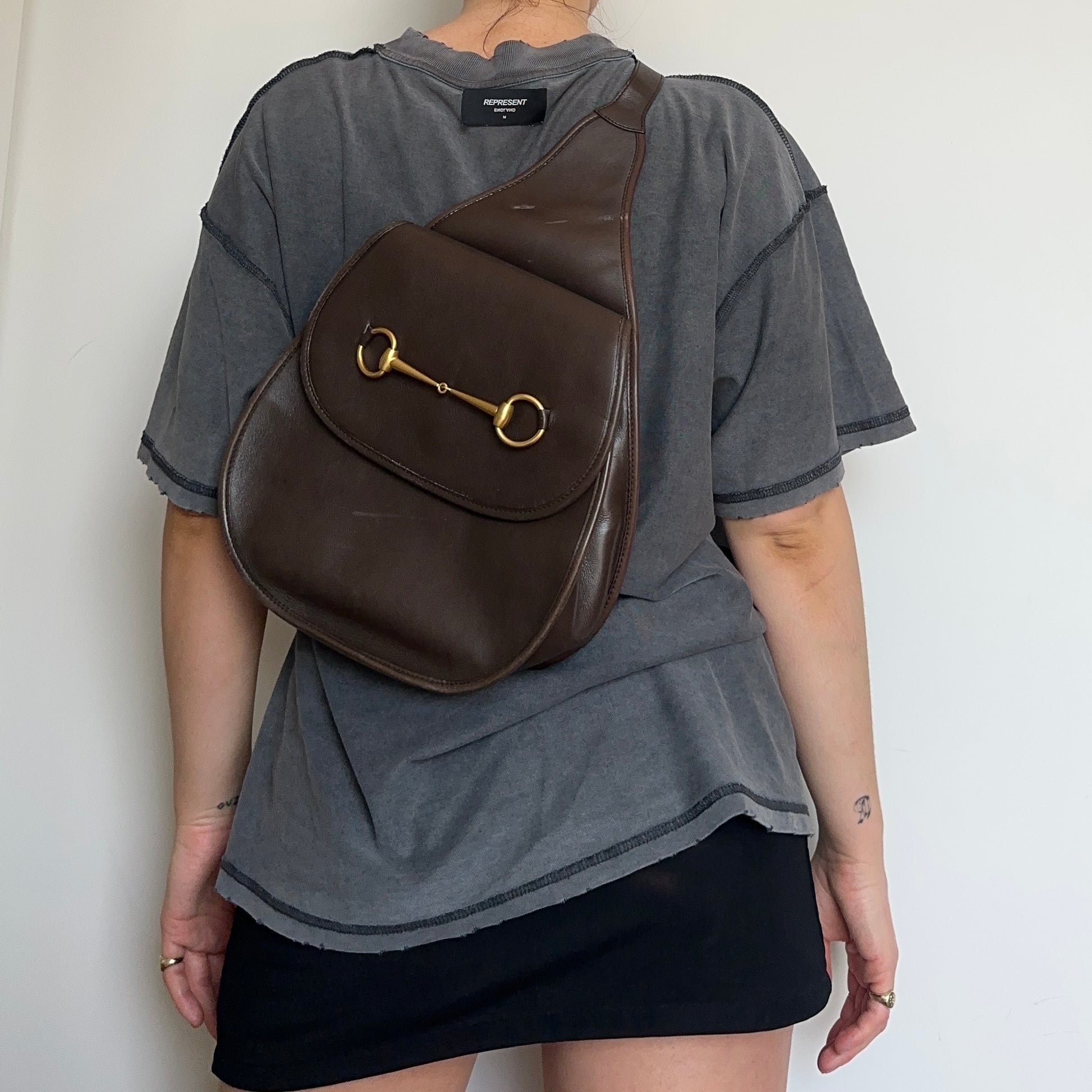 Amazing and rare dark brown vintage Gucci crossbody/backpack bag with gold horse-bit detail.
