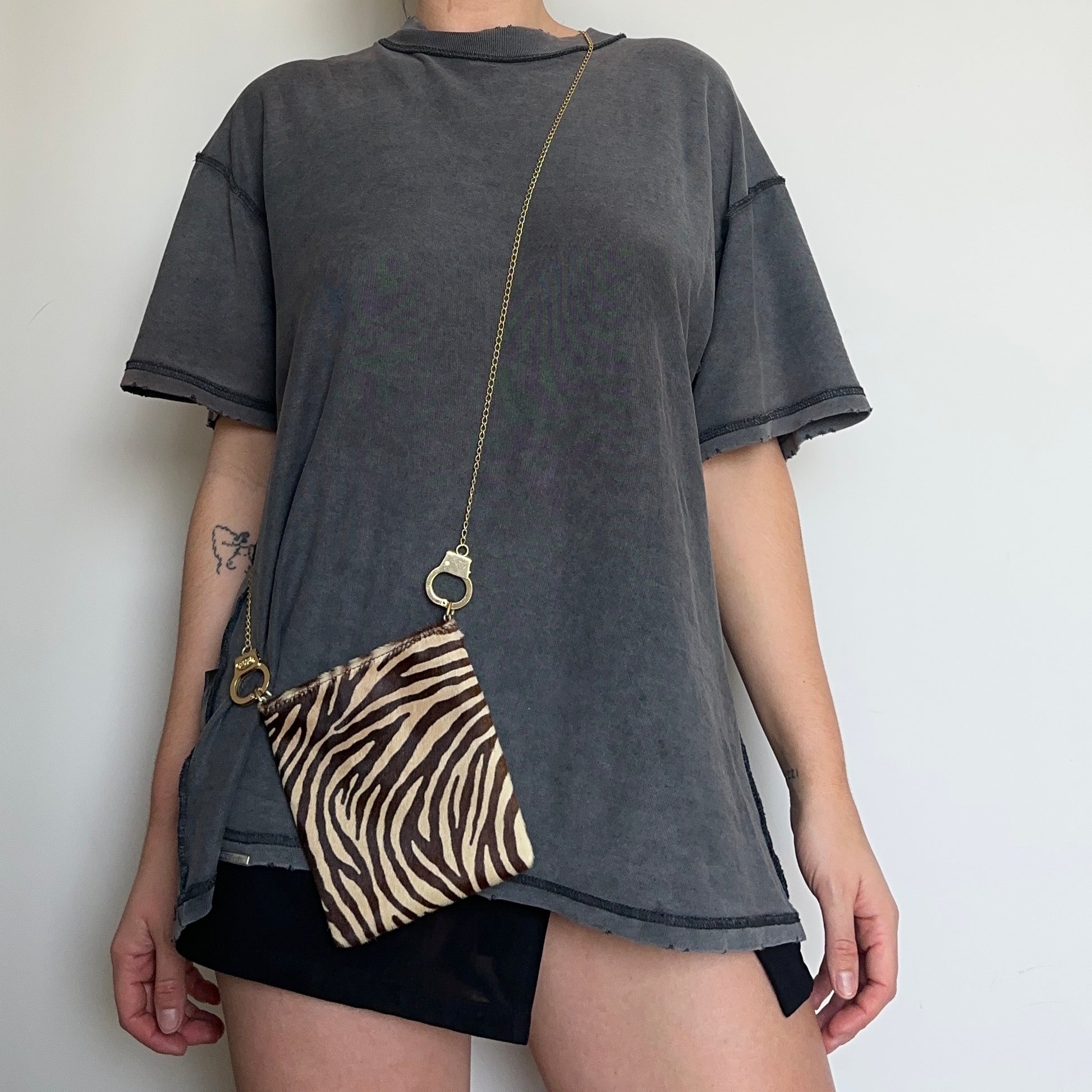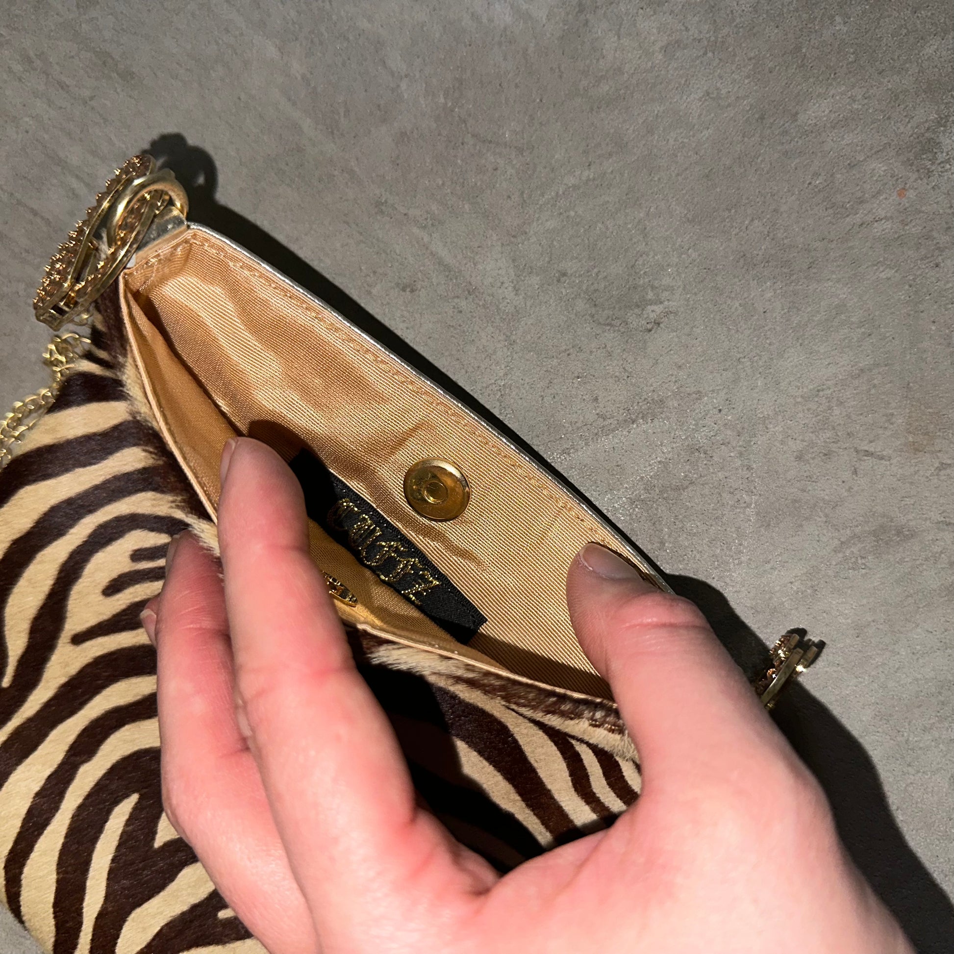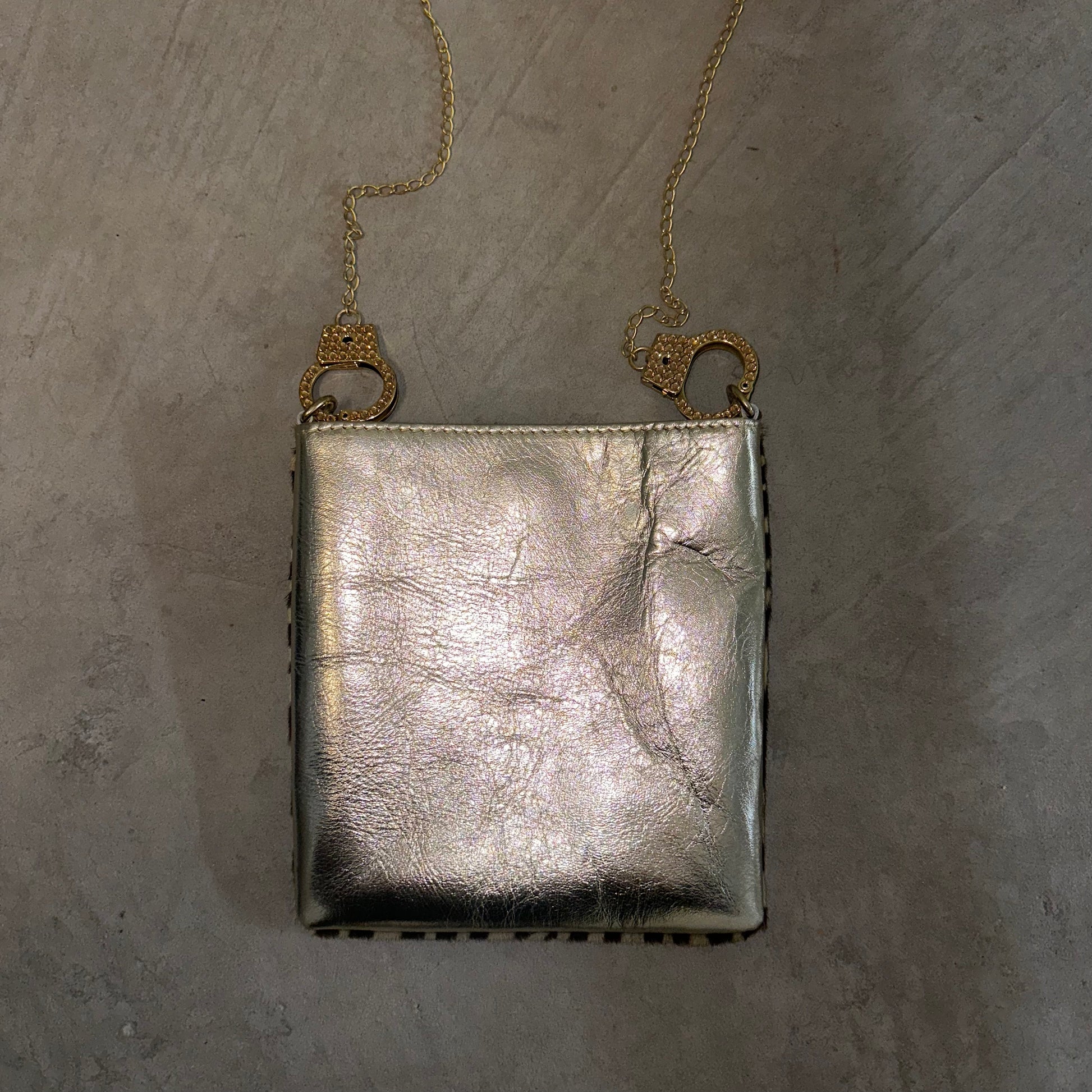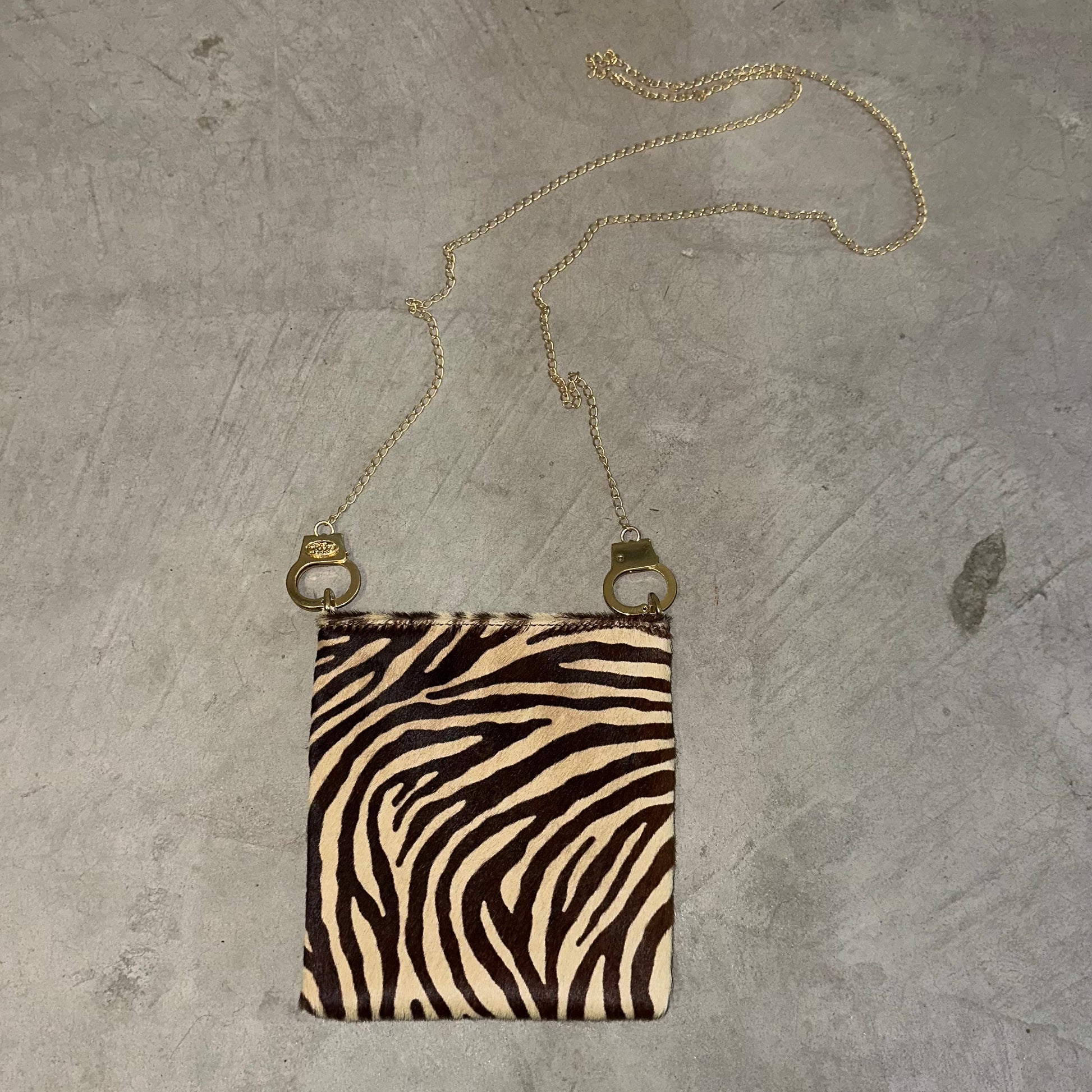 The cutest little Cuffz mini crossbody bag with one zebra print ponyhair side and one gold side. Swarovski encrusted mini handcuff details.