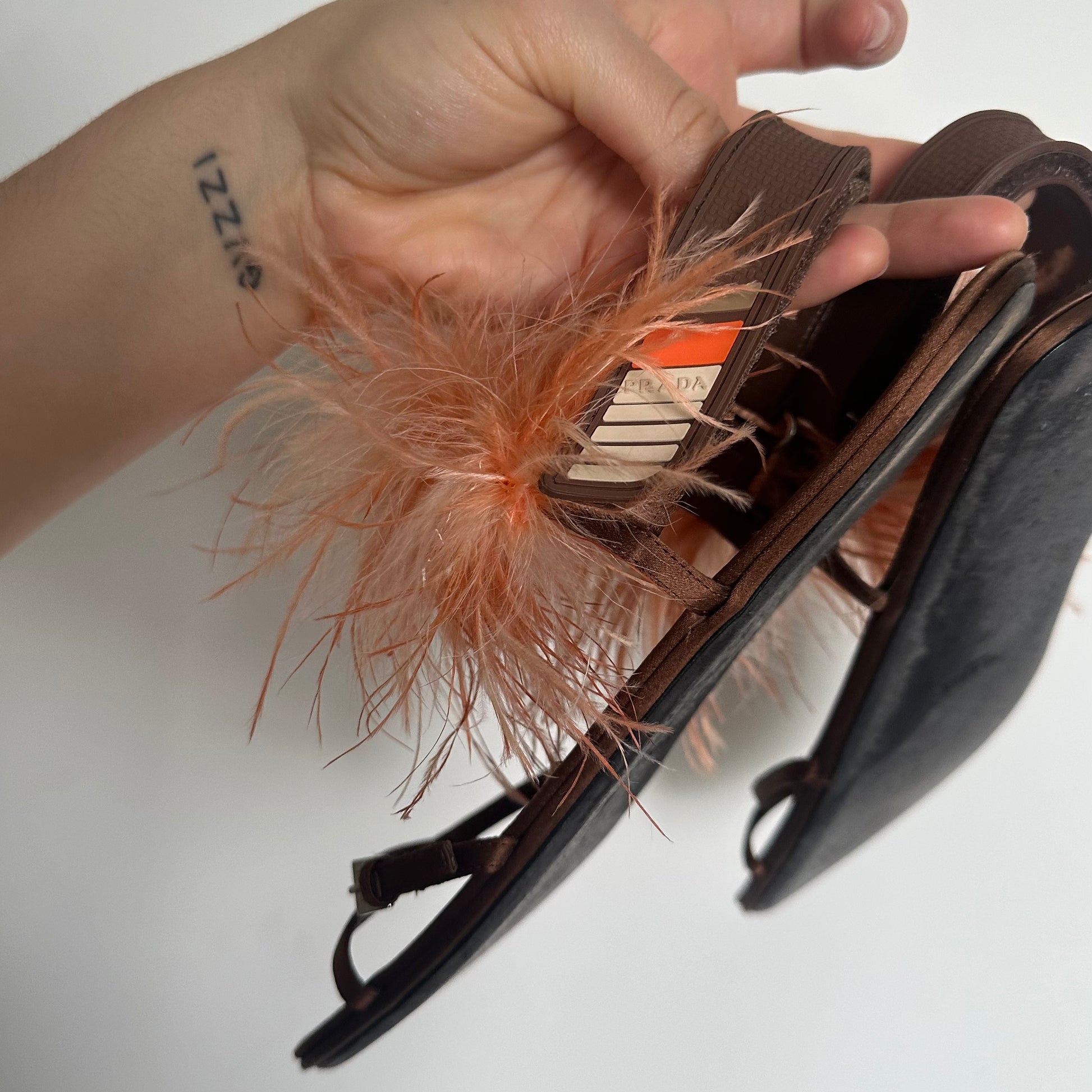 Gorgeous brown satin Prada flats with crisscross buckle strap and baby pink marabou feather ankle detail! From their SS2017 collection. The RRP on these in 2017 was $1120!