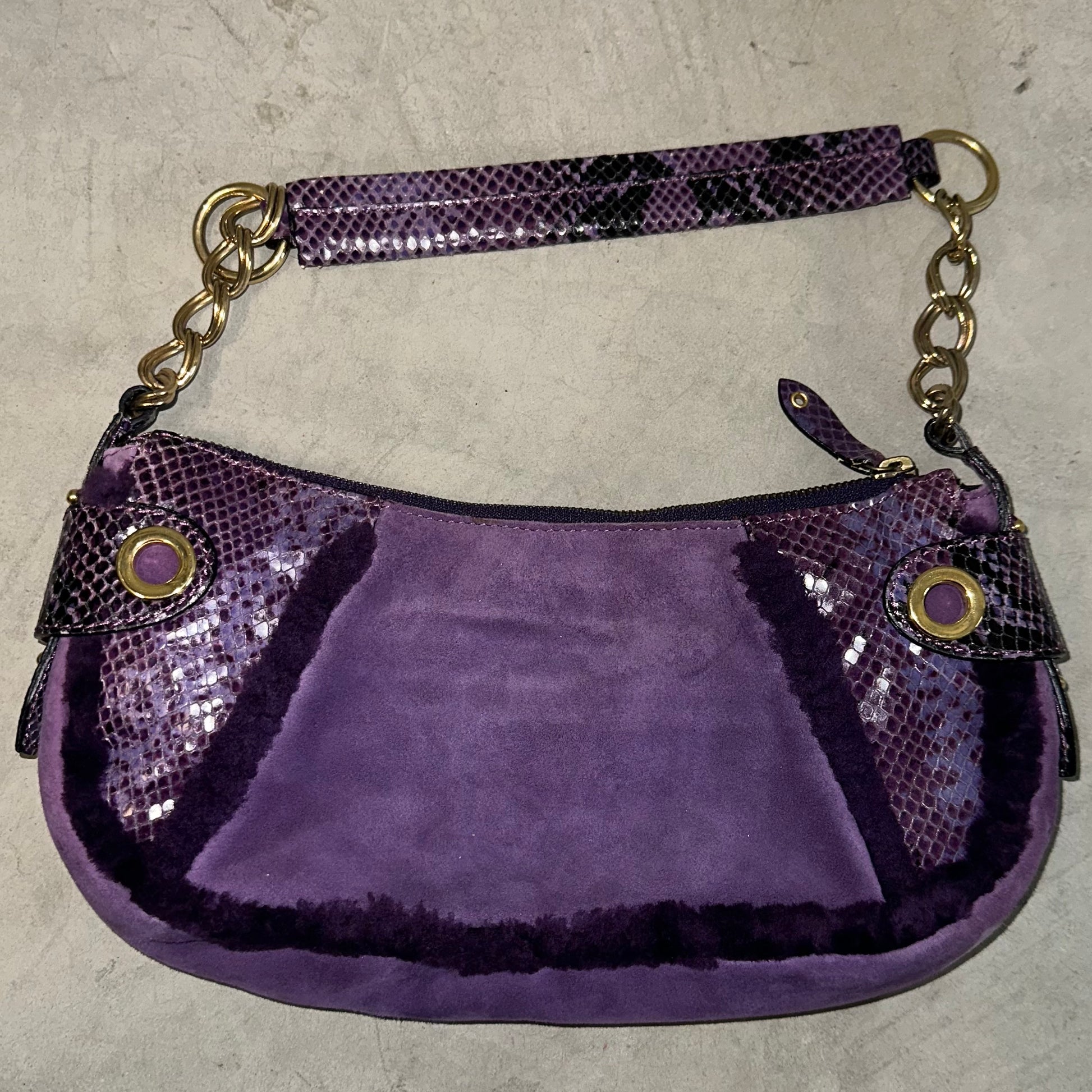 Gorgeous D&G by Dolce & Gabbana suede and shearling back with snakeskin accents. Rare purple colour. Features gold letter logo and matching gold hardware. Can sit in the nook of your arm or on your shoulder.