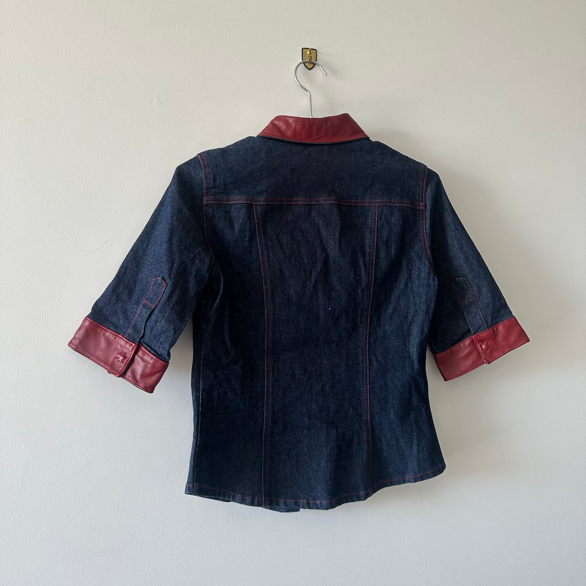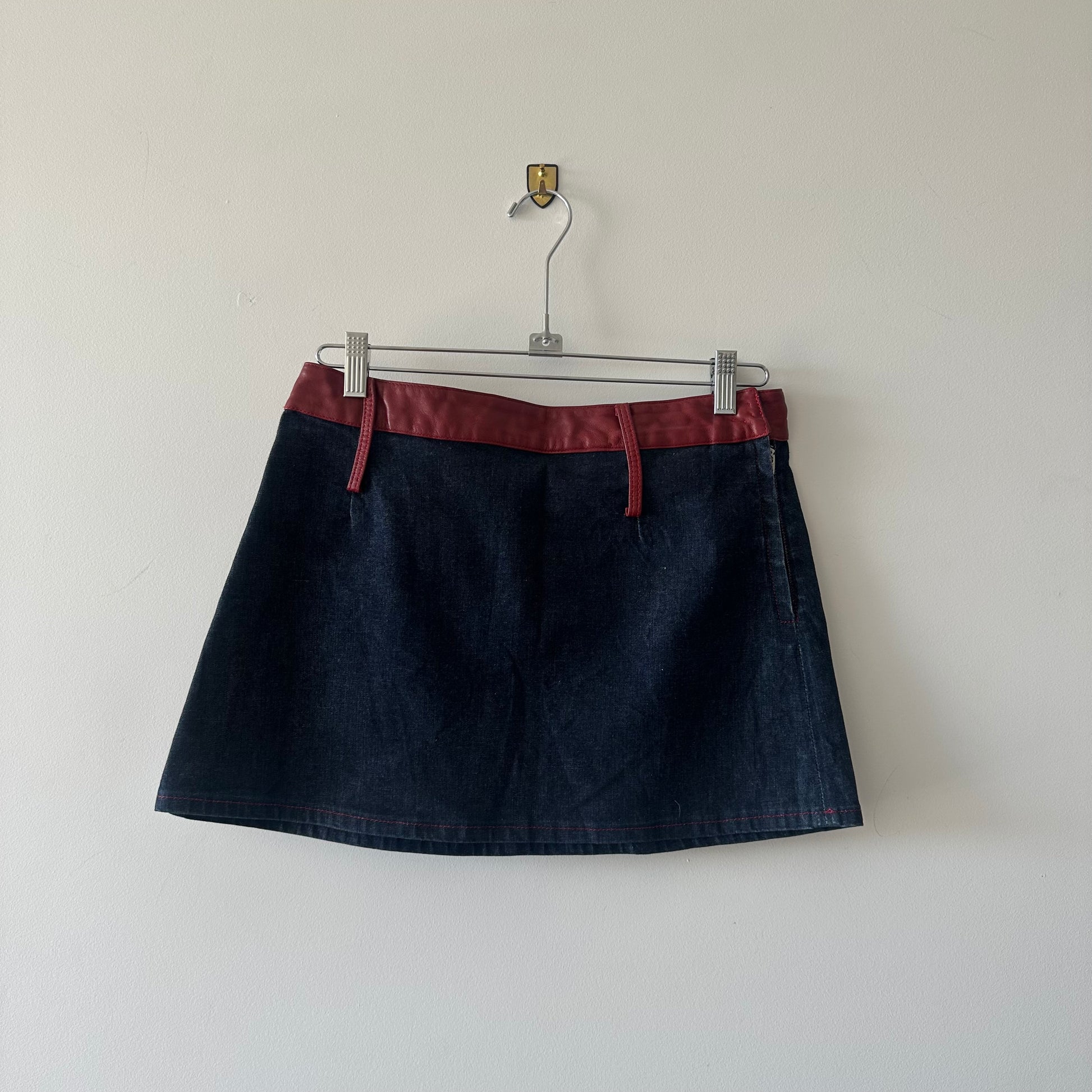 The hottest denim two piece set by D&G (Dolce & Gabbana's diffusion line). Adorable half length shirt and mini skirt. Dark denim with red leather accents. Pop buttons.