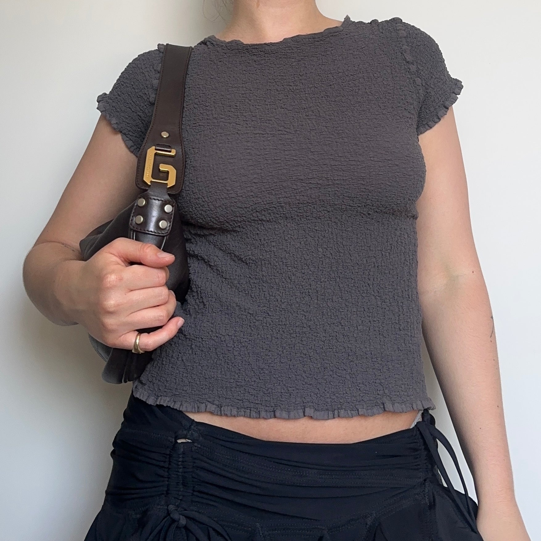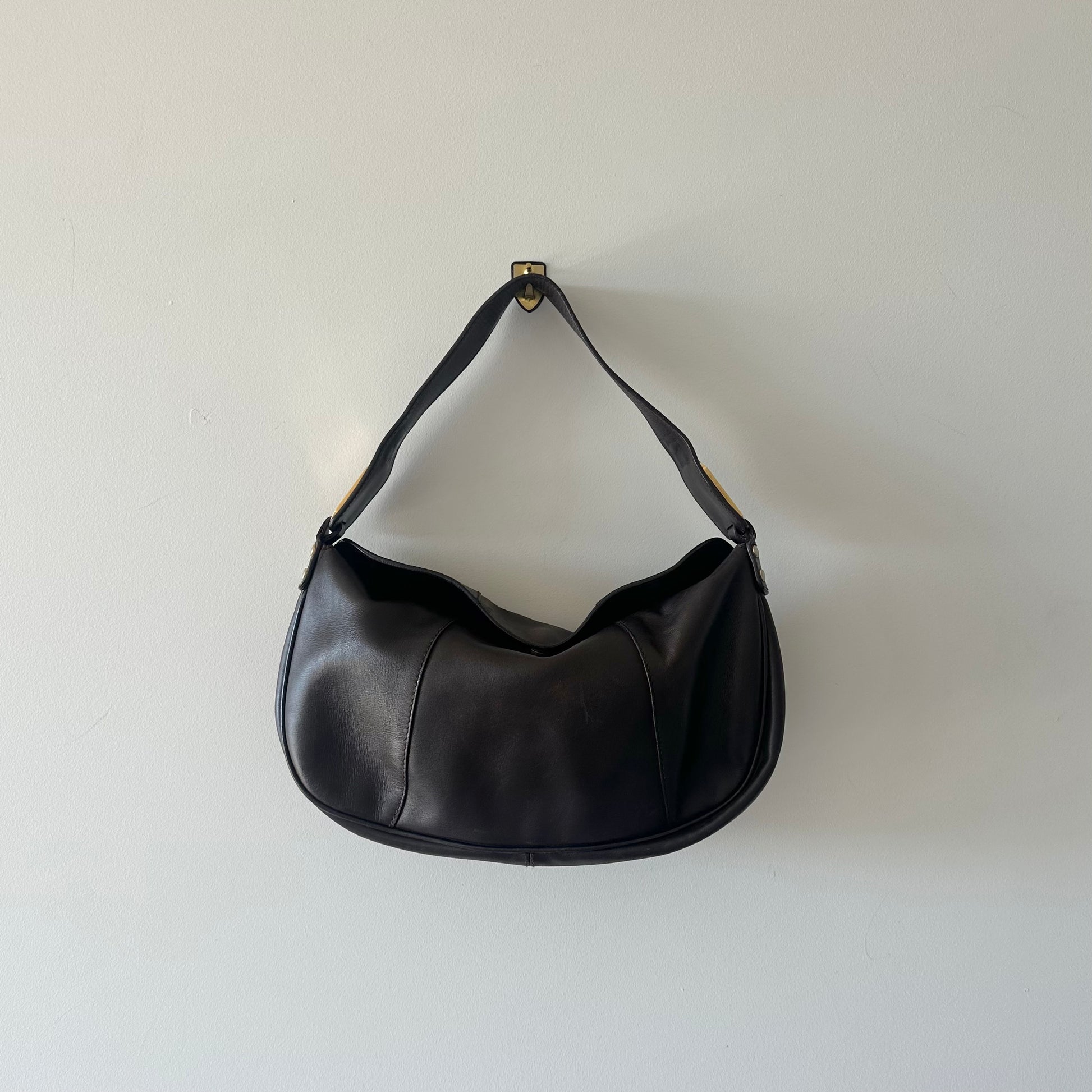 The sweetest brown leather crescent bag by Dolce & Gabbana. Gorgeous gold hardware with a 'D' and a 'G' on wither end of the strap. Clasp closure. Slouches perfectly.