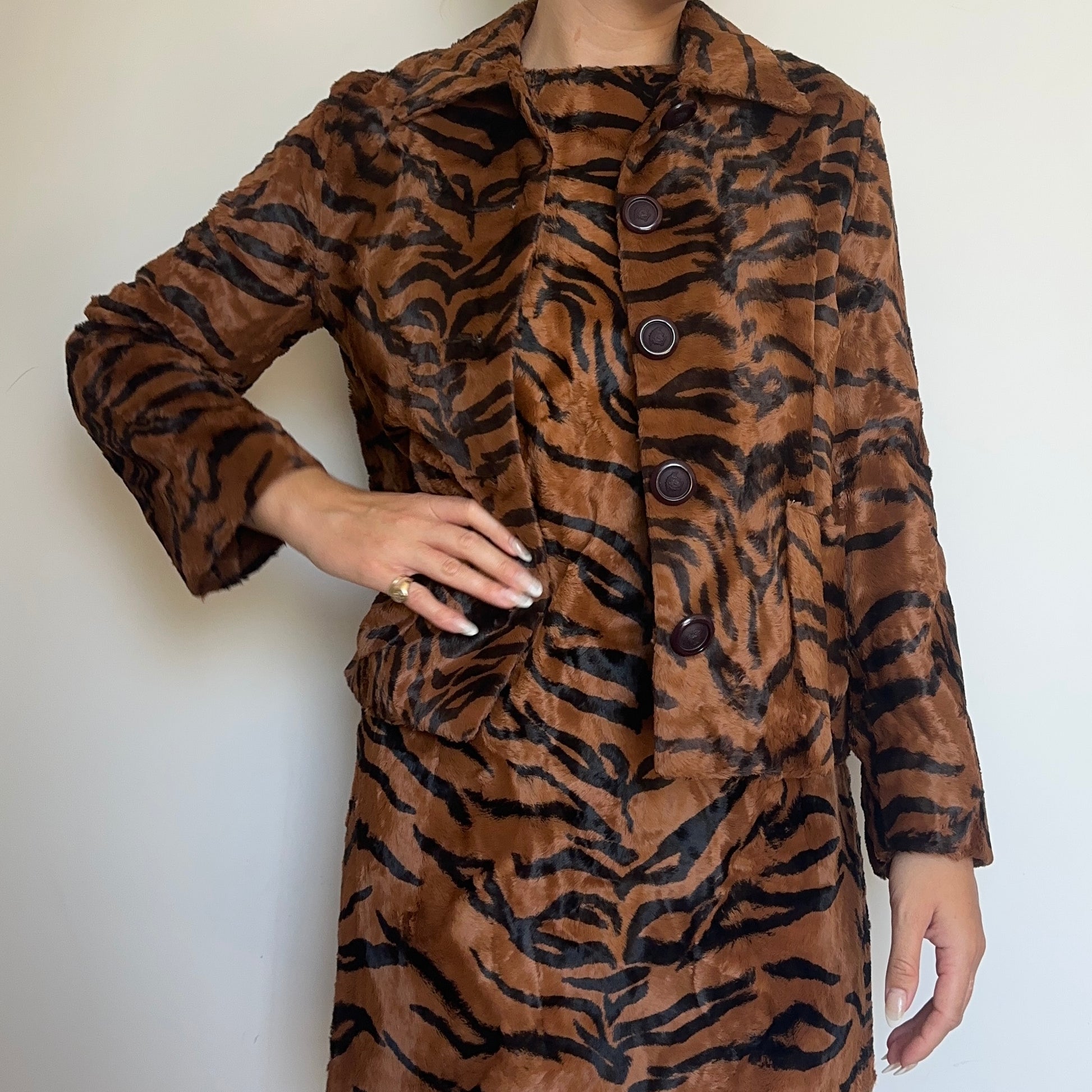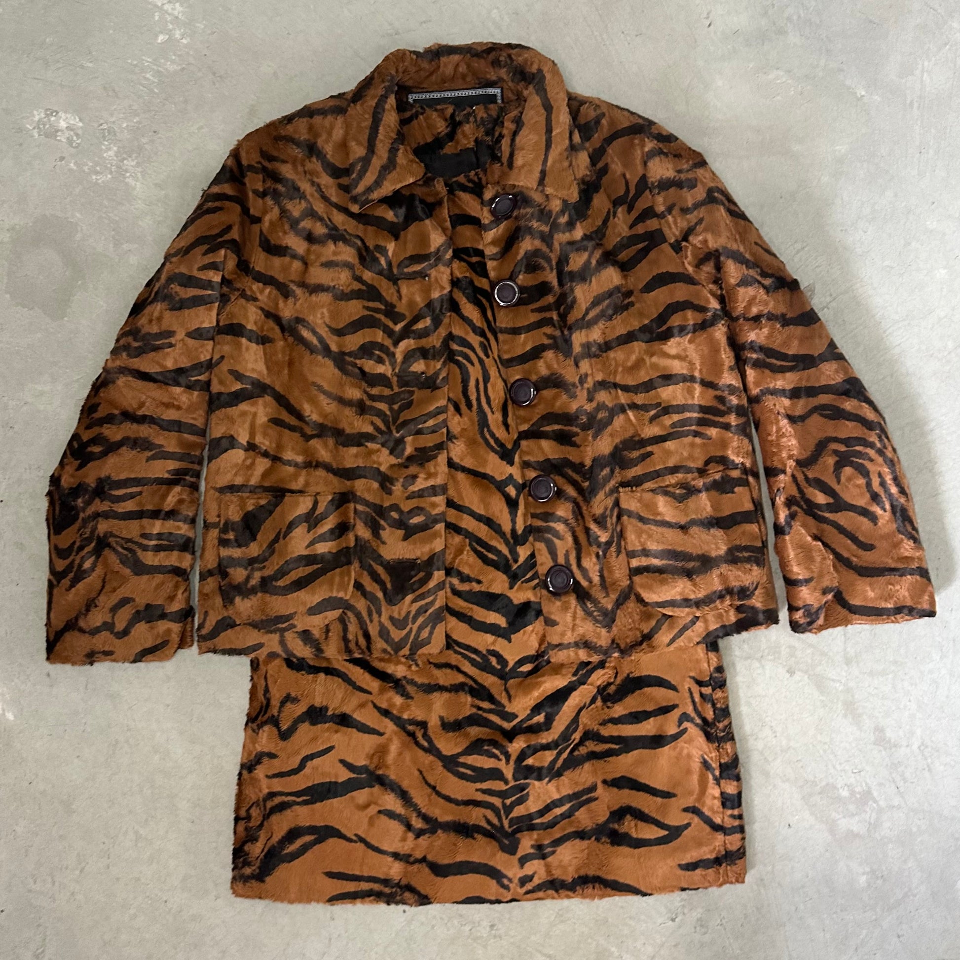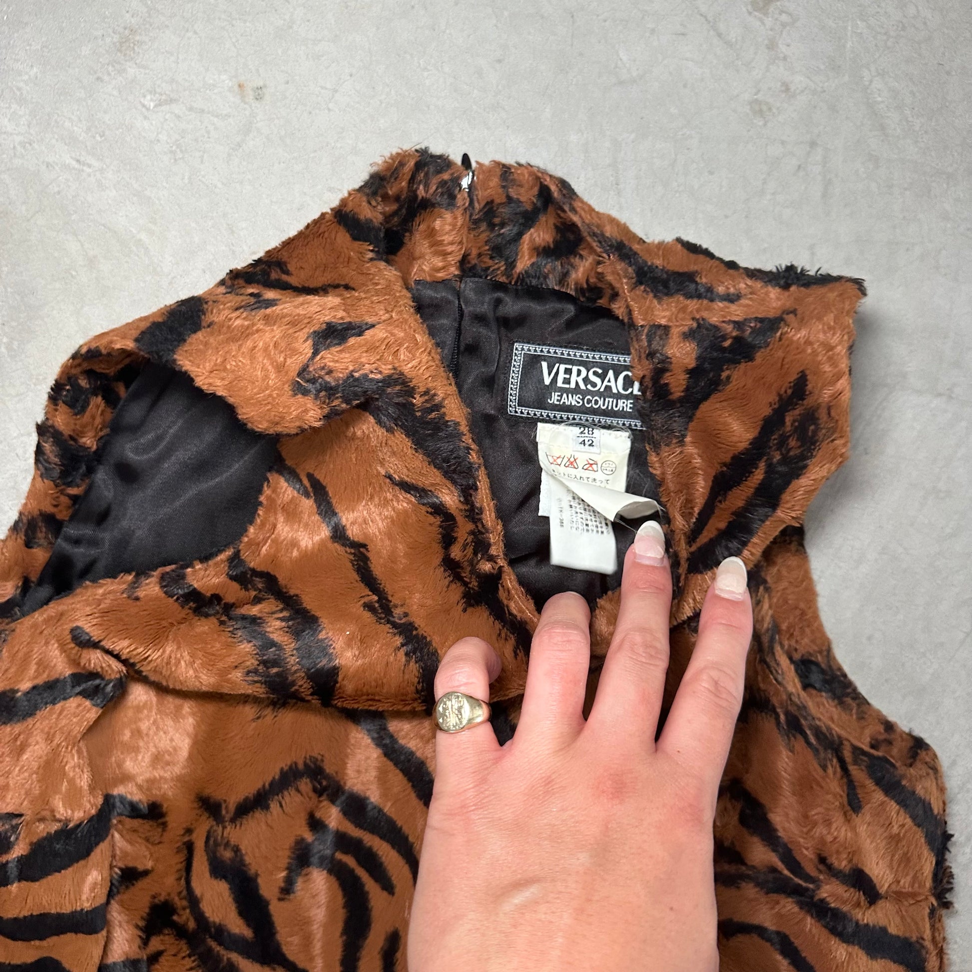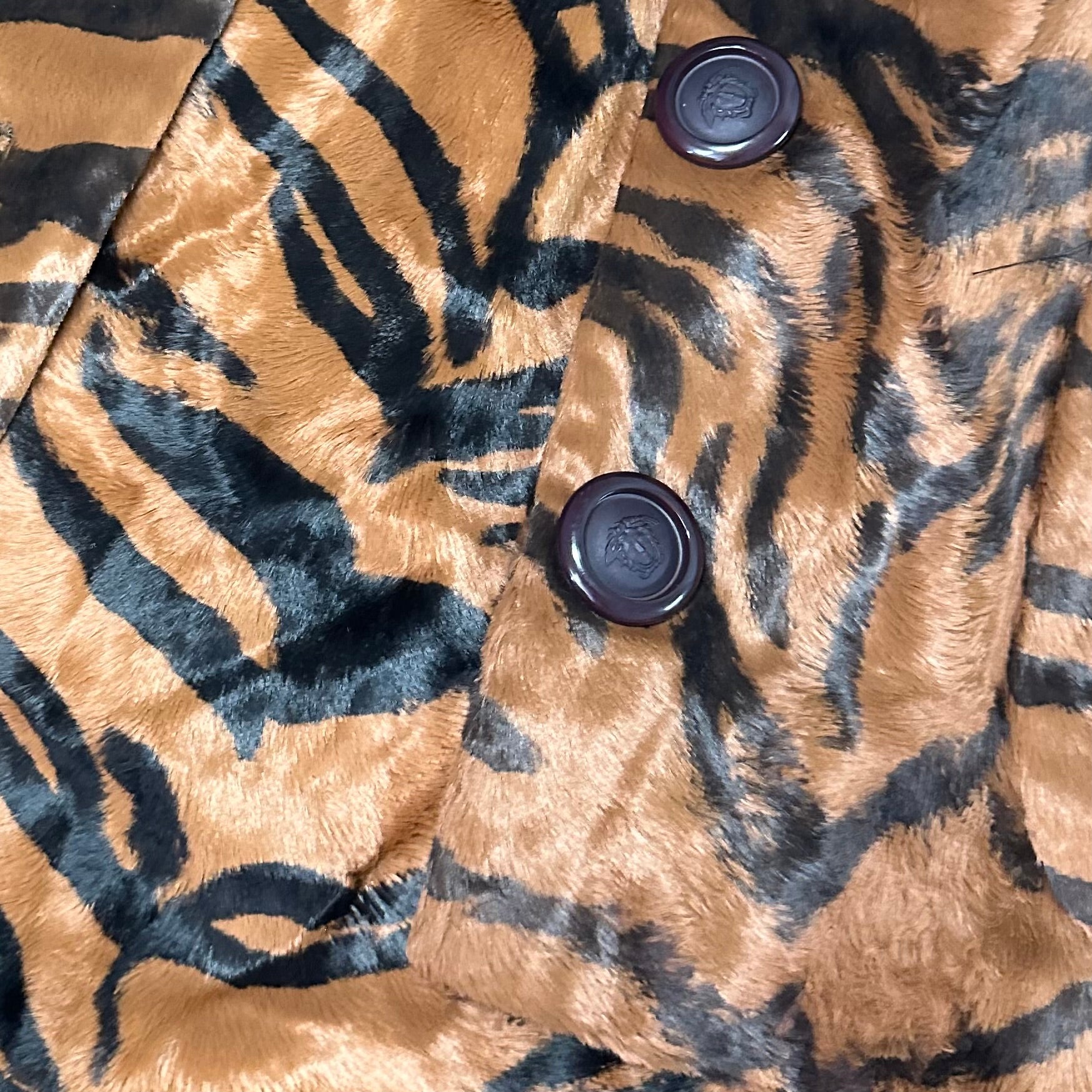 The most incredible Versace faux fur tiger dress and jacket set. The most luscious and soft faux fur I’ve ever felt. Jacket features Medusa logo buttons and quilted lining. Dress has a 60’s shape with a high neck and mini length.