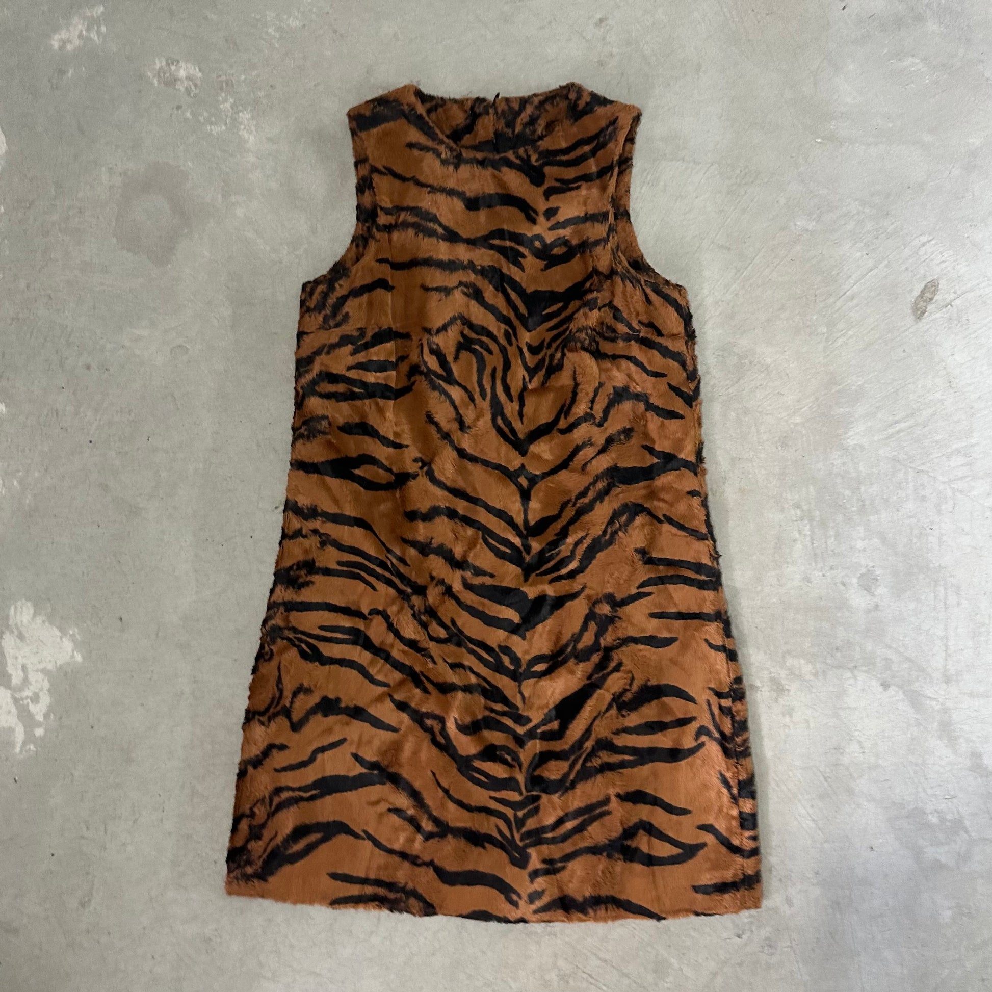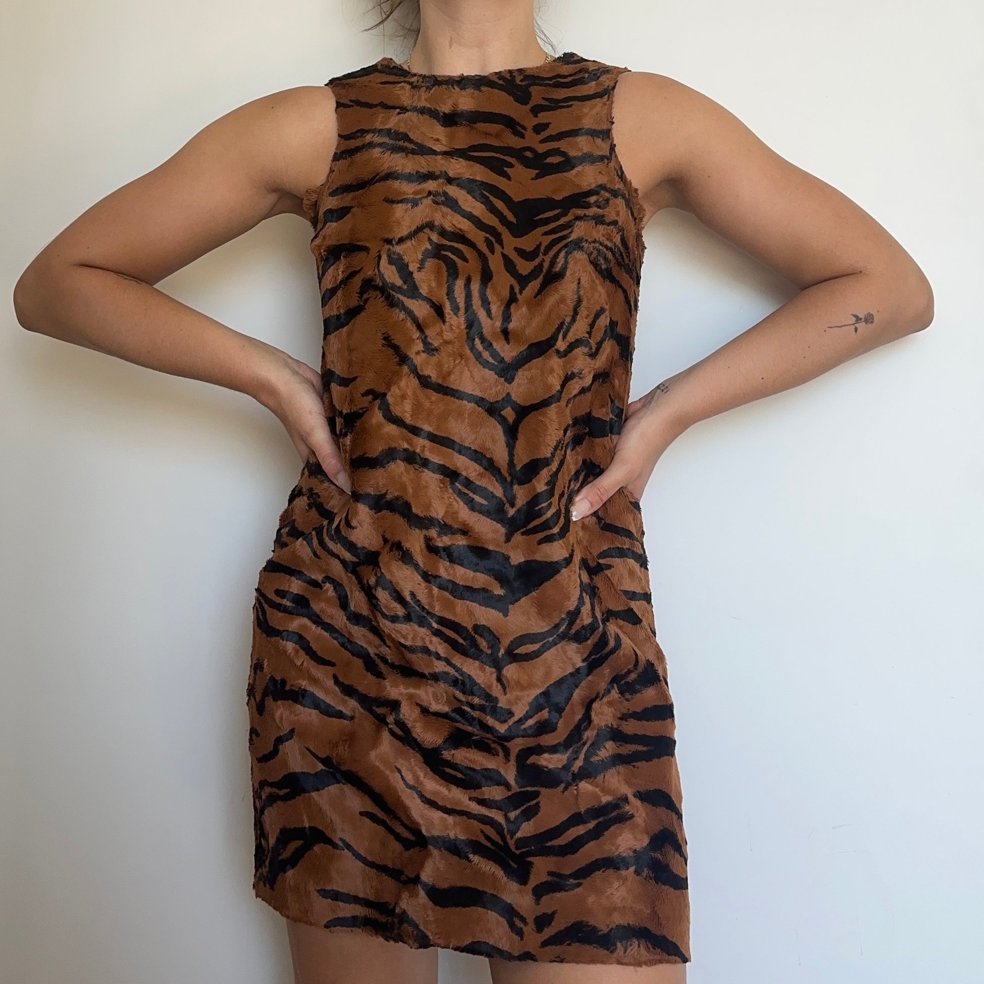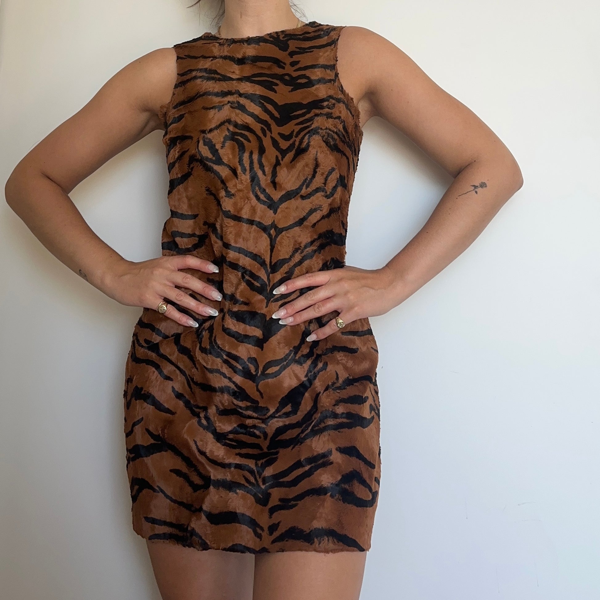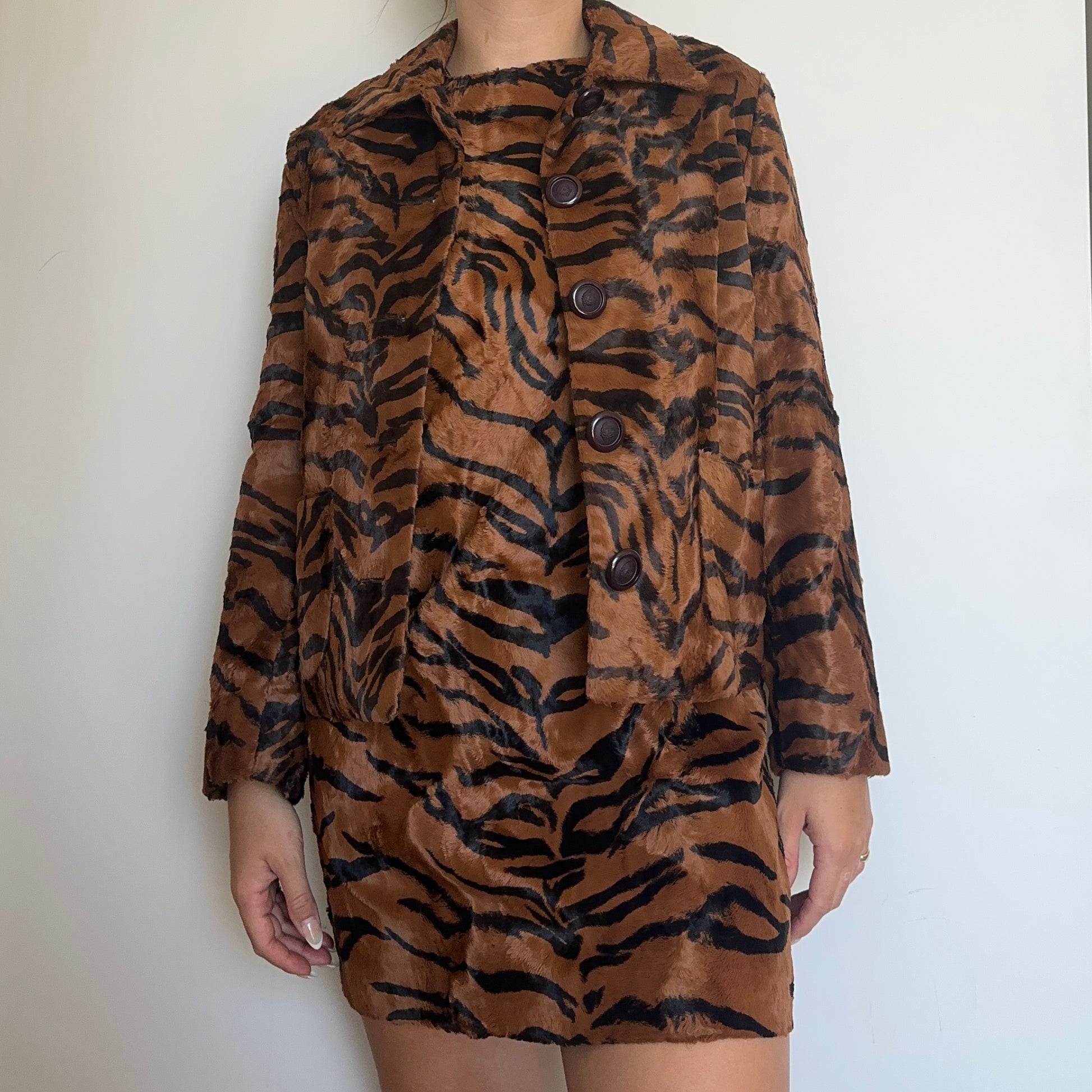 The most incredible Versace faux fur tiger dress and jacket set. The most luscious and soft faux fur I’ve ever felt. Jacket features Medusa logo buttons and quilted lining. Dress has a 60’s shape with a high neck and mini length.