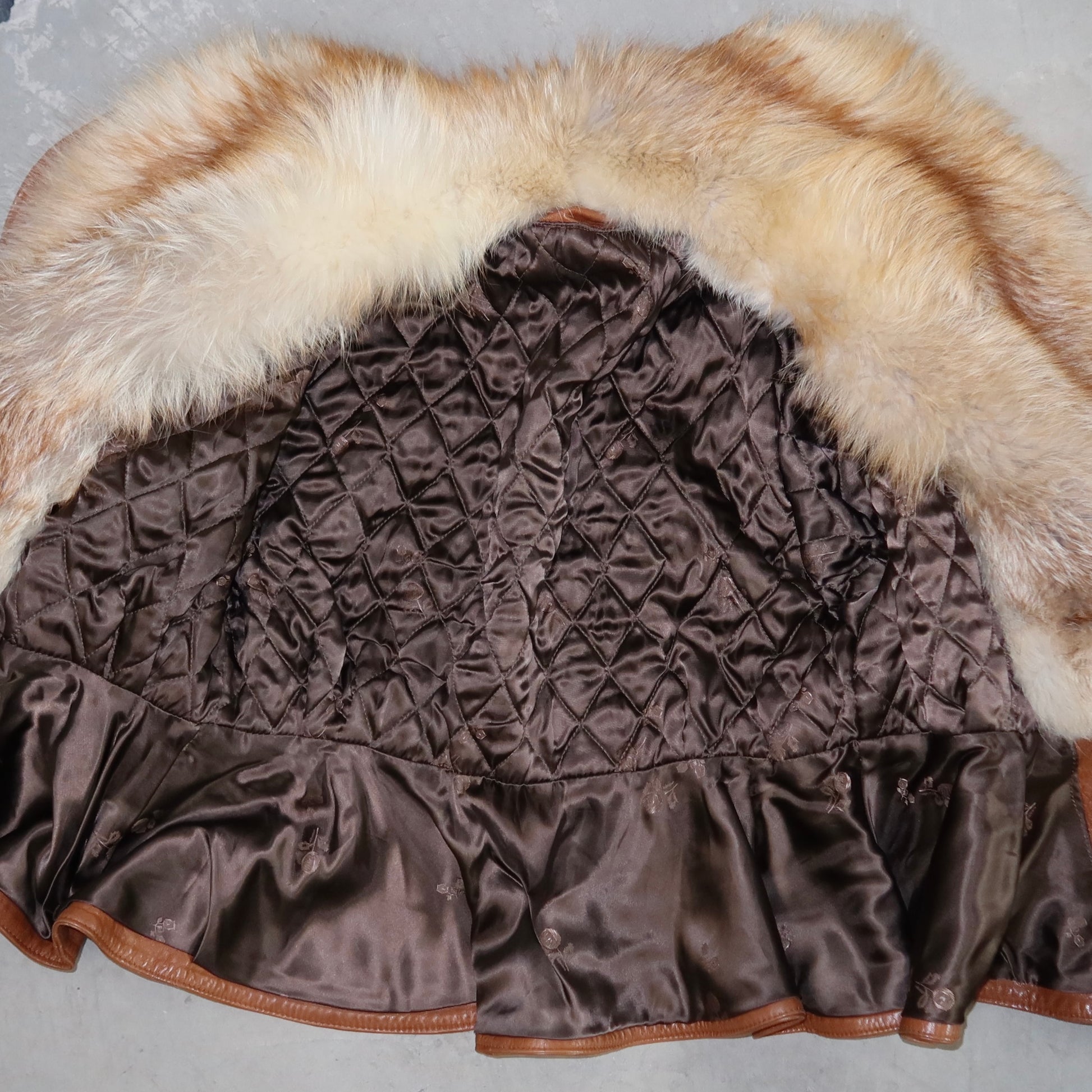 Gorgeous vintage tan leather jacket with exaggerated real fox fur collar and cozy quilted lining. The shape indicates it's from the 80's but could be newer.
