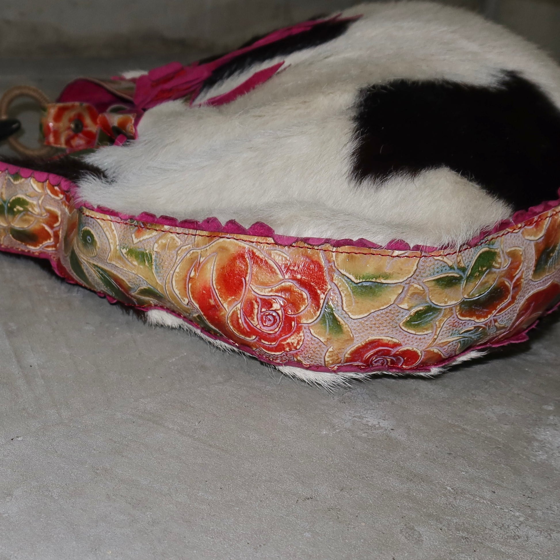 Breathtaking vintage cowhide bag with raised floral-embroidered coloured leather border. Horn shaped handle (not real horn). Cowhide is soft and fluffy. Bag is incredibly well made.