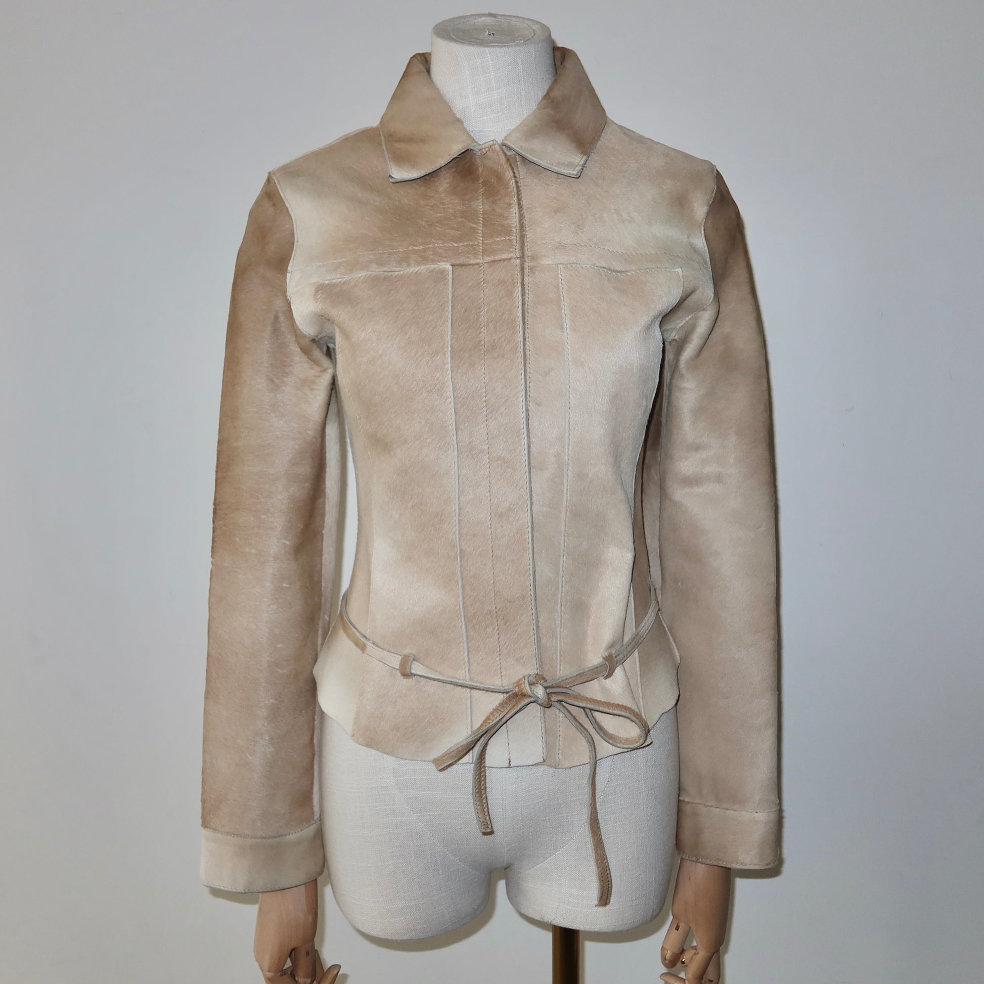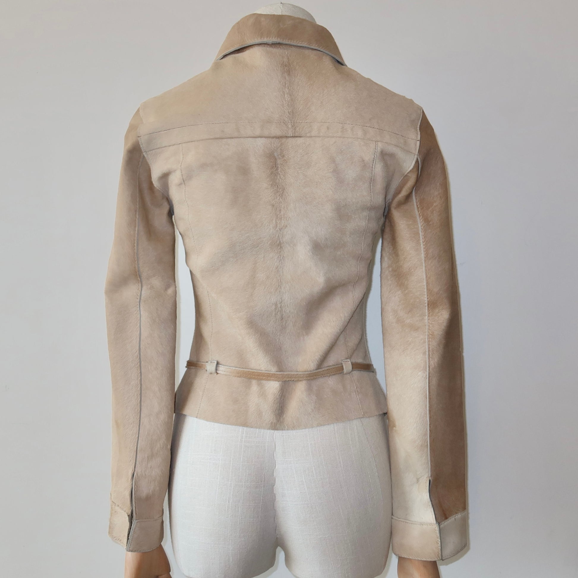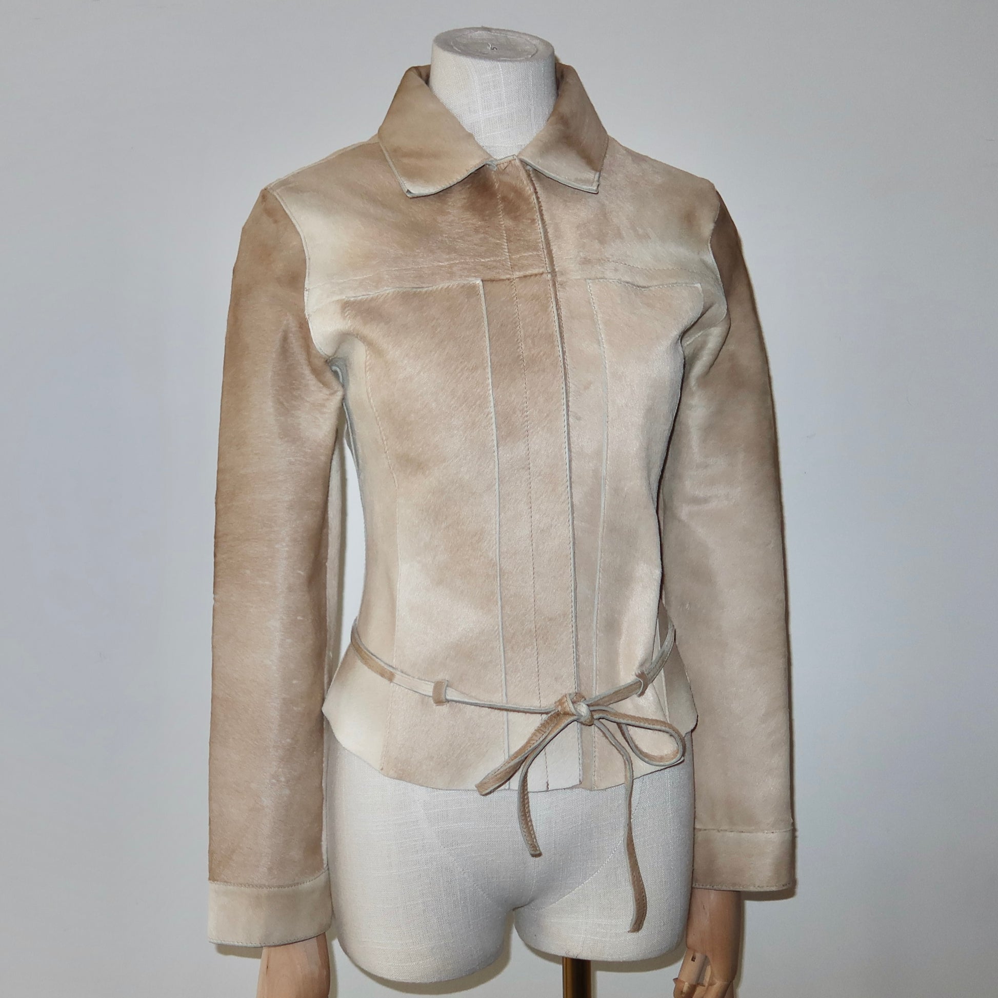 Stunning light beige vintage cowhide structured jacket. Very fitted. Features a hook and eye closure and skinny waist belt.