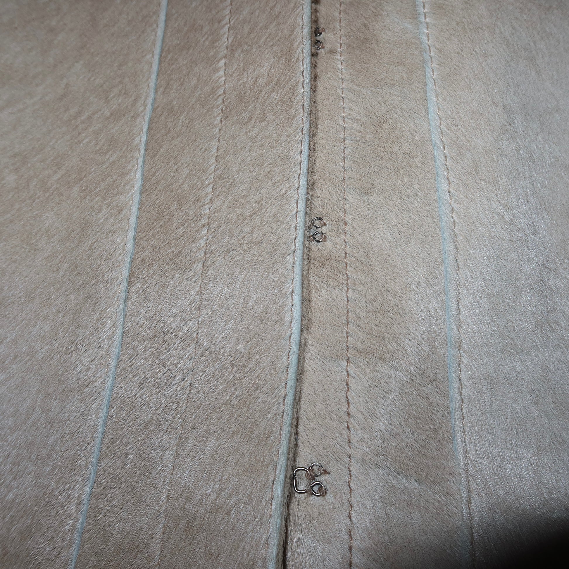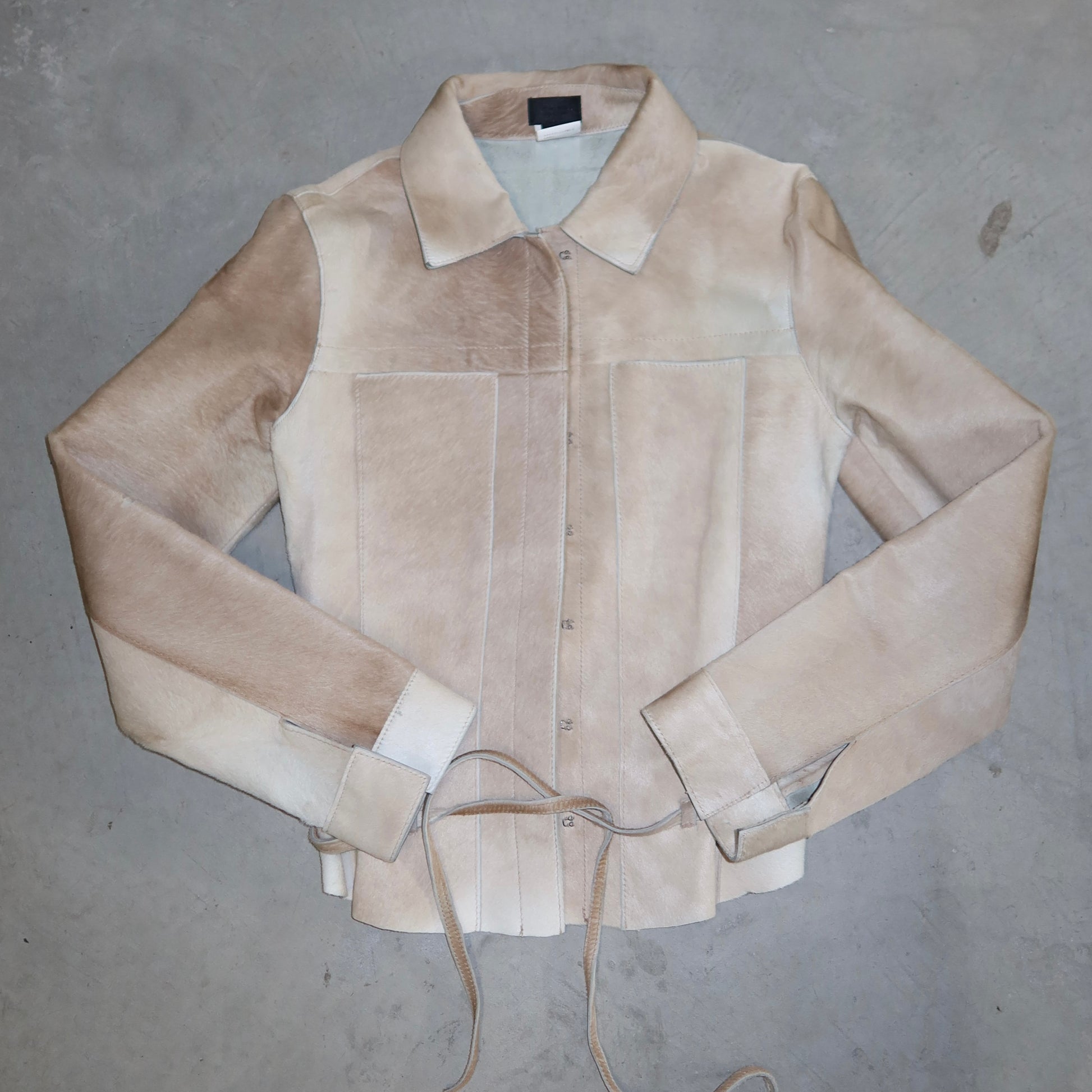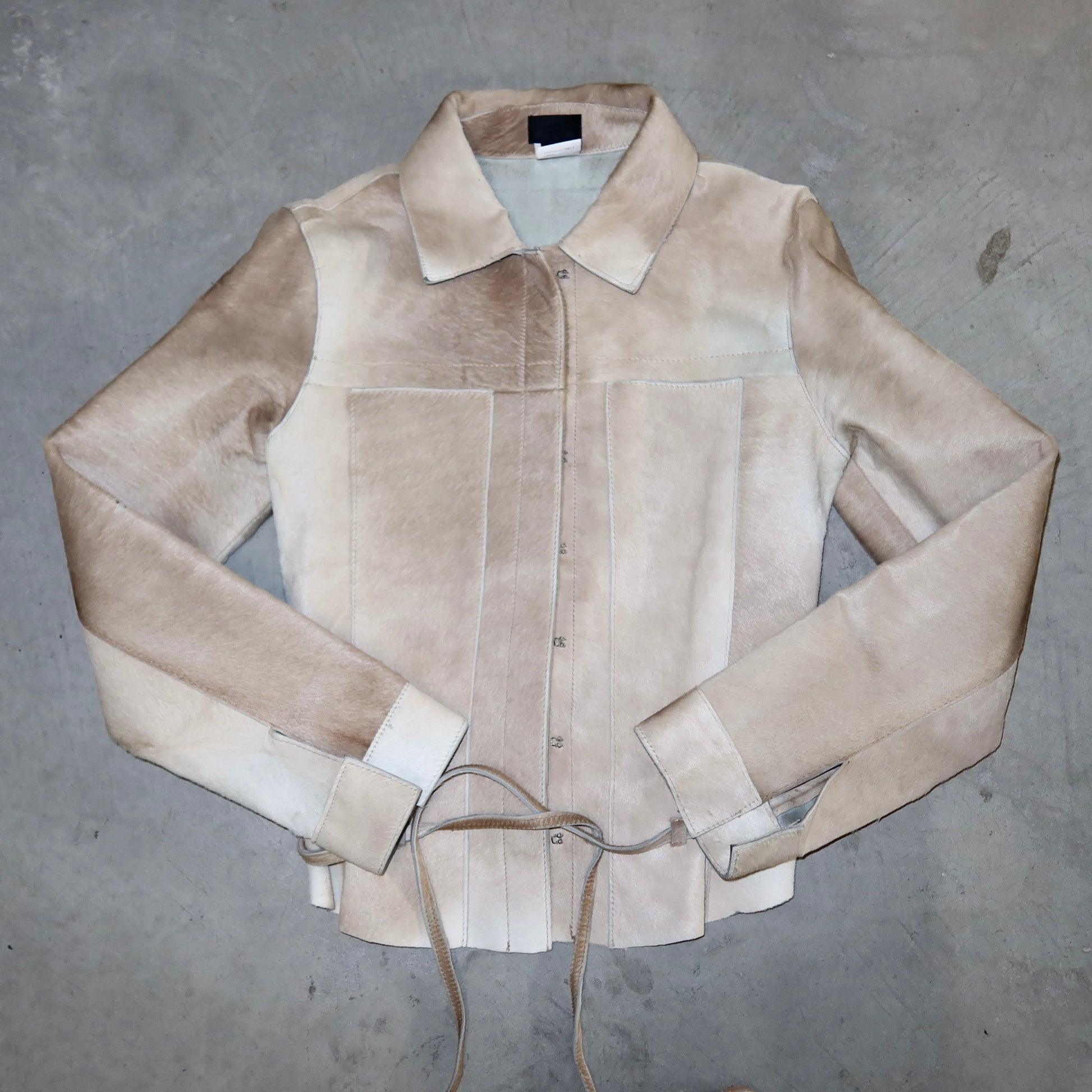 Stunning light beige vintage cowhide structured jacket. Very fitted. Features a hook and eye closure and skinny waist belt.