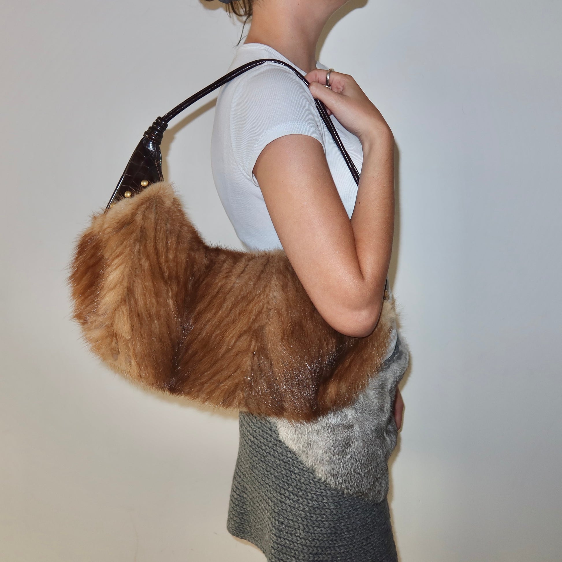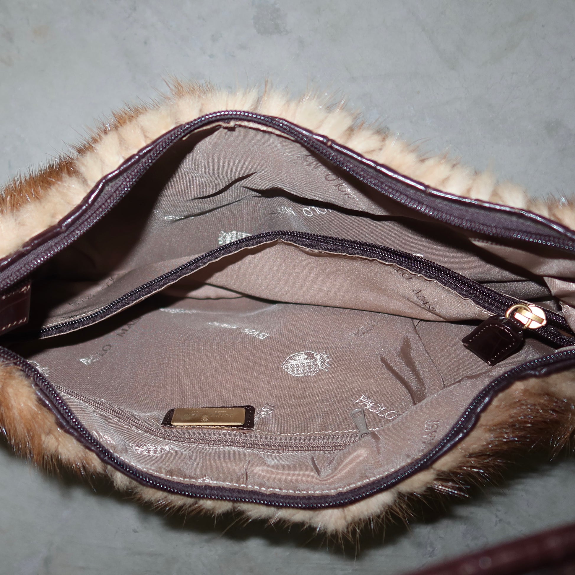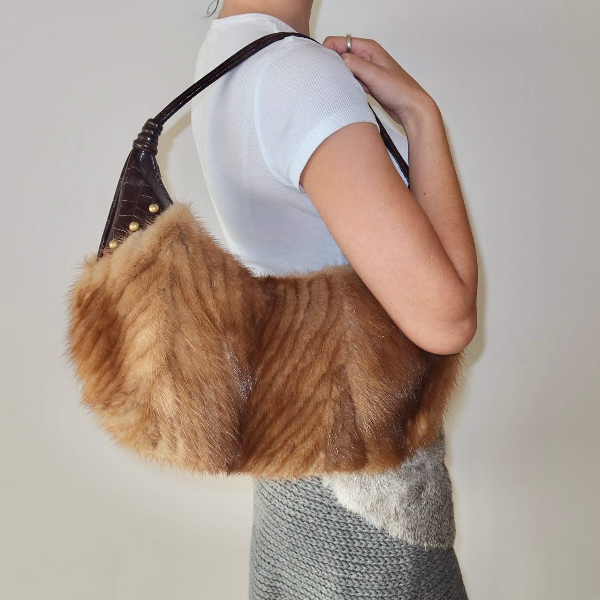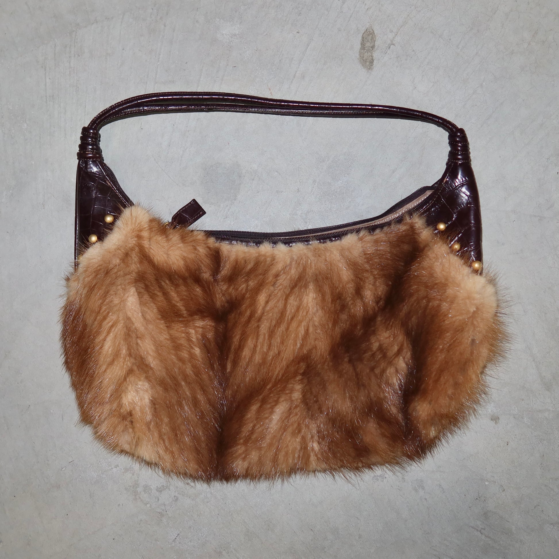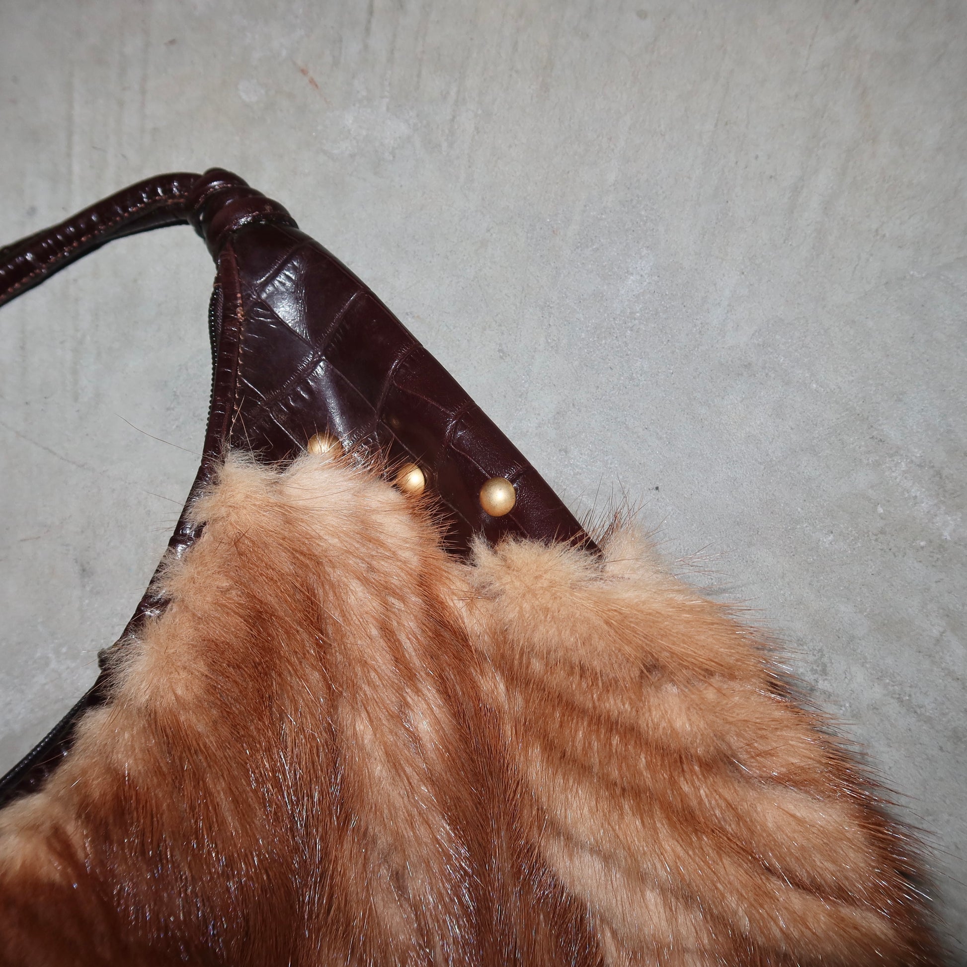 Gorgeous mink fur bag with brown alligator-style leather accents and gold studs. Made in Italy.