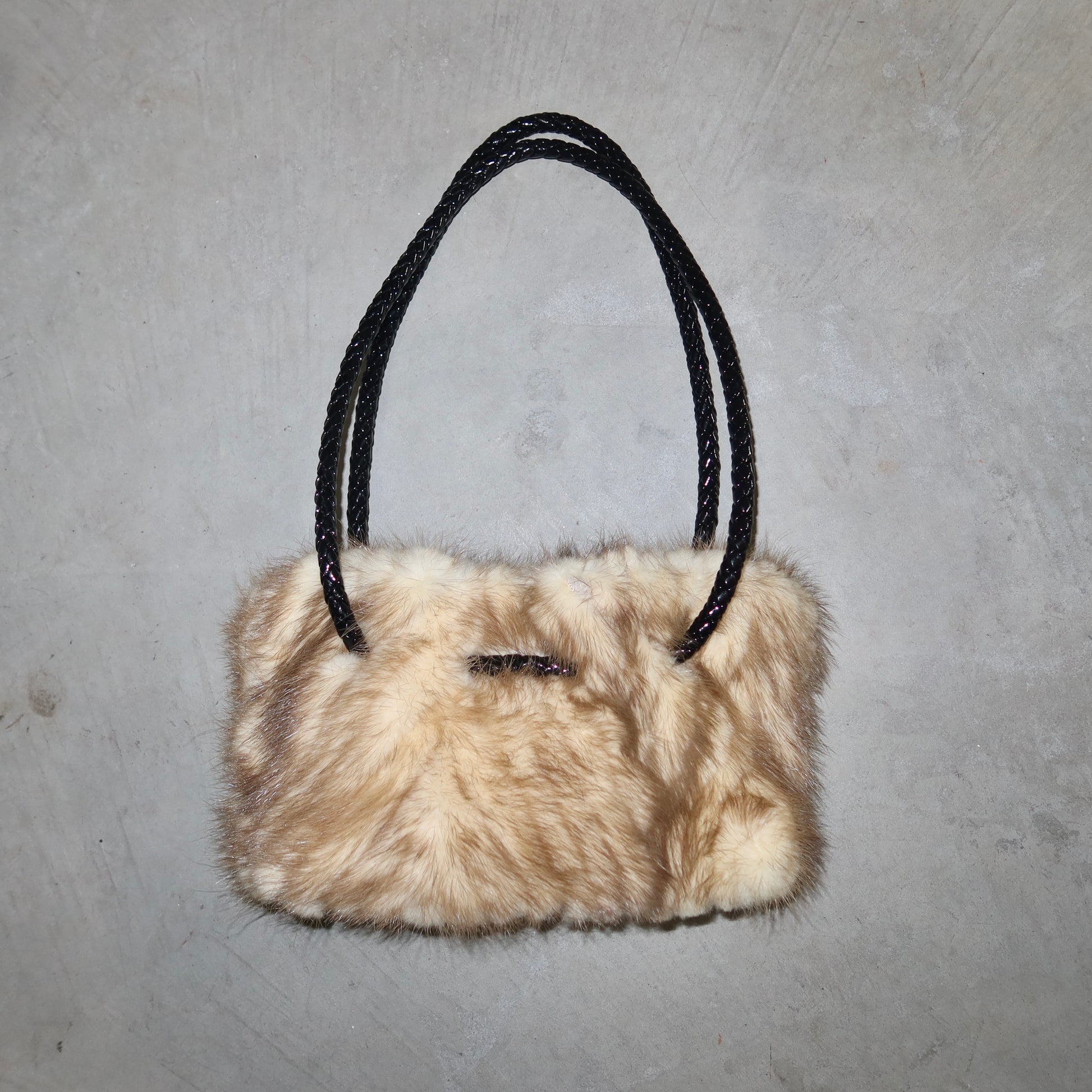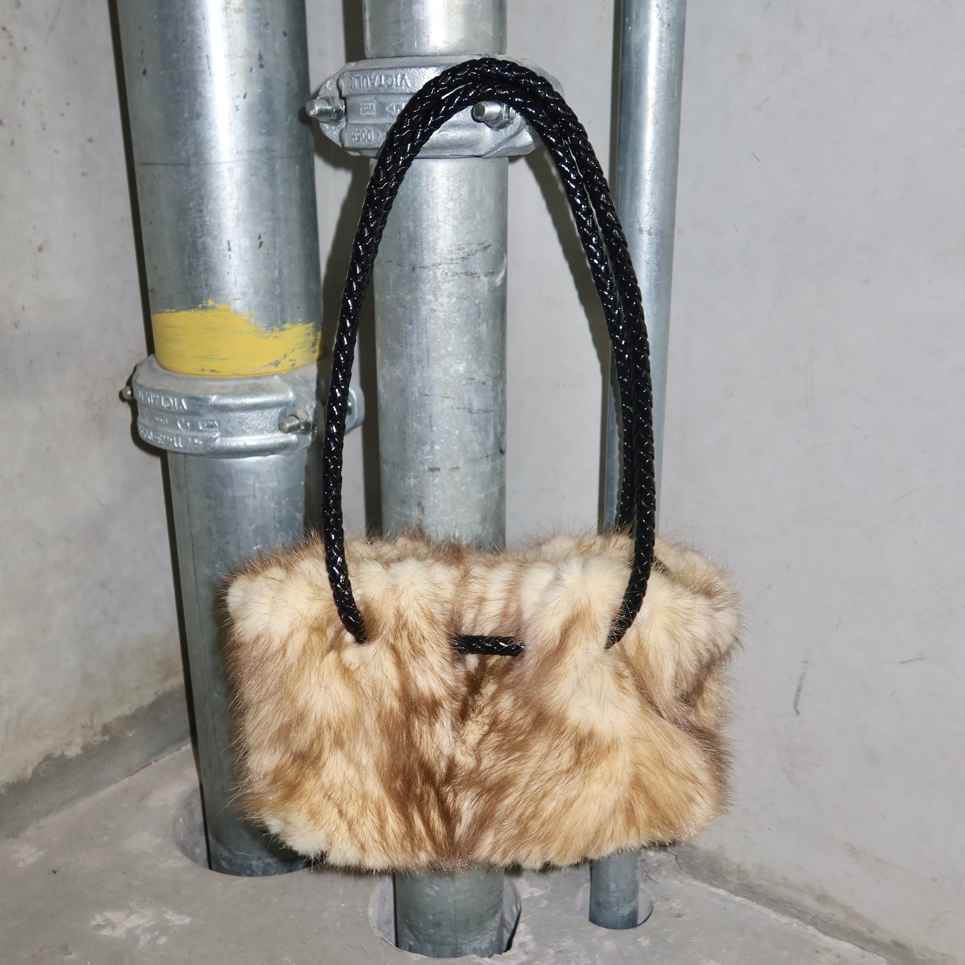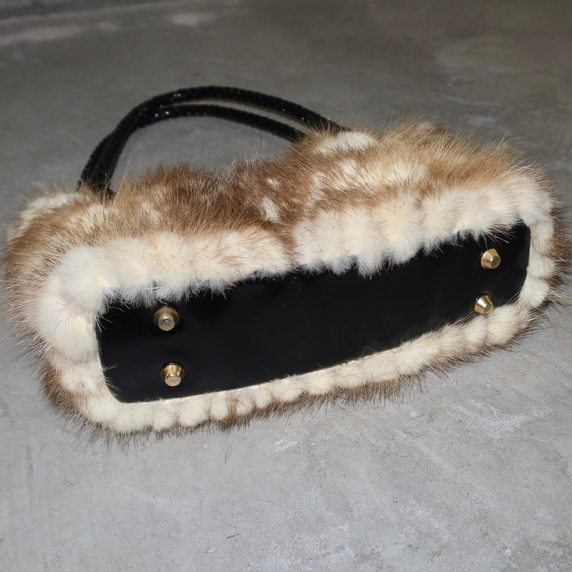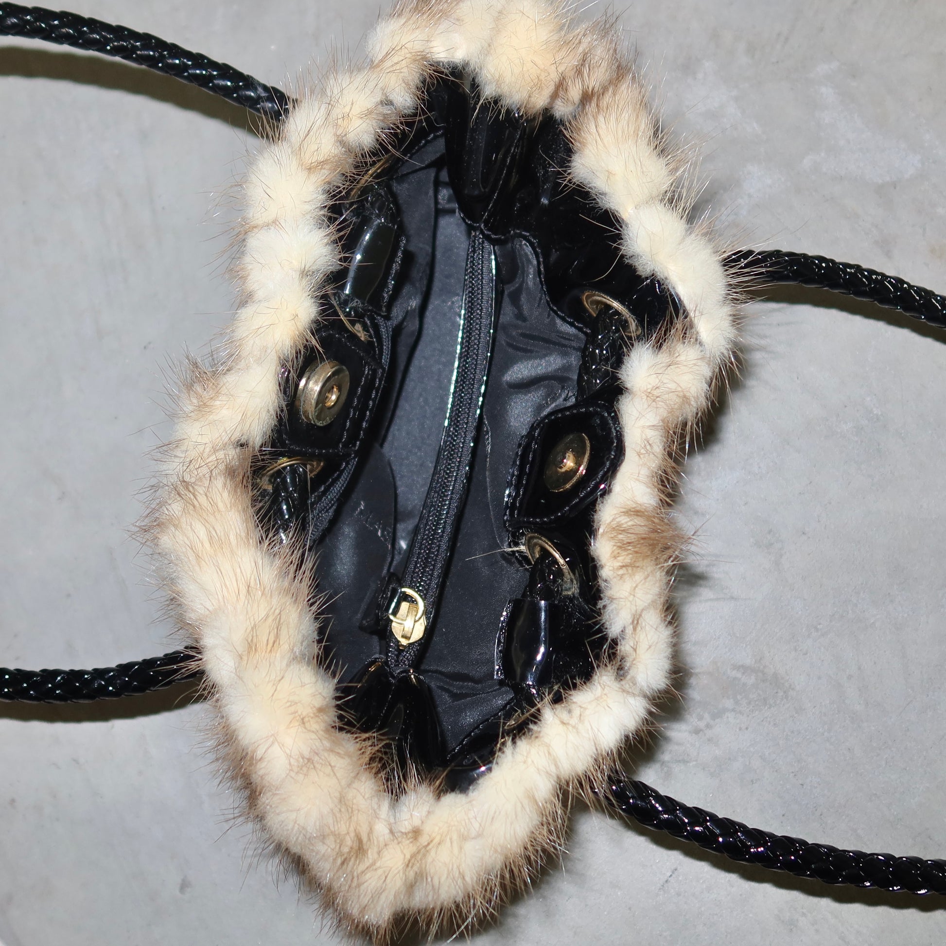 Gorgeous mini real mink fur bag. Braided leather handle and patent black accents at the base and interior. Made in Italy.