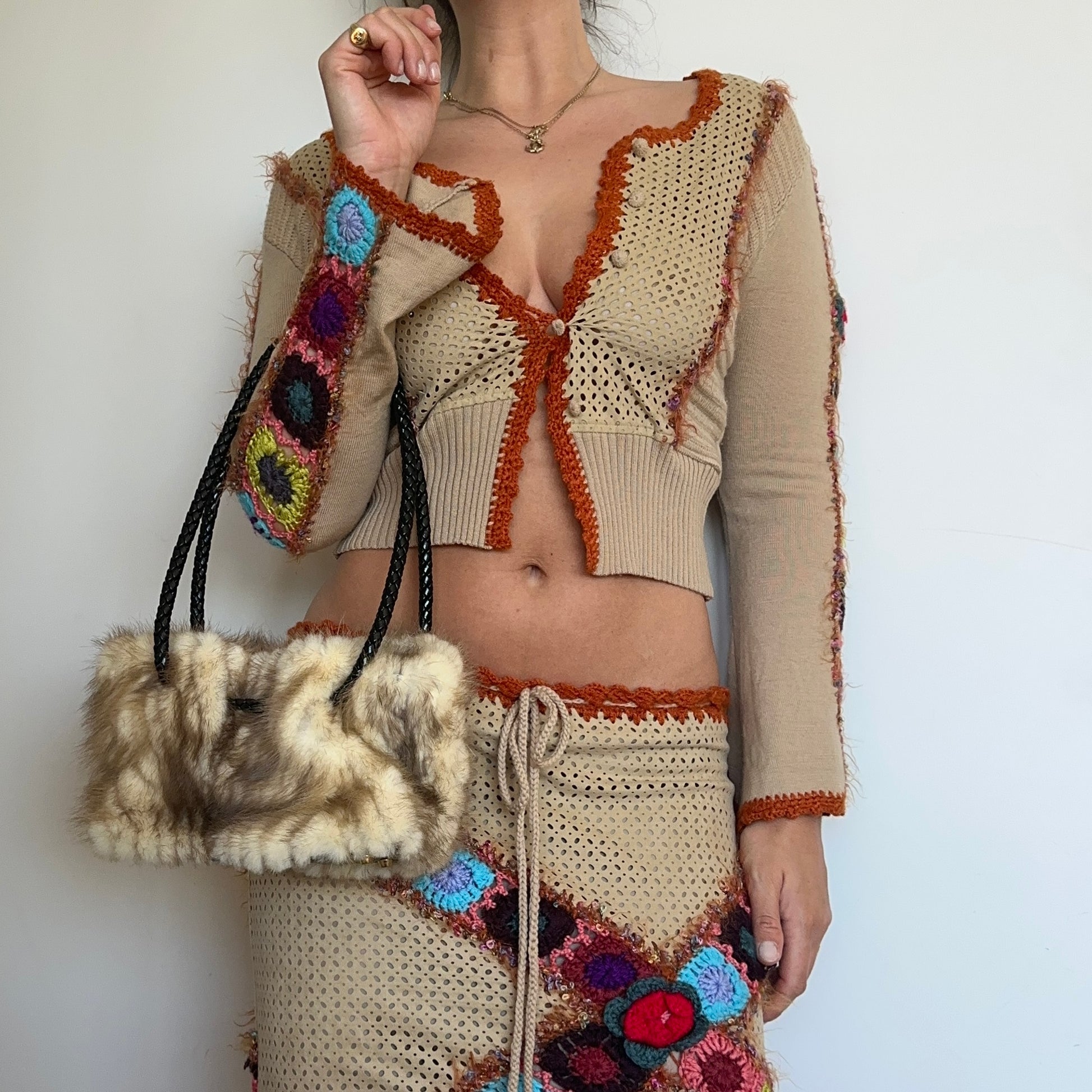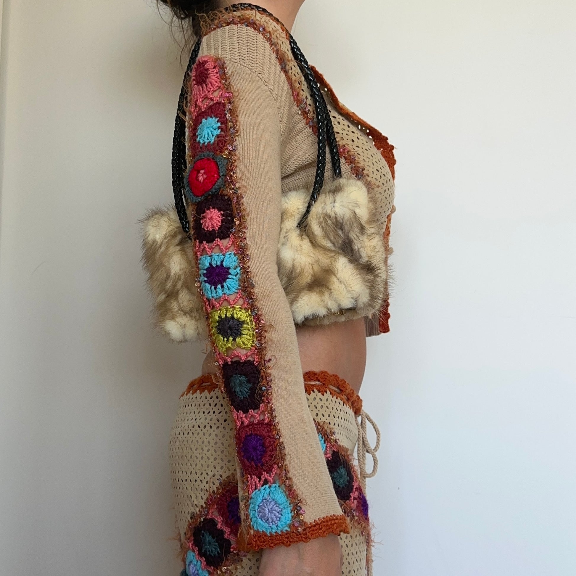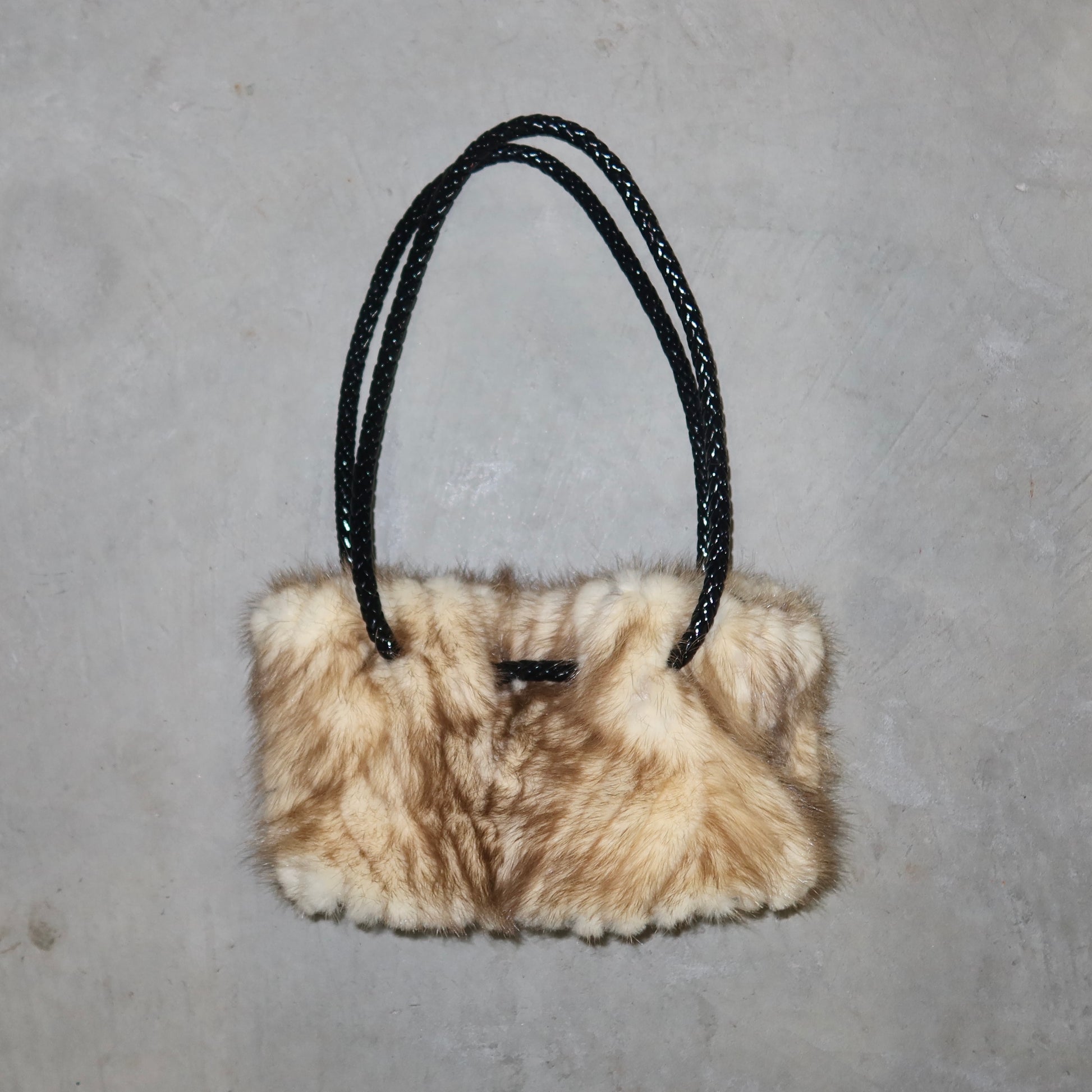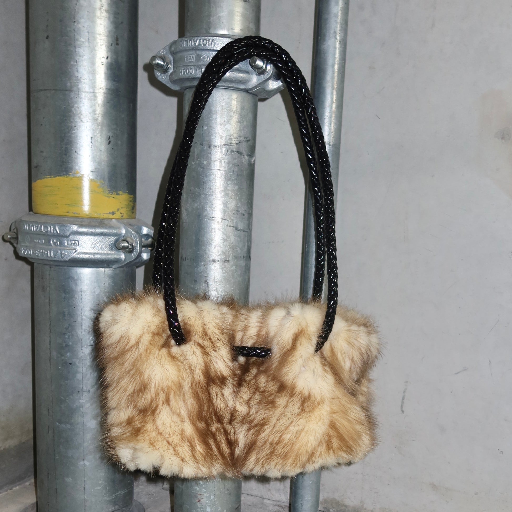 Gorgeous mini real mink fur bag. Braided leather handle and patent black accents at the base and interior. Made in Italy.