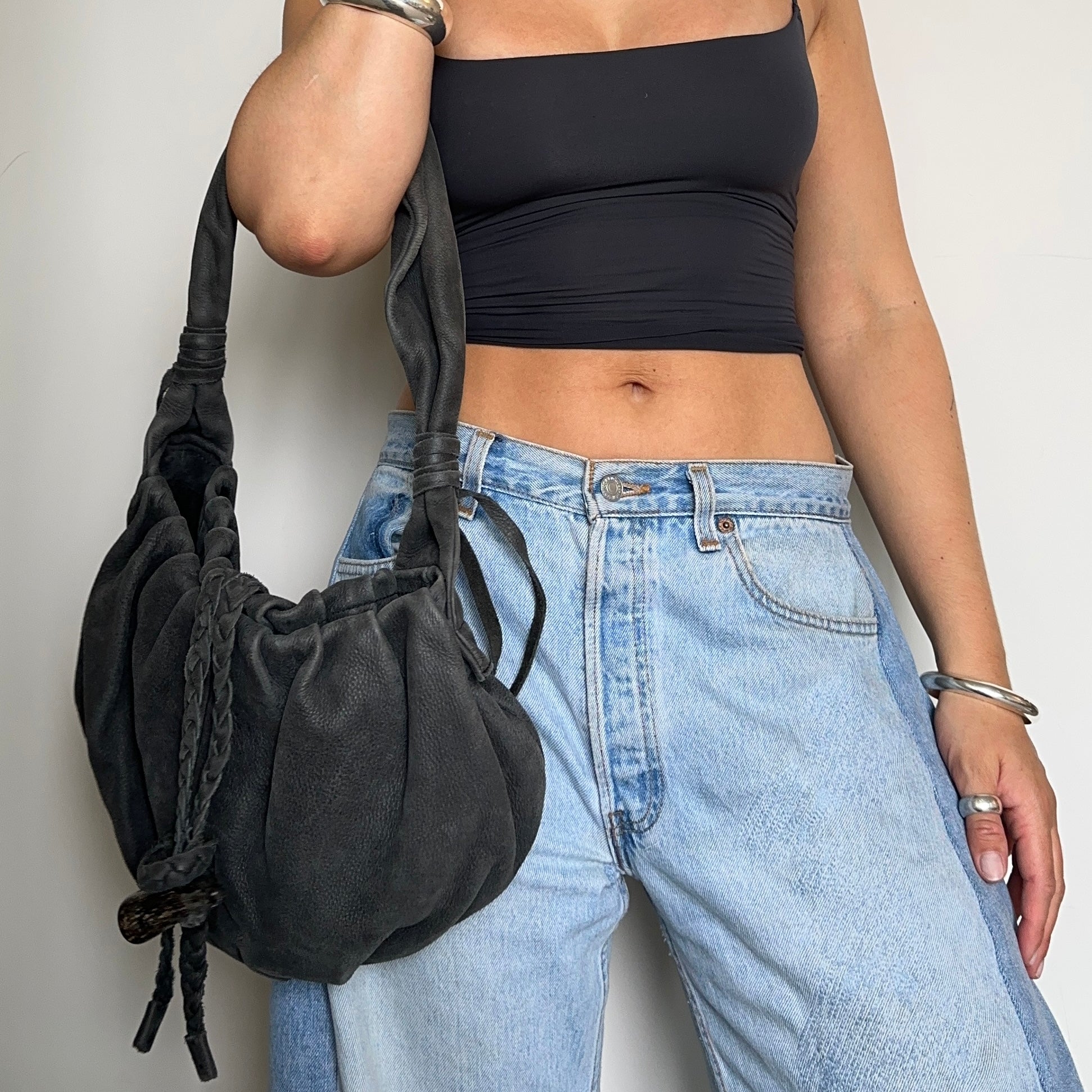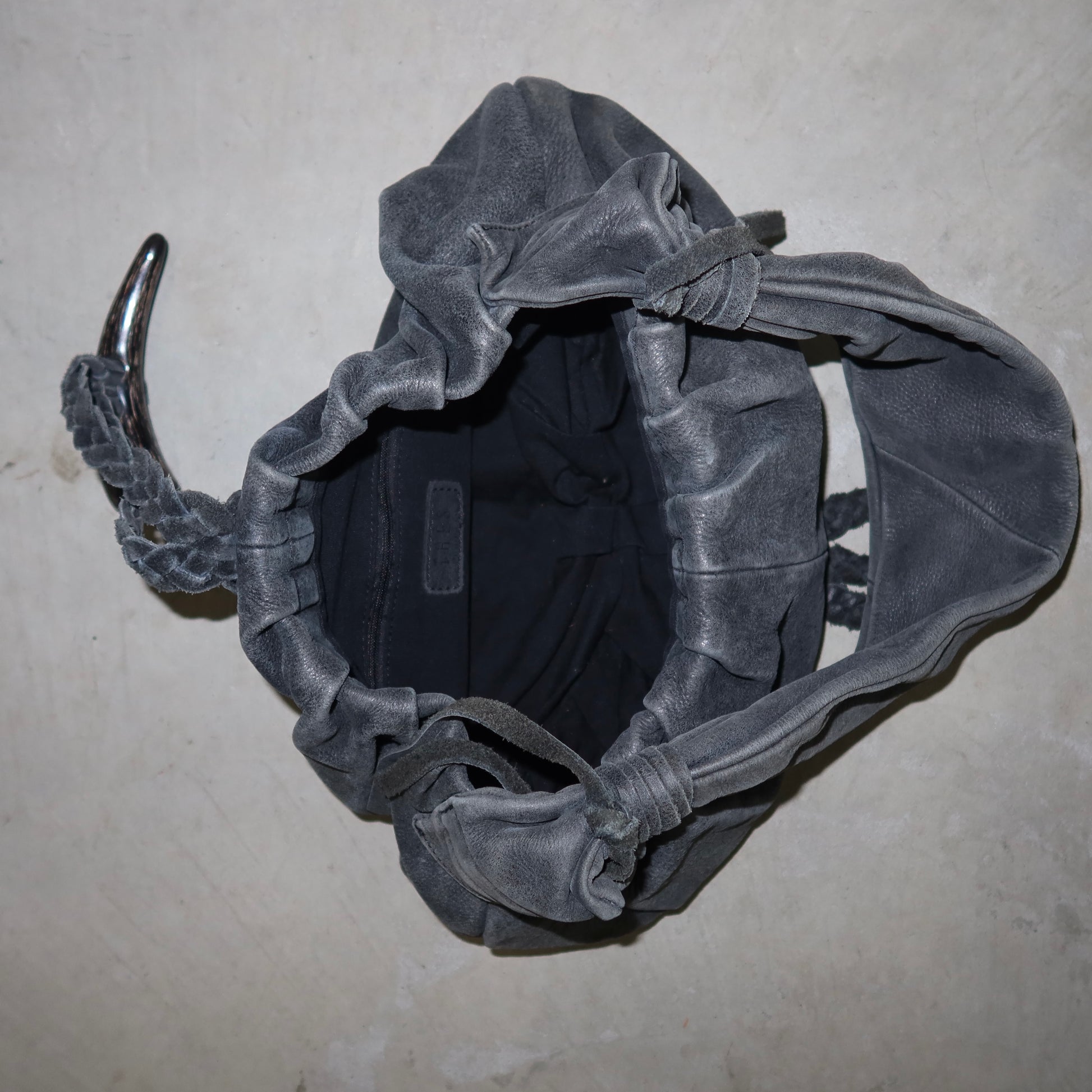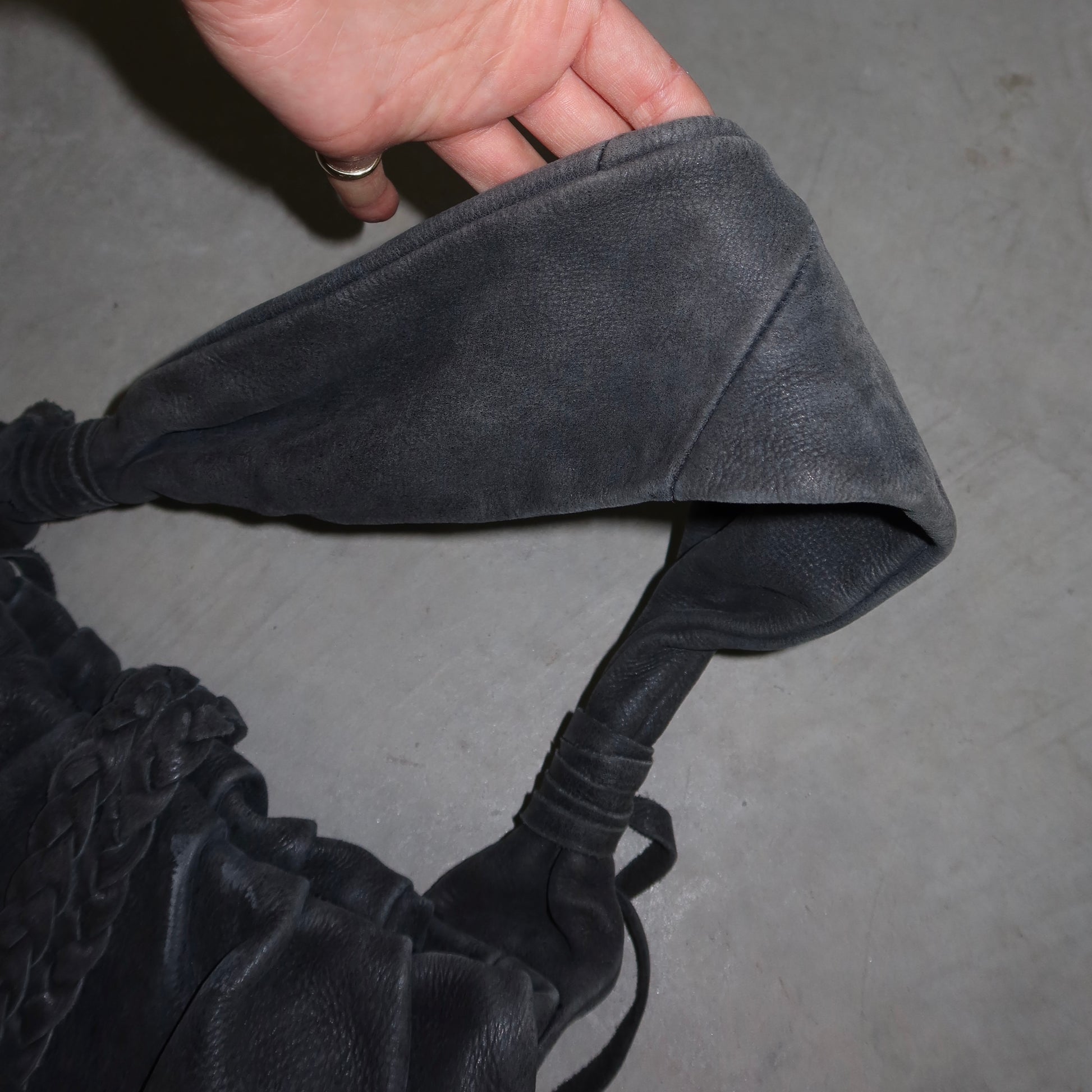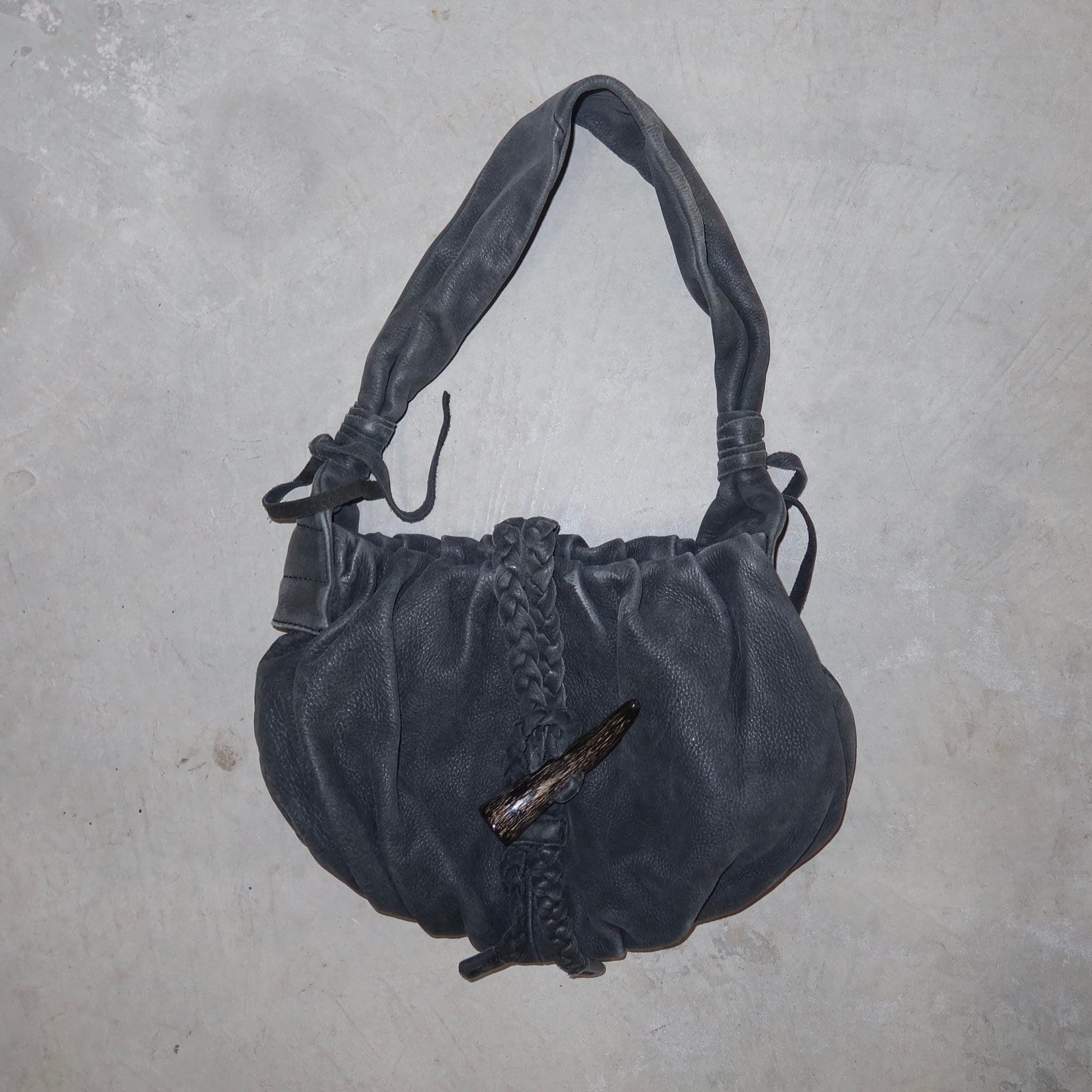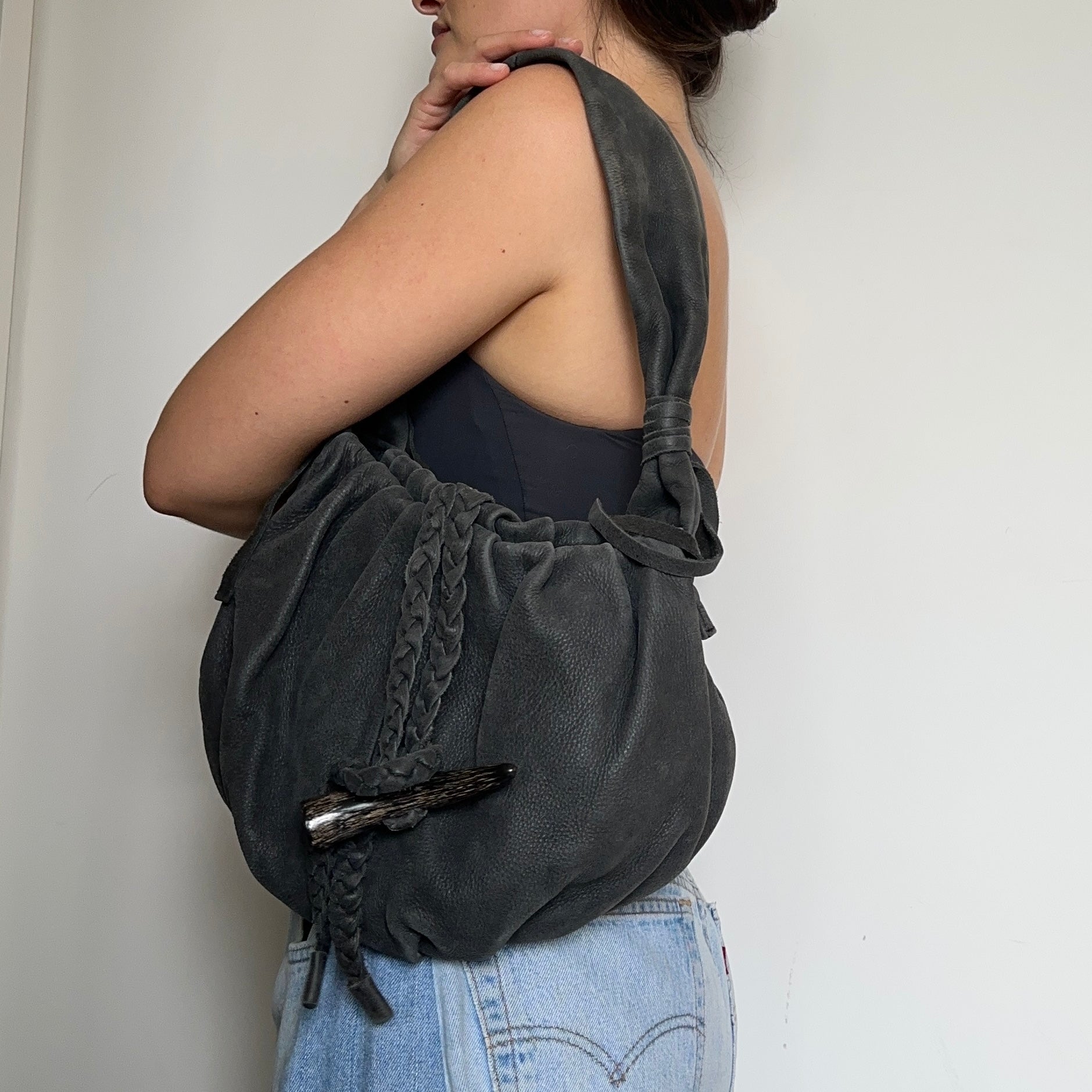 Gorgeous thick leather bag with braided leather and synthetic horn closure detail. This is the larger size.