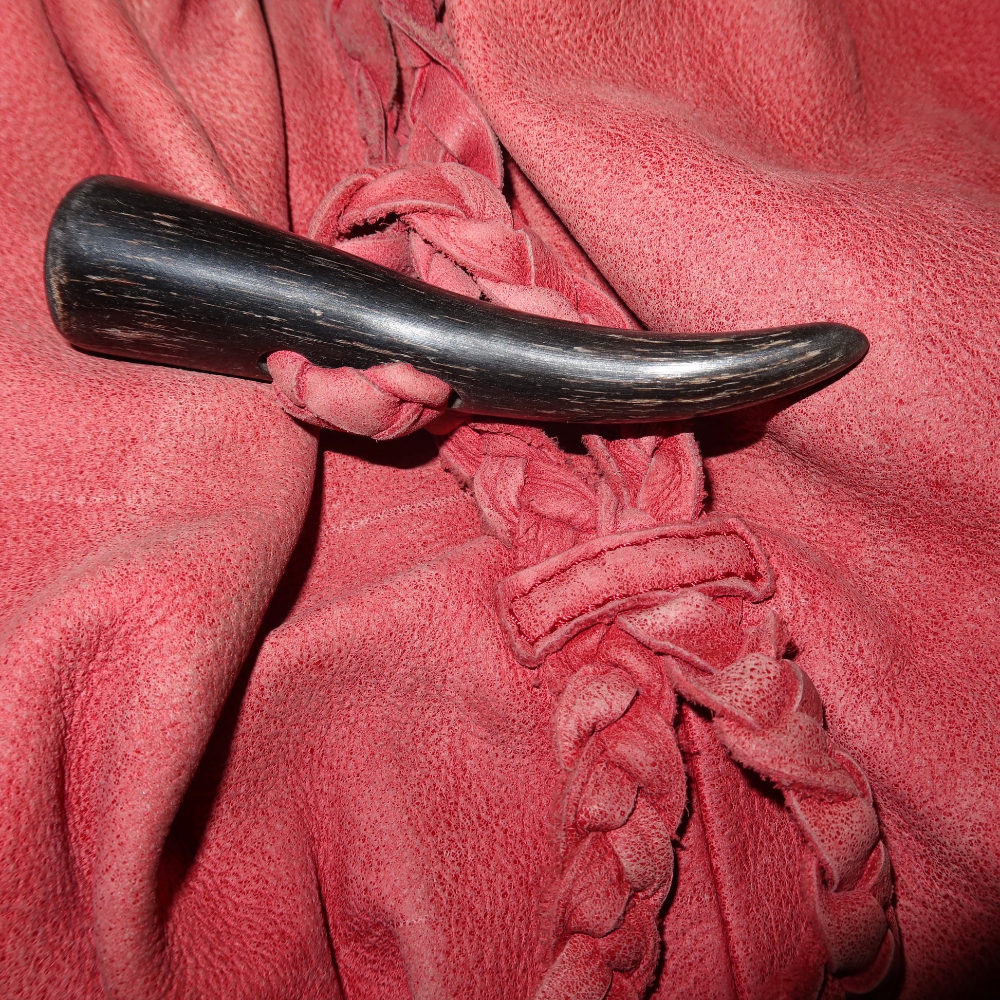 Gorgeous thick leather bag with braided leather and synthetic horn closure detail. By a Japanese brand. Rare faded red colourway.