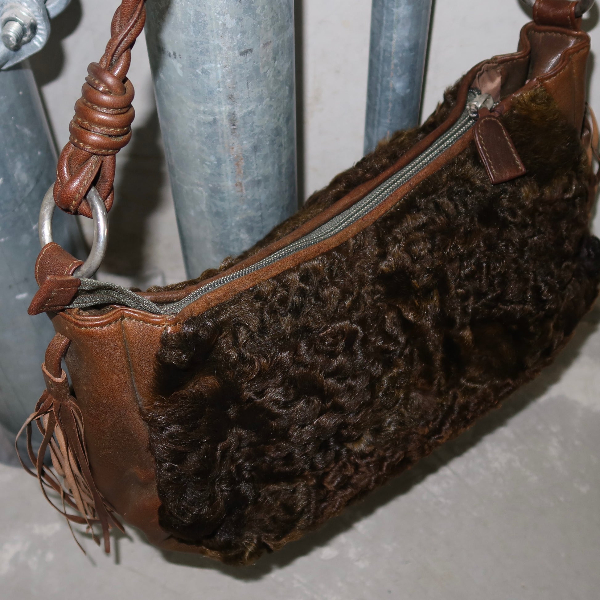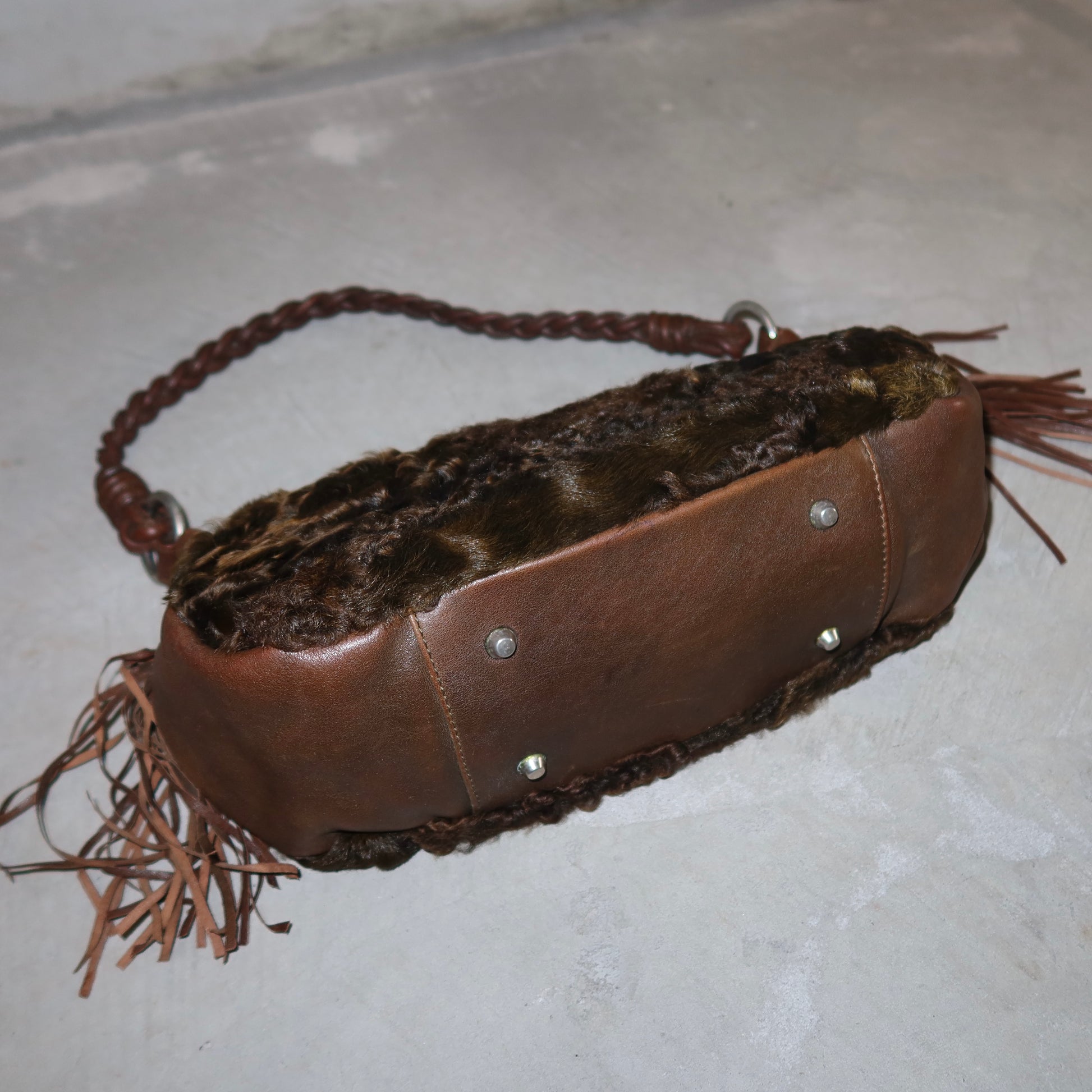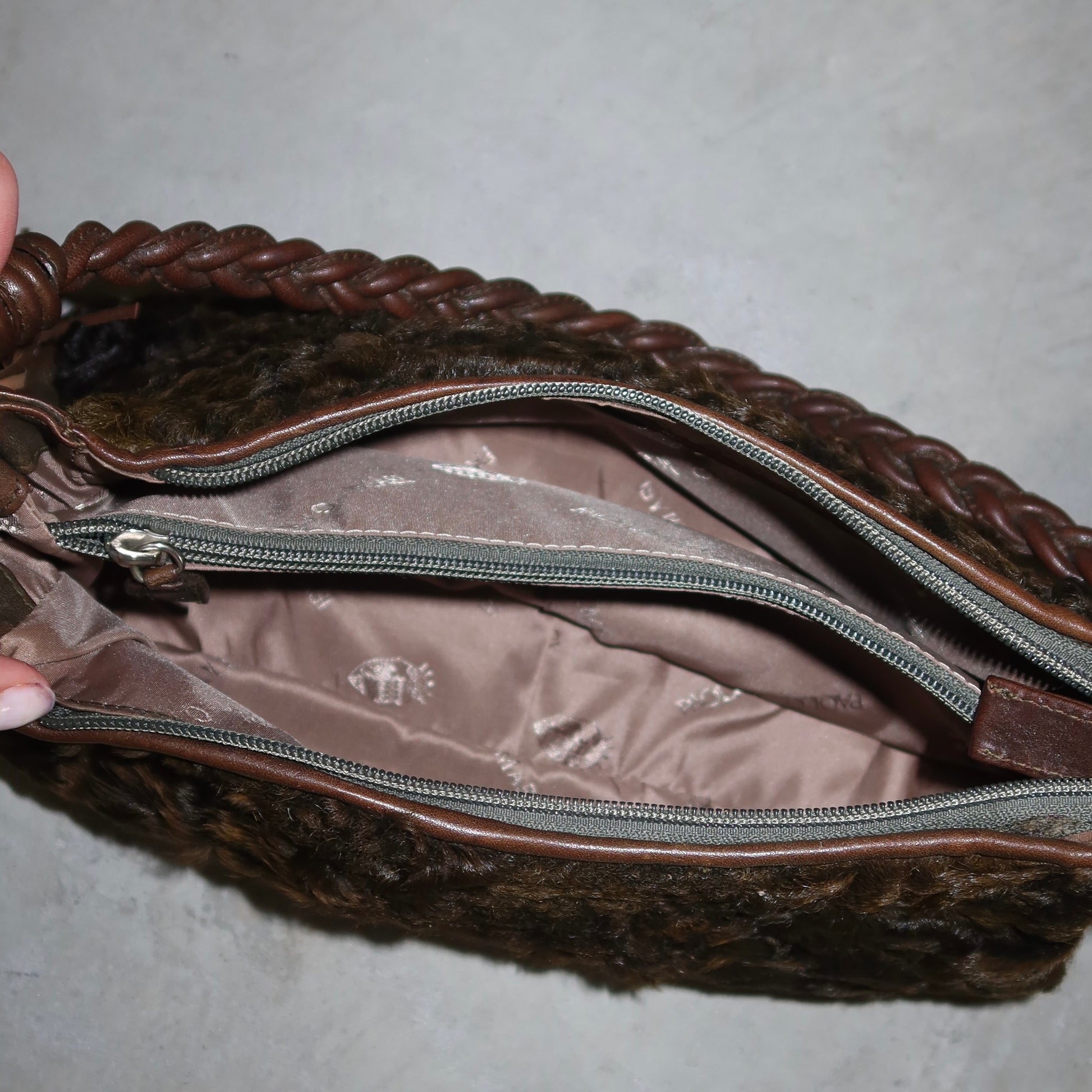 Beautiful Paolo Masi real fur bag. Khaki dyed lamb or sheep fur with brown leather braided handle and tassel details. Made in Italy.