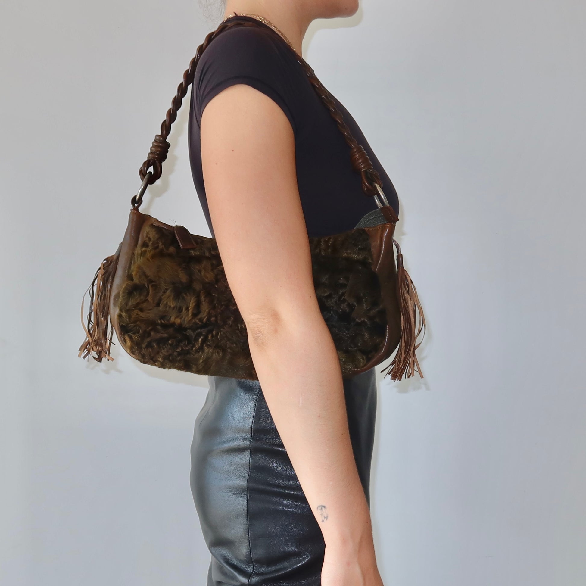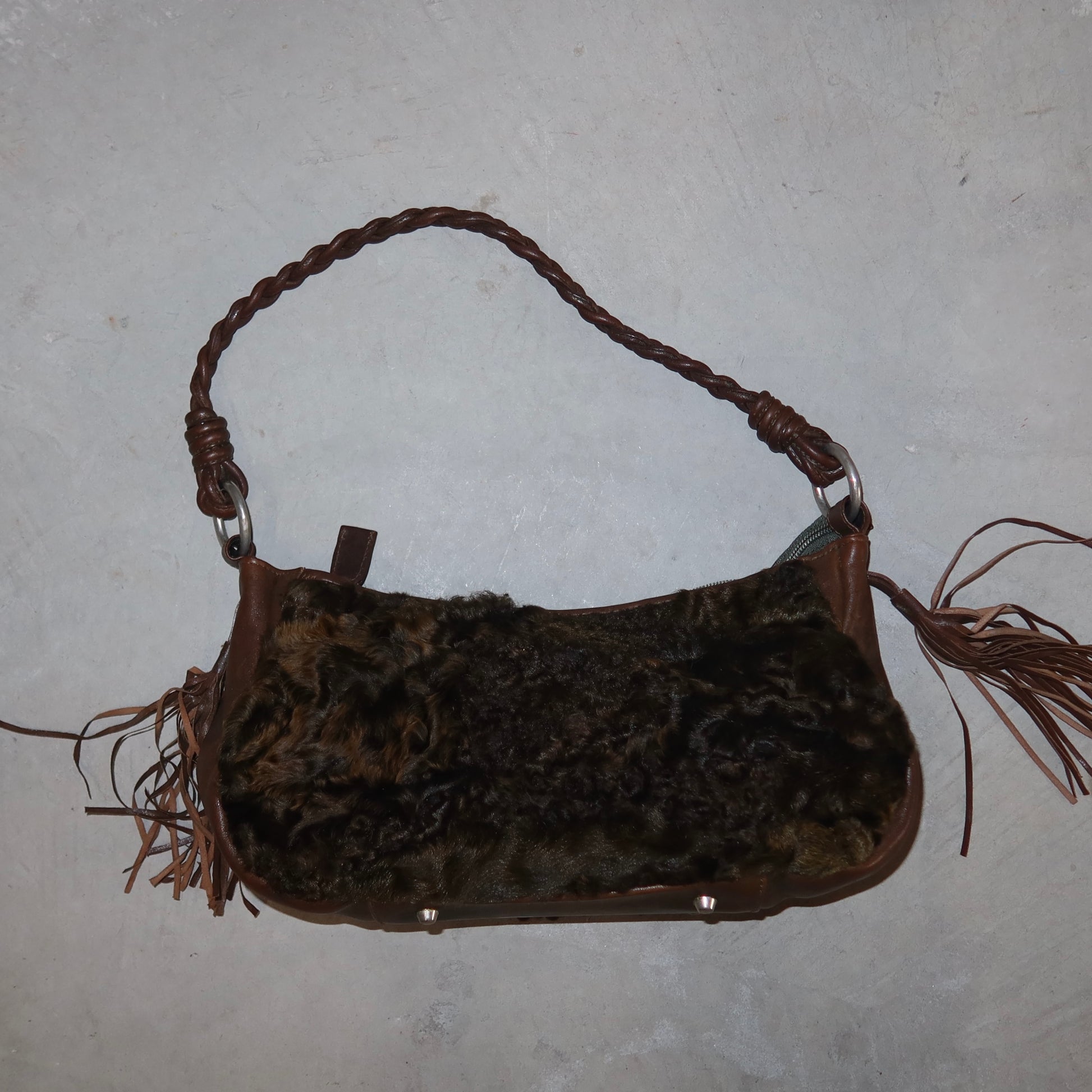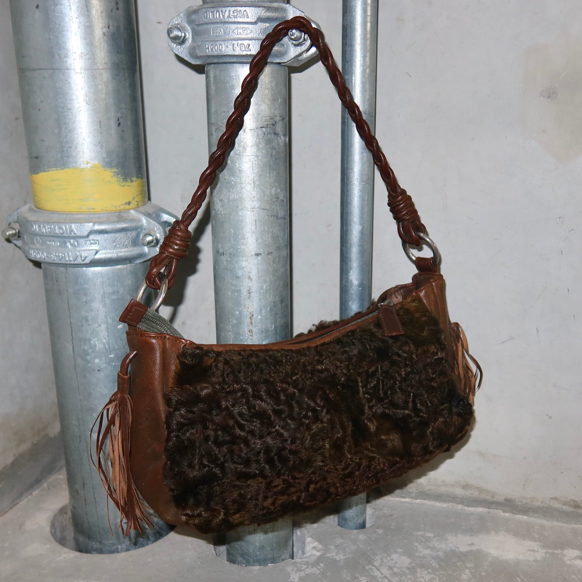 Beautiful Paolo Masi real fur bag. Khaki dyed lamb or sheep fur with brown leather braided handle and tassel details. Made in Italy.
