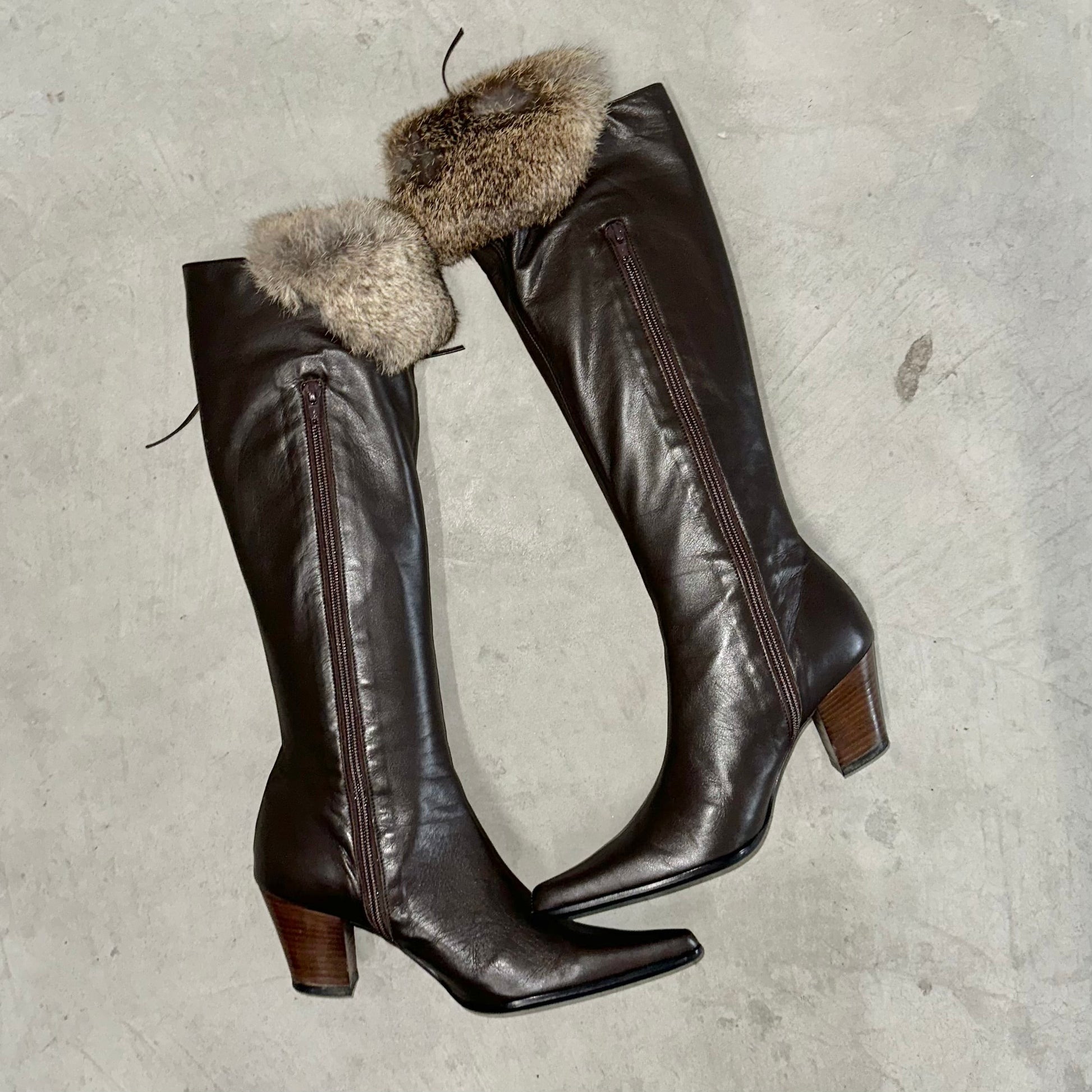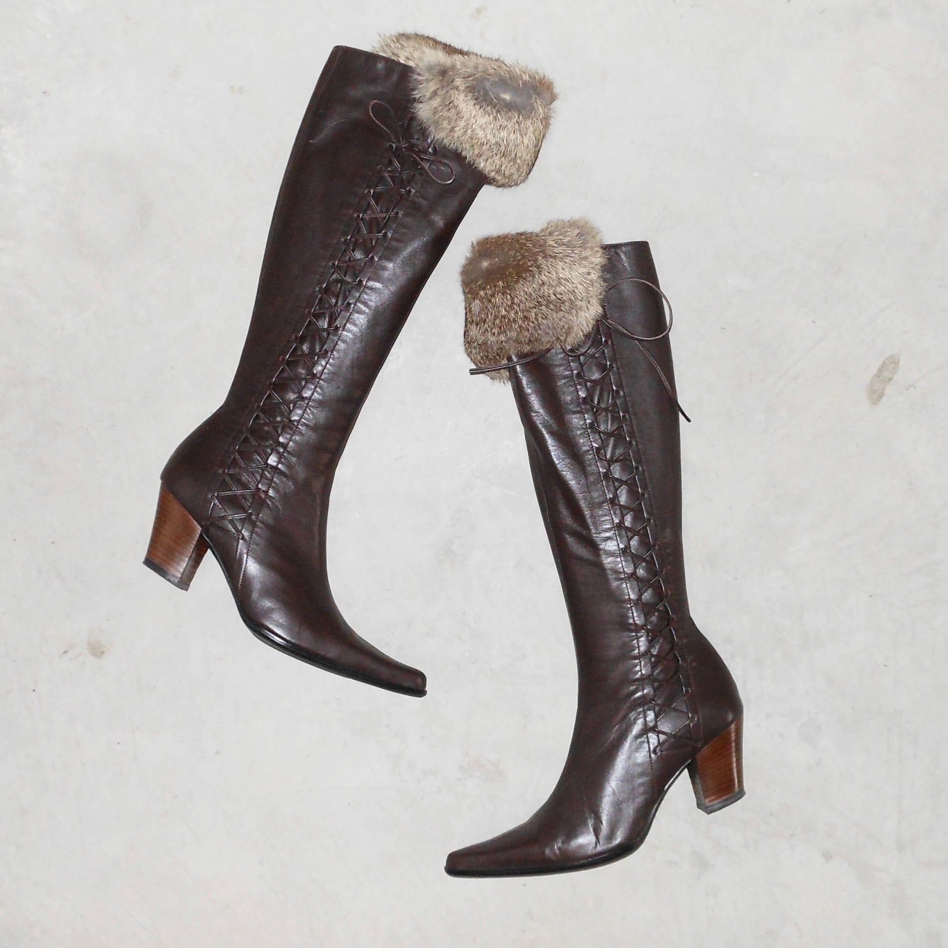 Gorgeous vintage brown leather boots with lace up detail and rabbit fur cuff. Cuban heel with pointed toe.