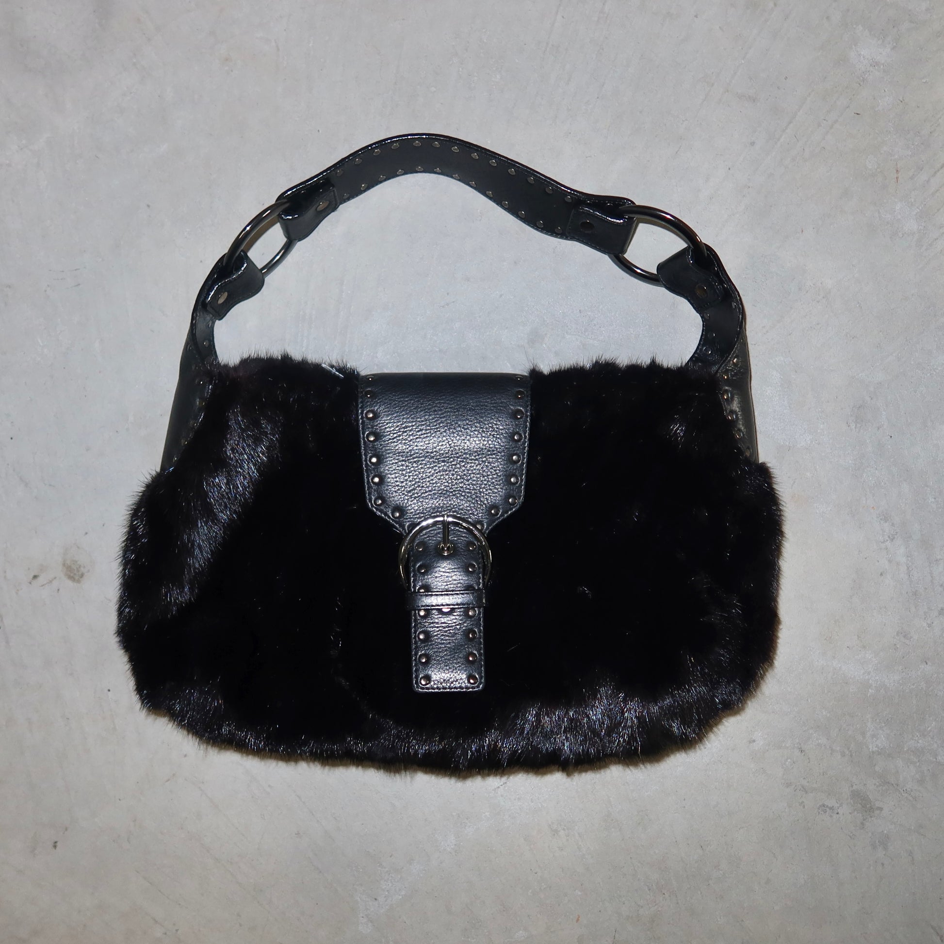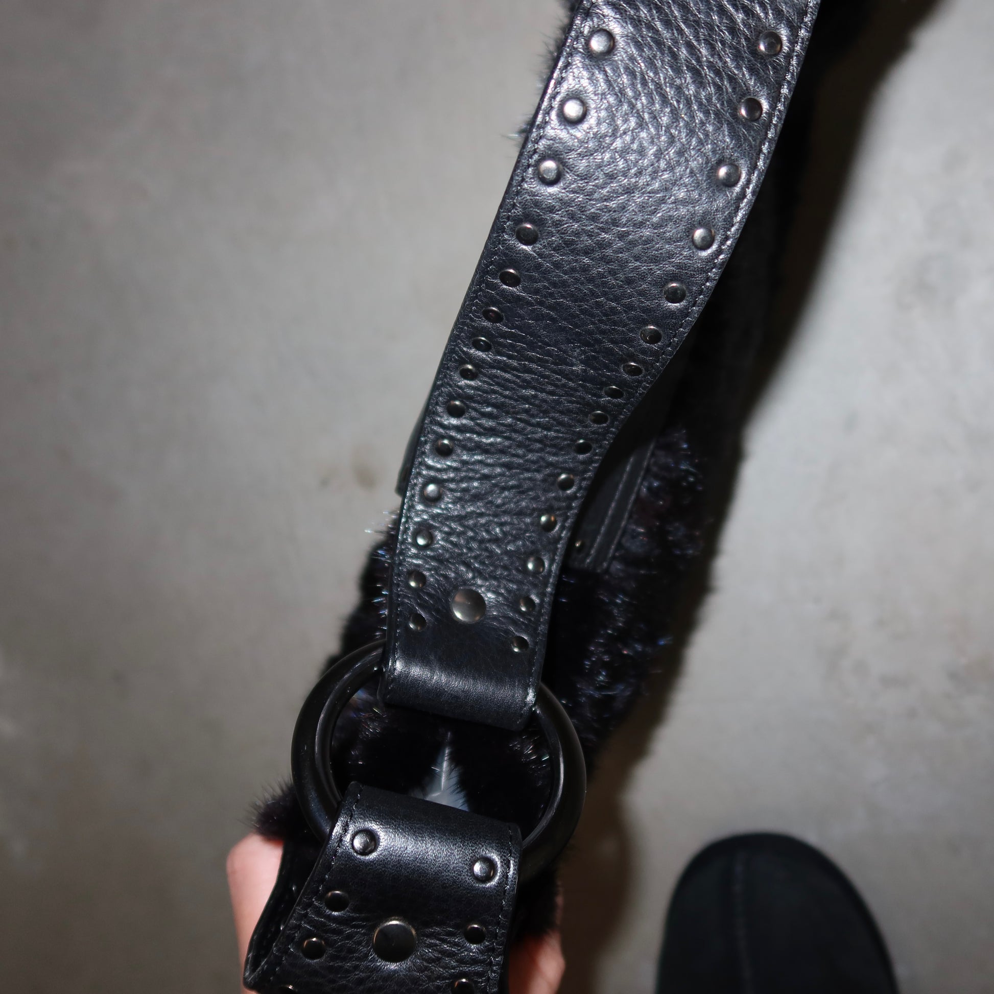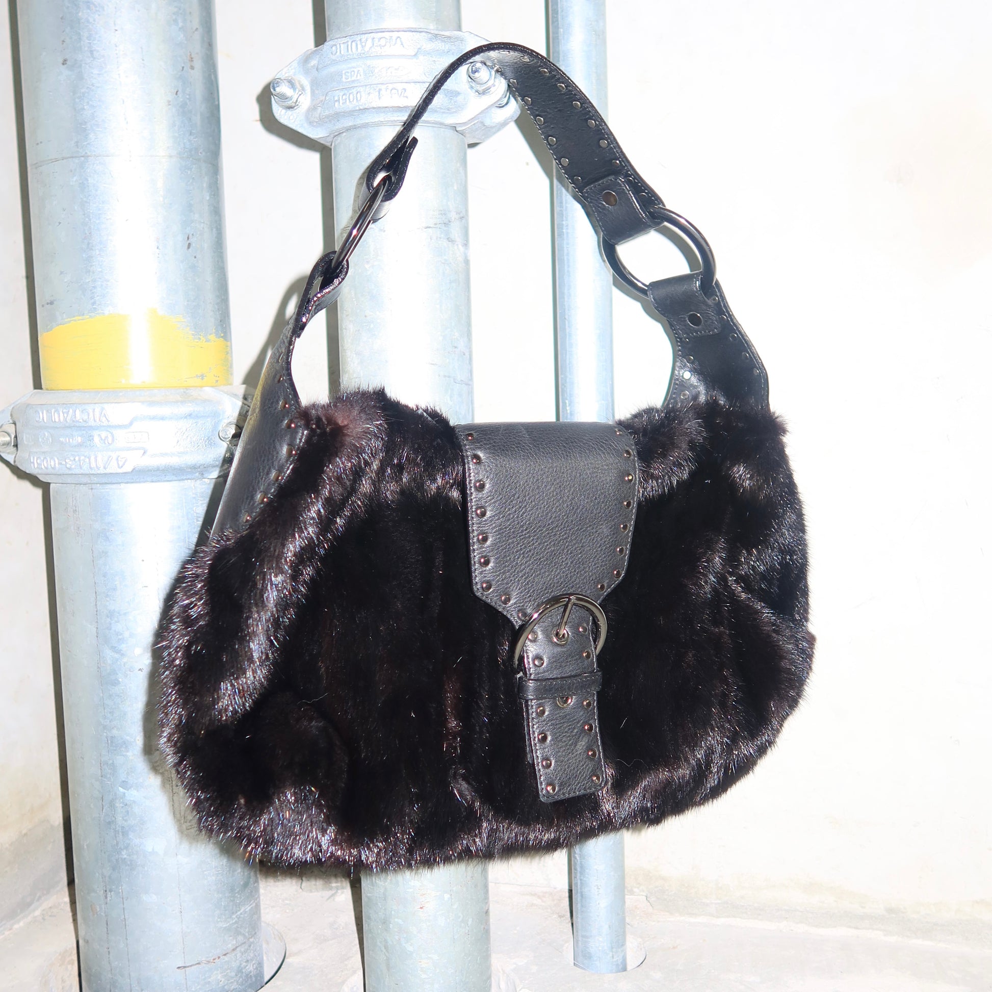 Gorgeous black leather and real mink fur bag with brass stud details.