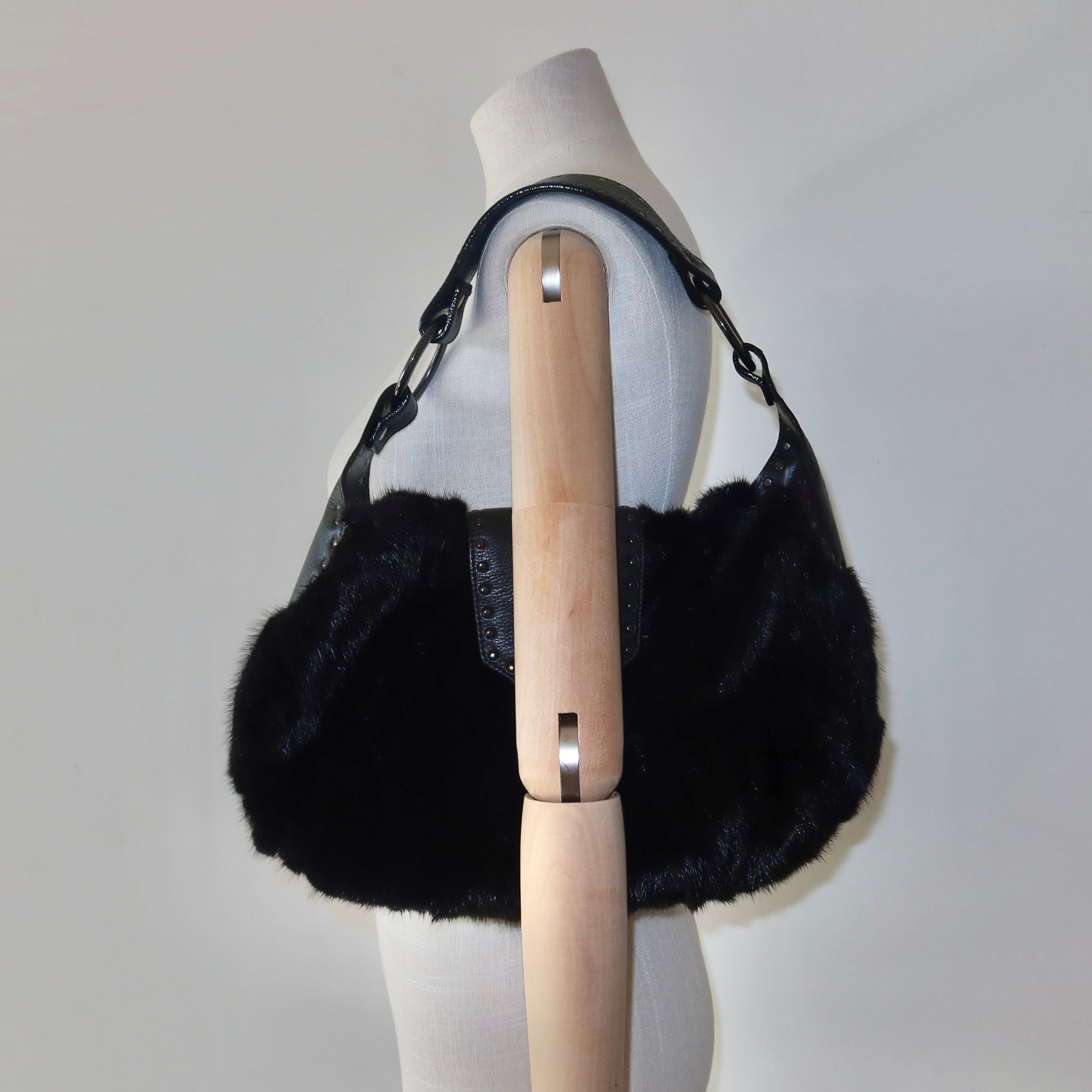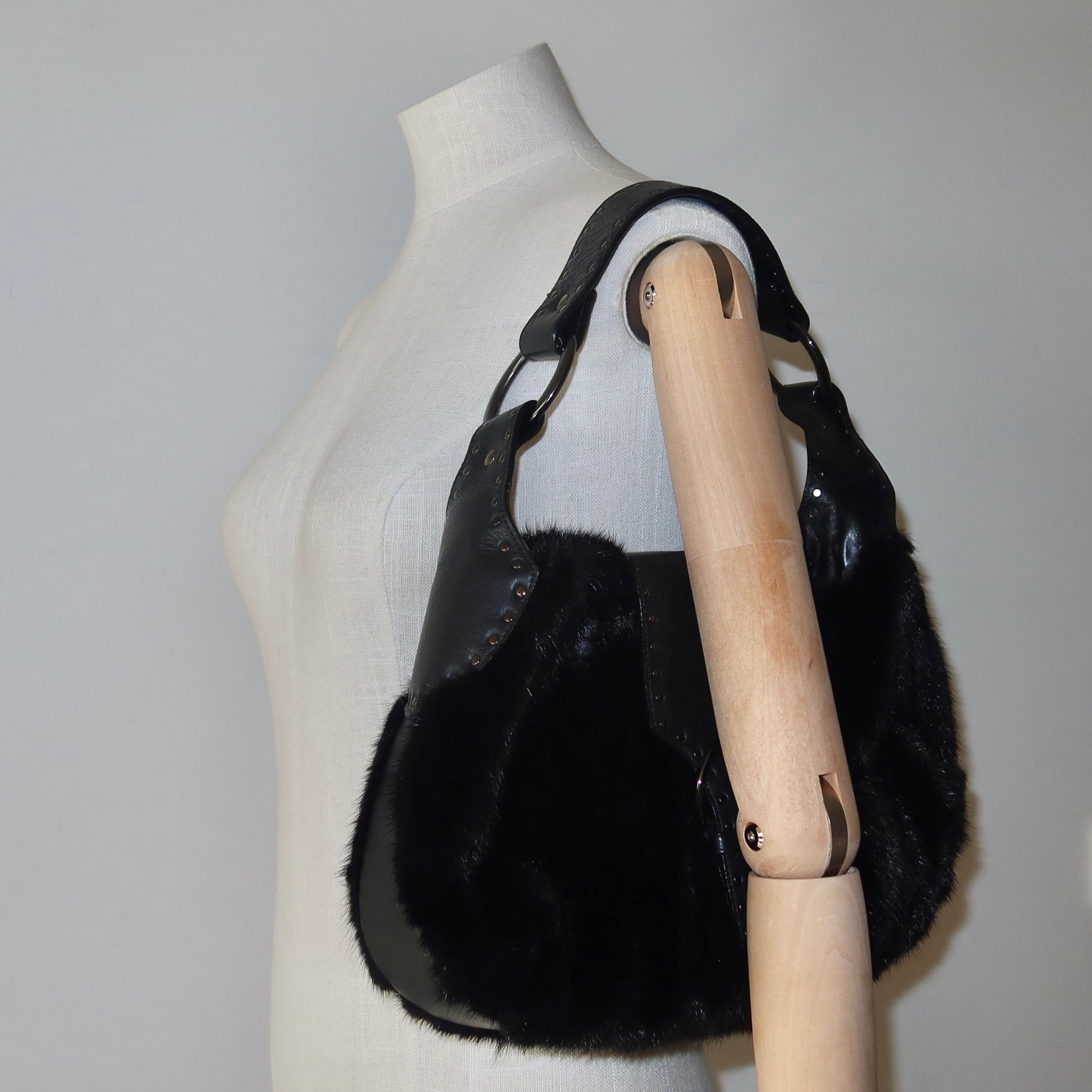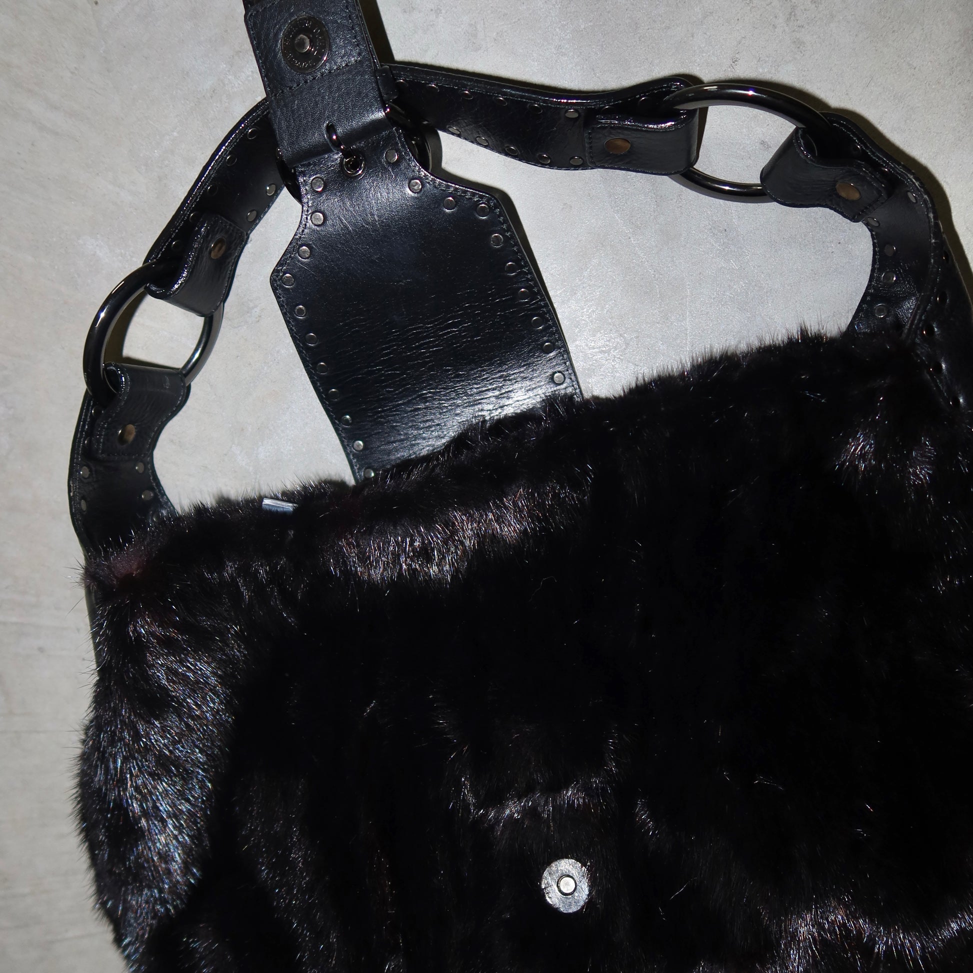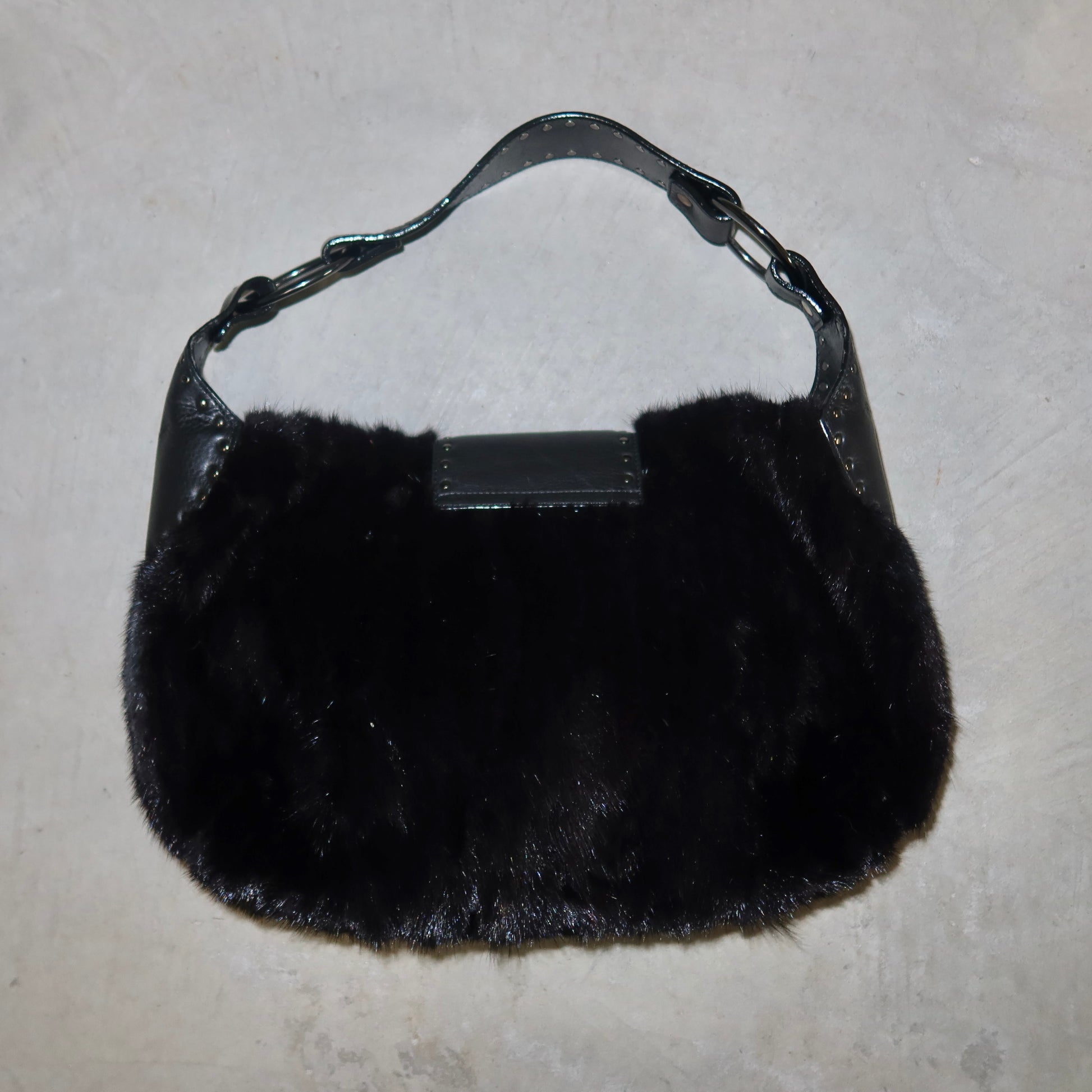 Gorgeous black leather and real mink fur bag with brass stud details.