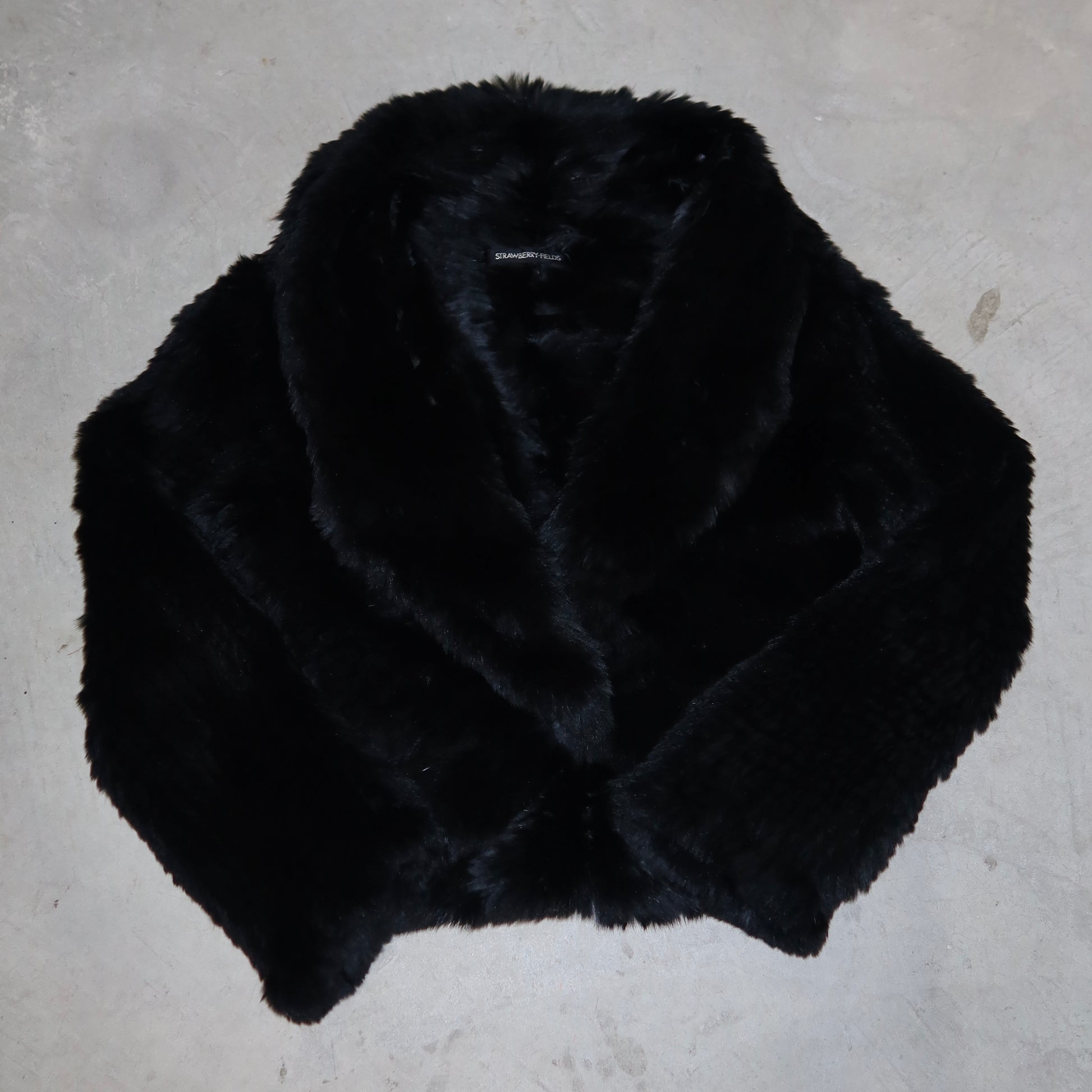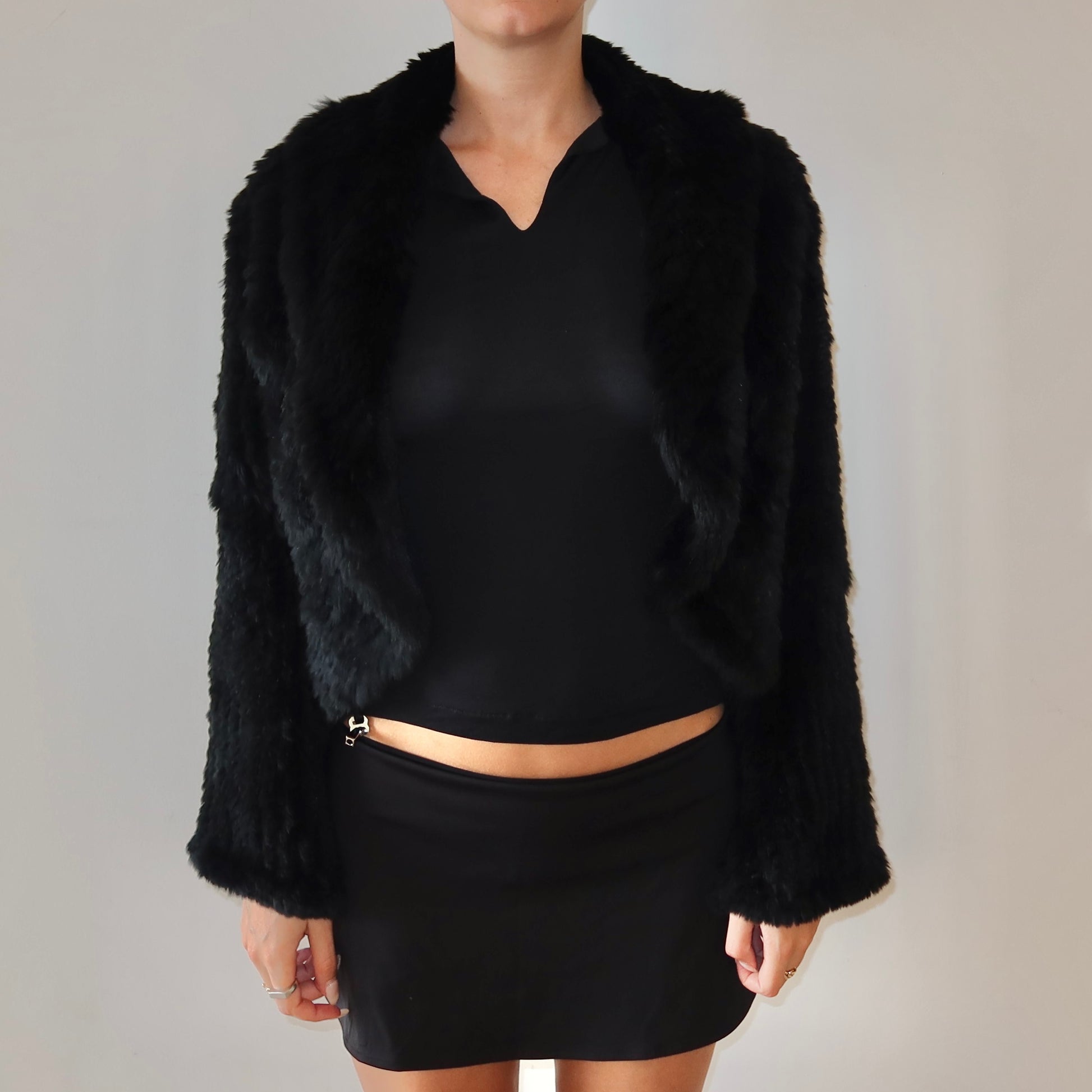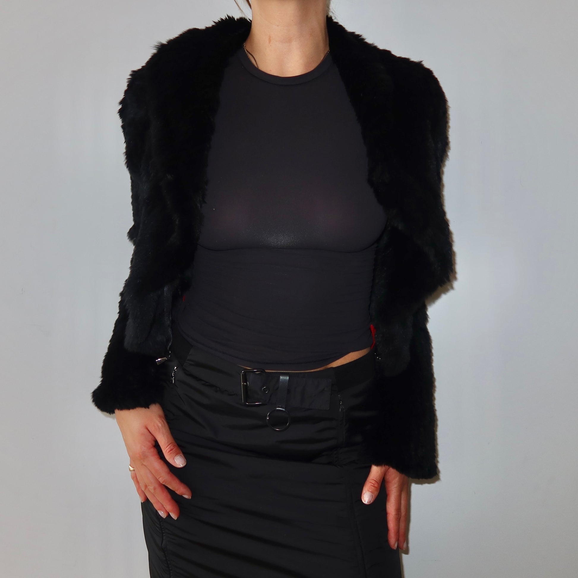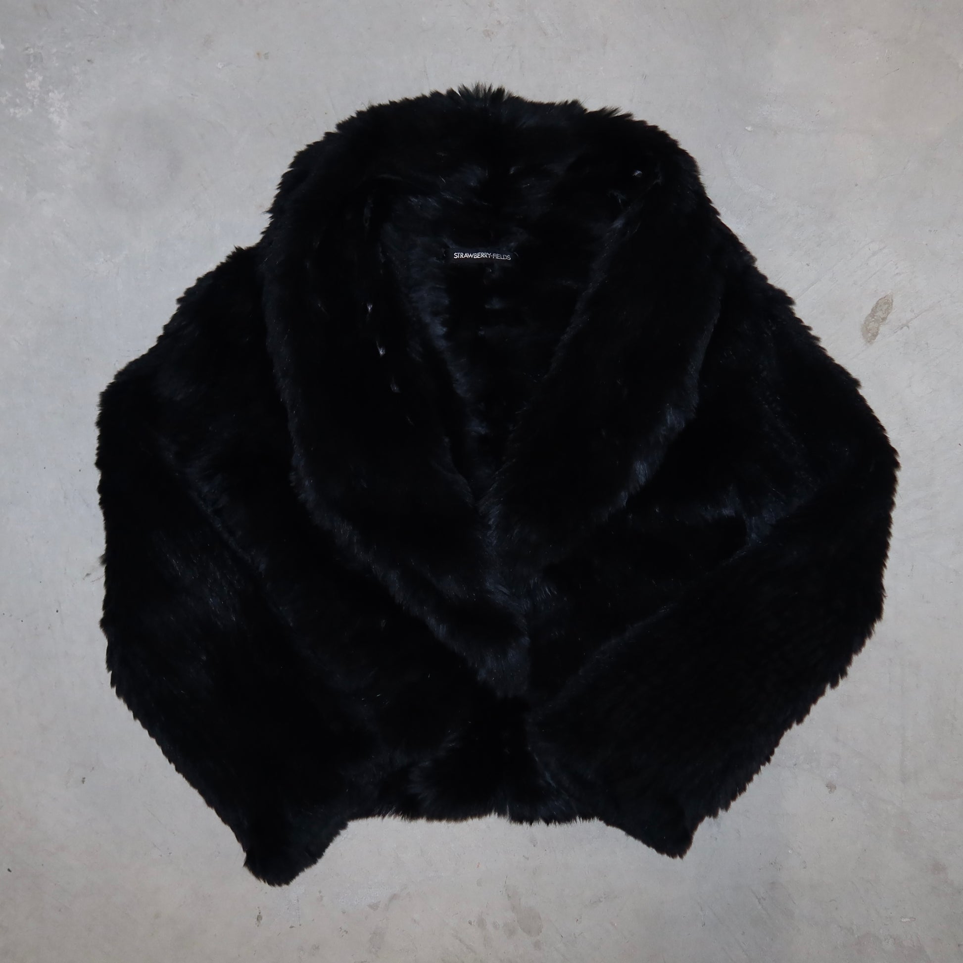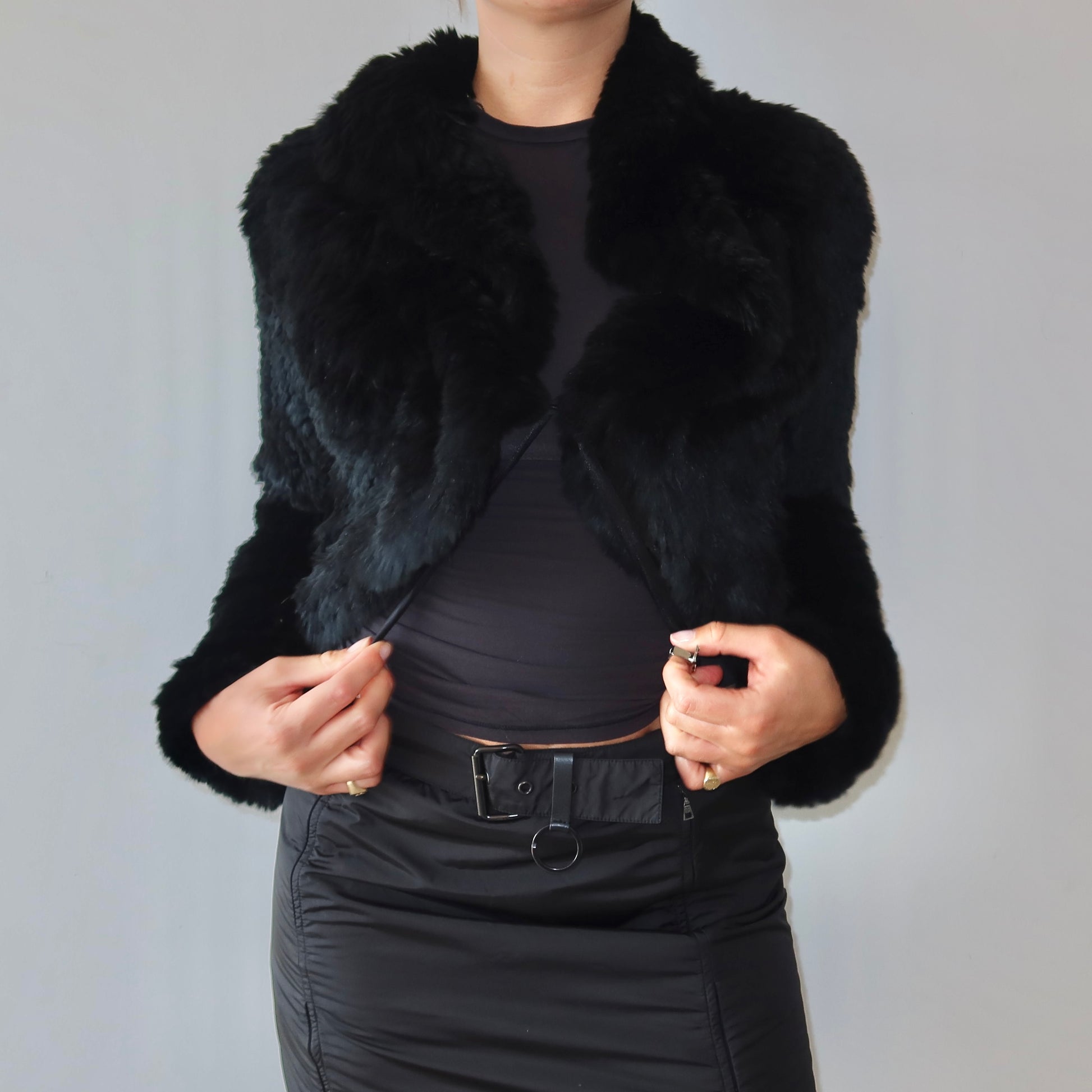 The softest real rabbit fur cardigan in black. Satin string ties to fasten.