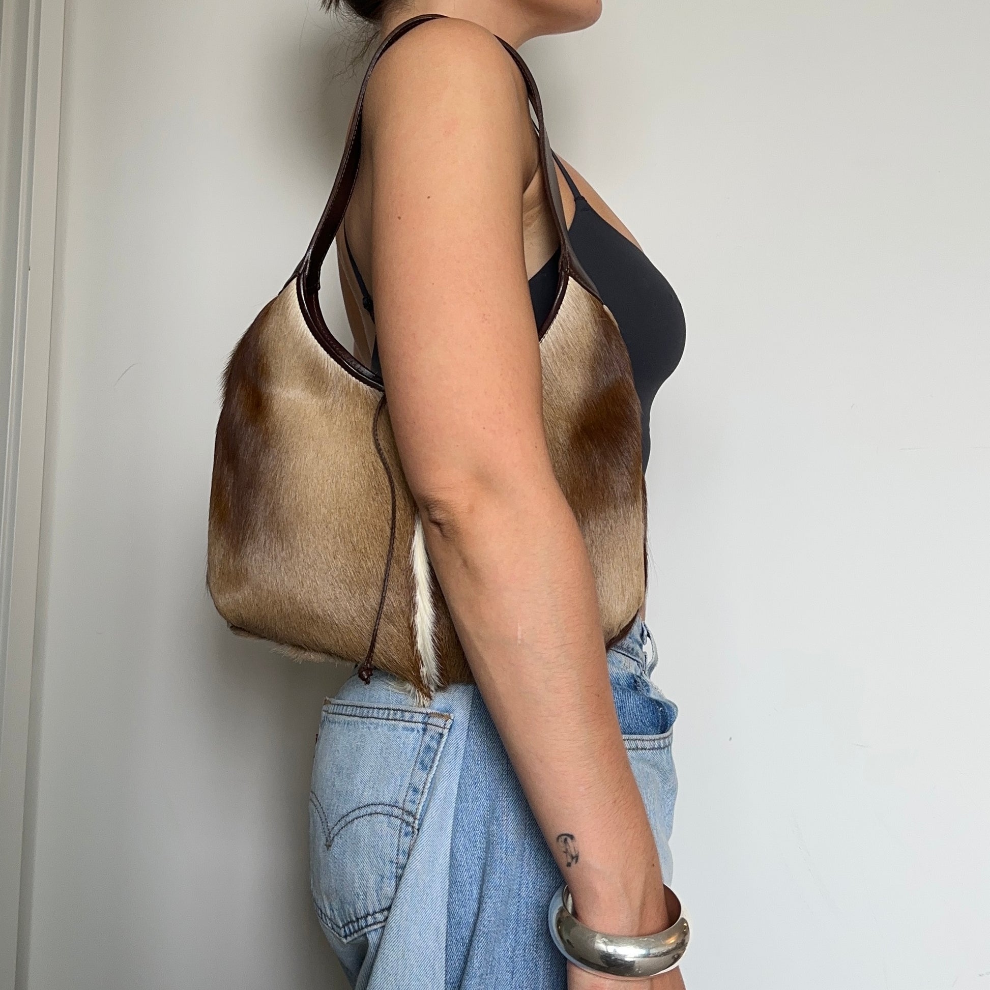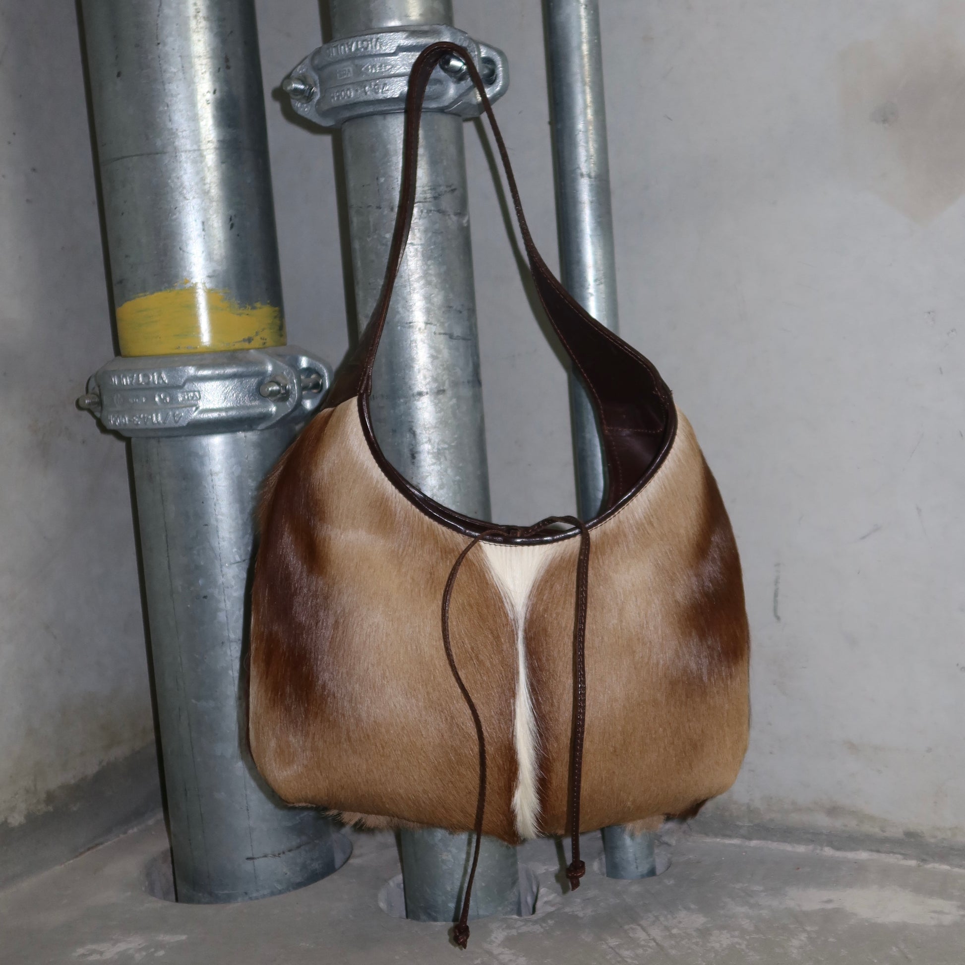 Insane real fur mini hobo shoulder bag. This is either gazelle or springbok fur. Super cute with three inner compartments and a leather tie closure.