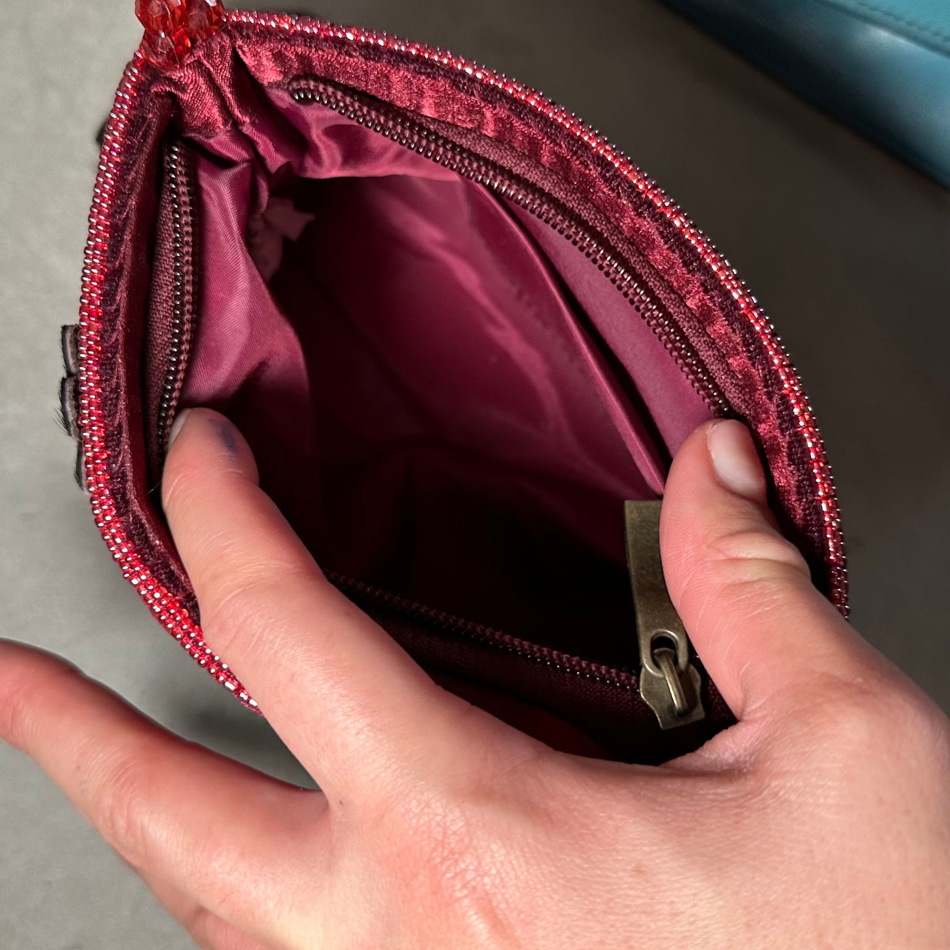 Amazing little ruby red velvet bag. Beaded with cowhide flower attachments.