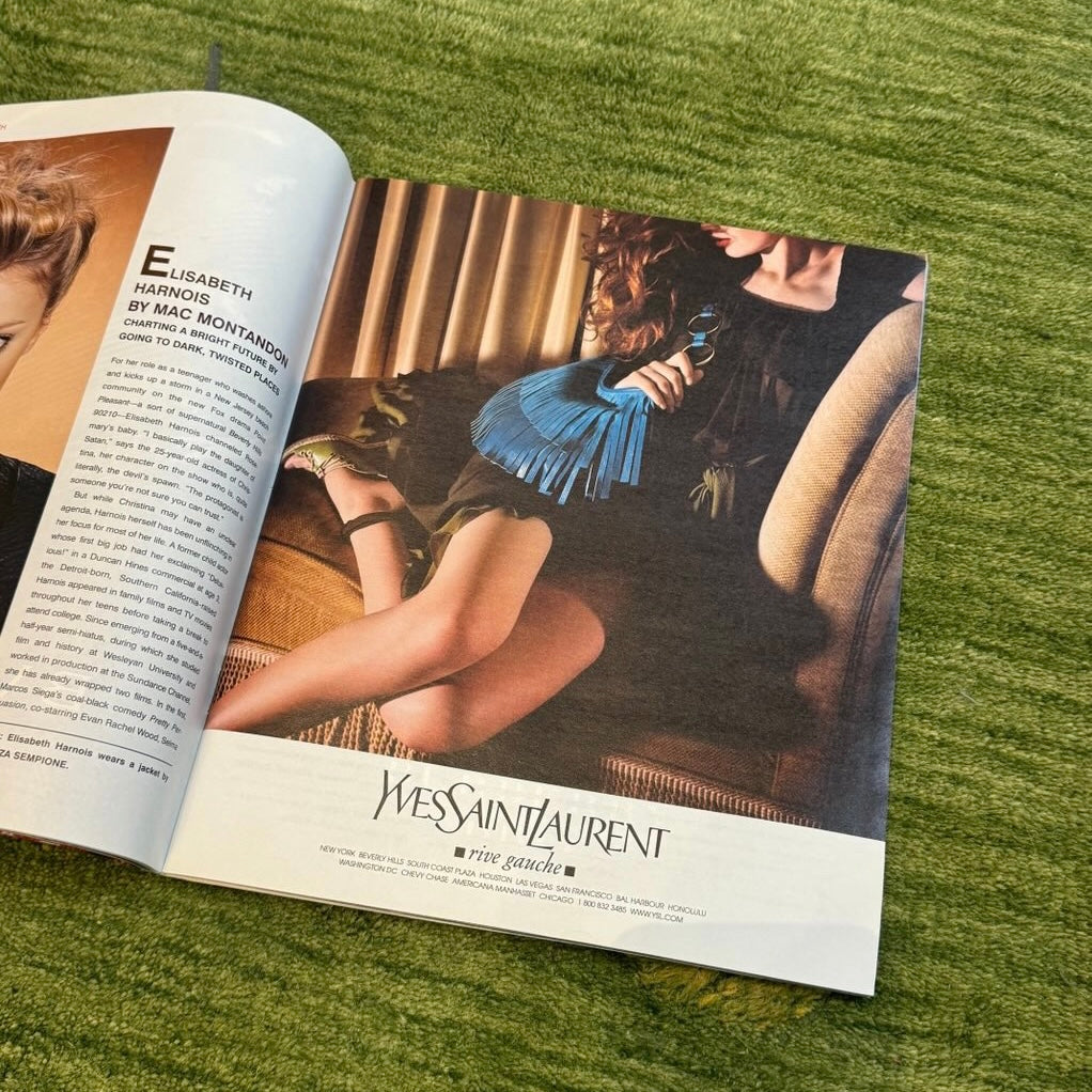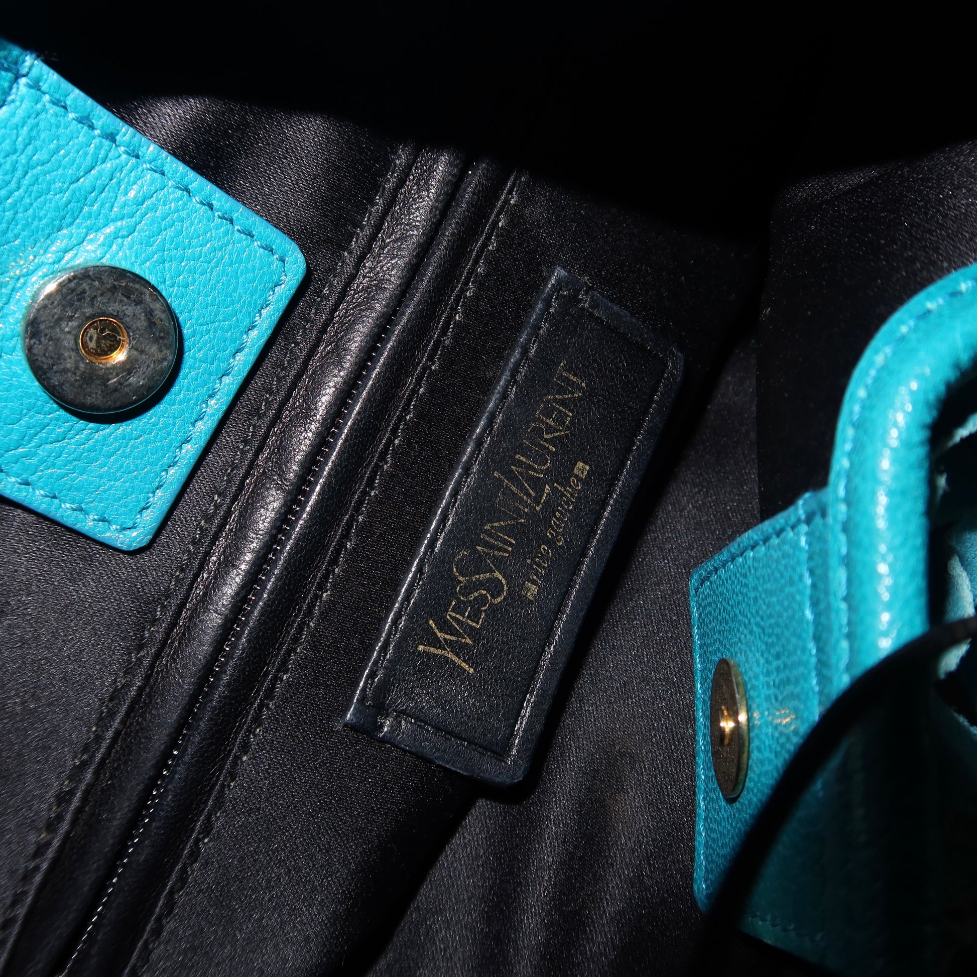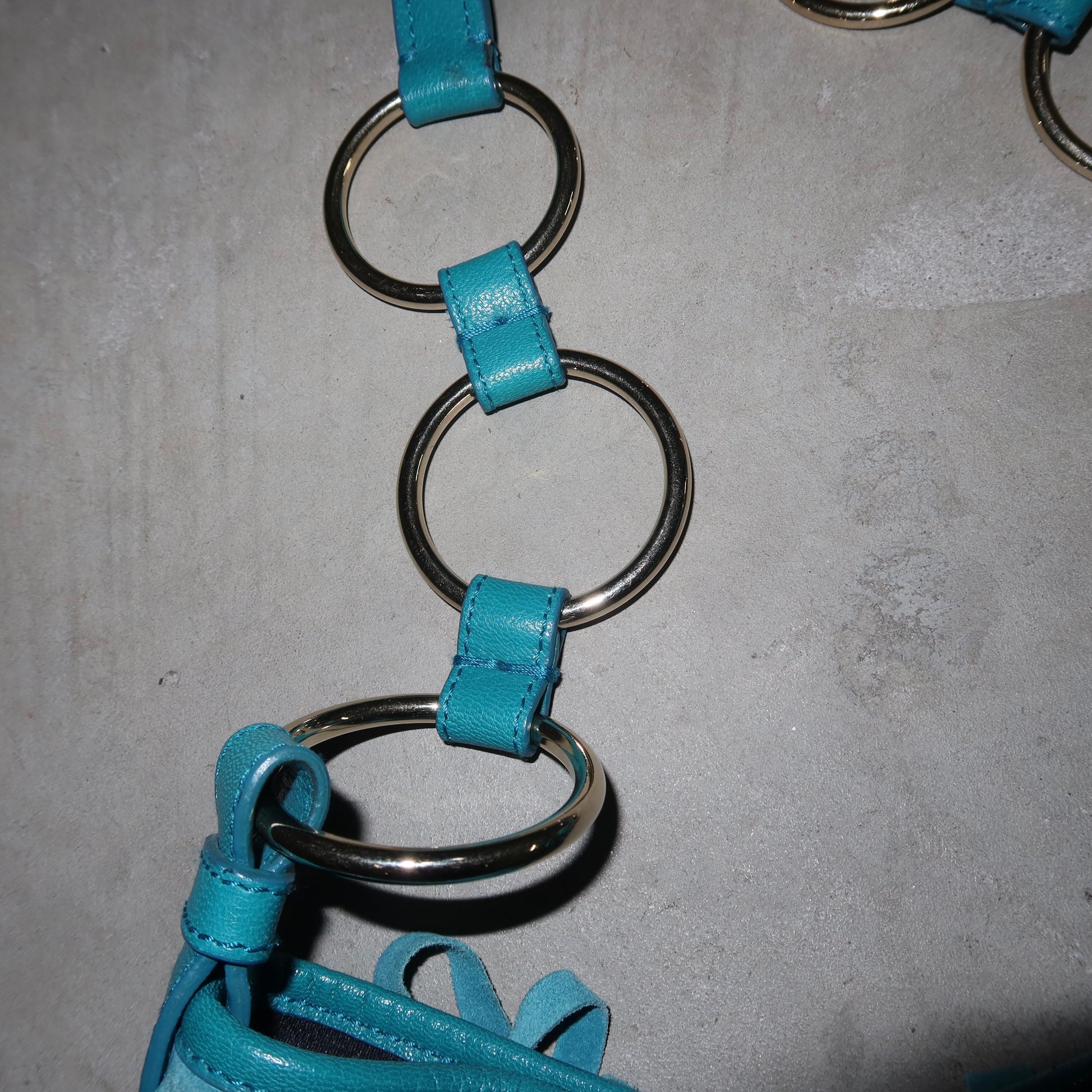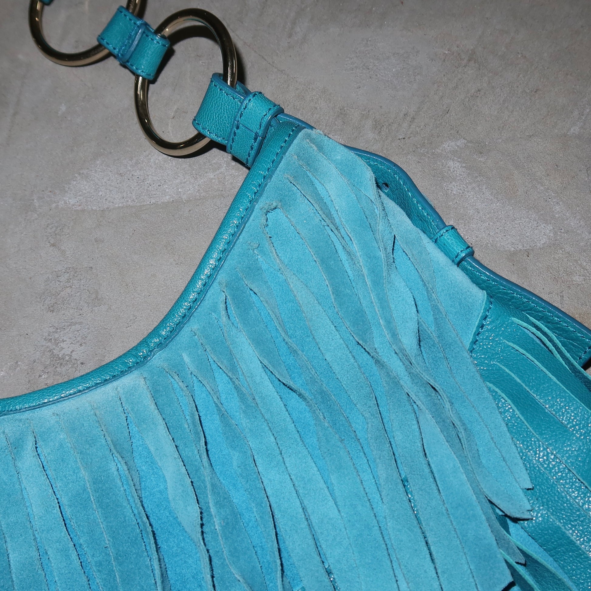 Insane Tom Ford era YSL Rive Gauche blue suede and leather fringe bag with gold ring hardware handle. Such an iconic piece. Sported by Kate Moss in white. Final picture from our friends at Reservations Vintage!