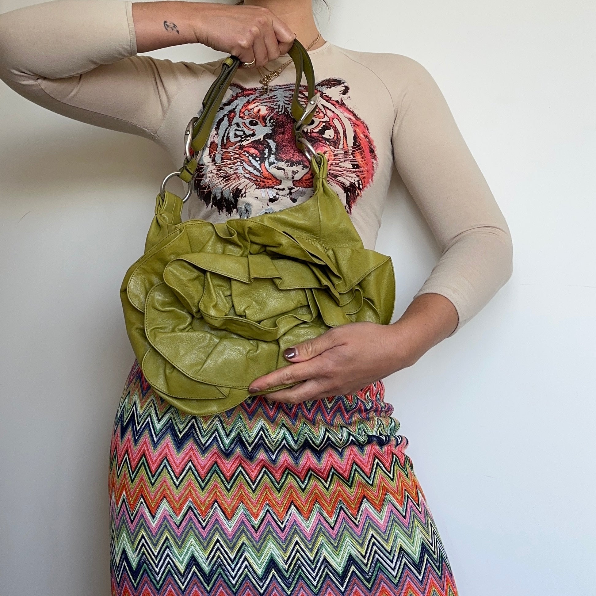 Stunning rare green leather YSL by Tom Ford 'Nadja' bag. Famous for their large 3-D rosette detail and chunky handle hardware. This is the classic size.